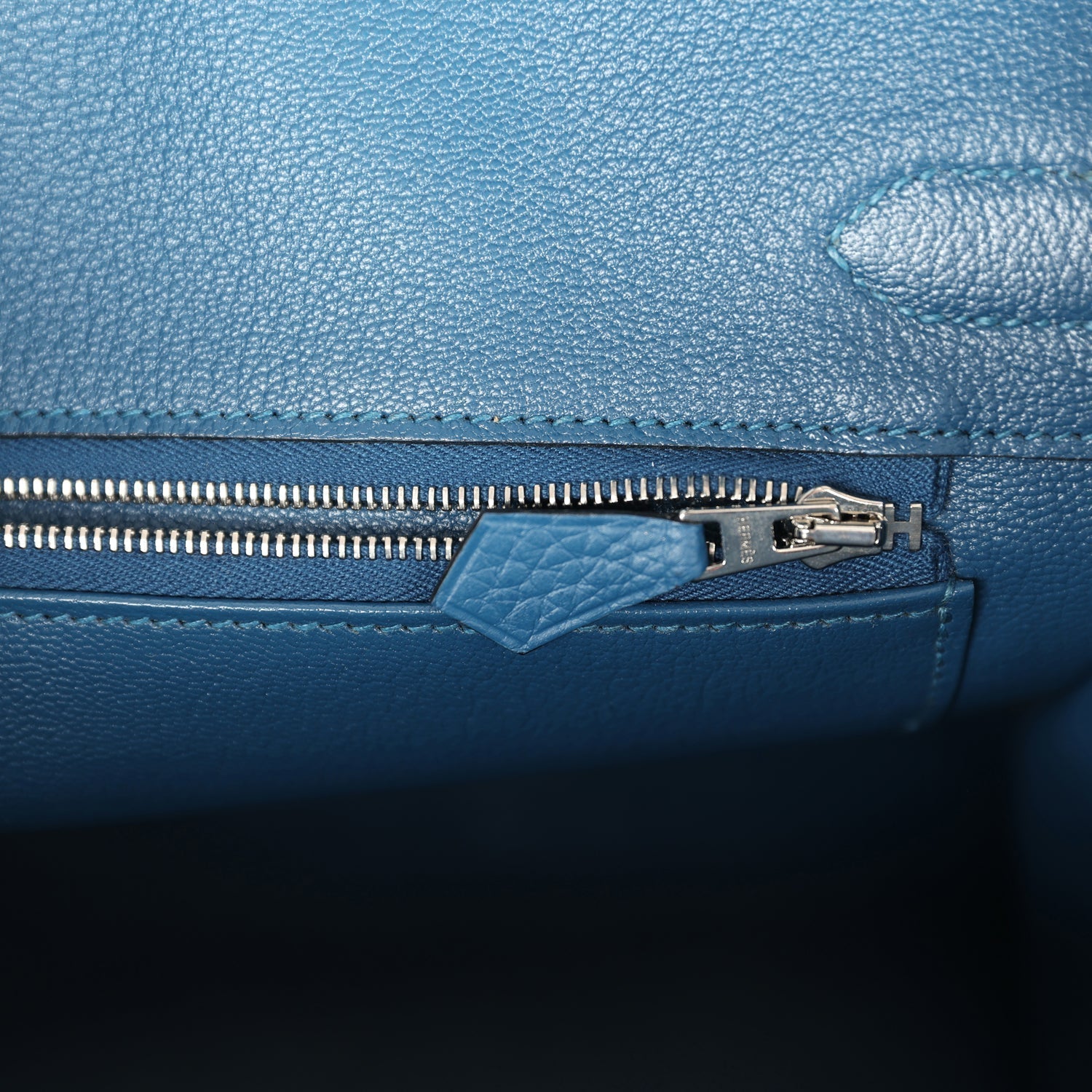The interior is lined with Bleu Thalassa chevre and has one zip pocket with an Hermes engraved zipper pull and an open pocket on the opposite side.