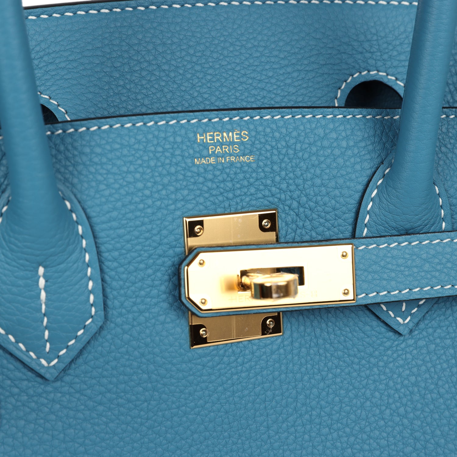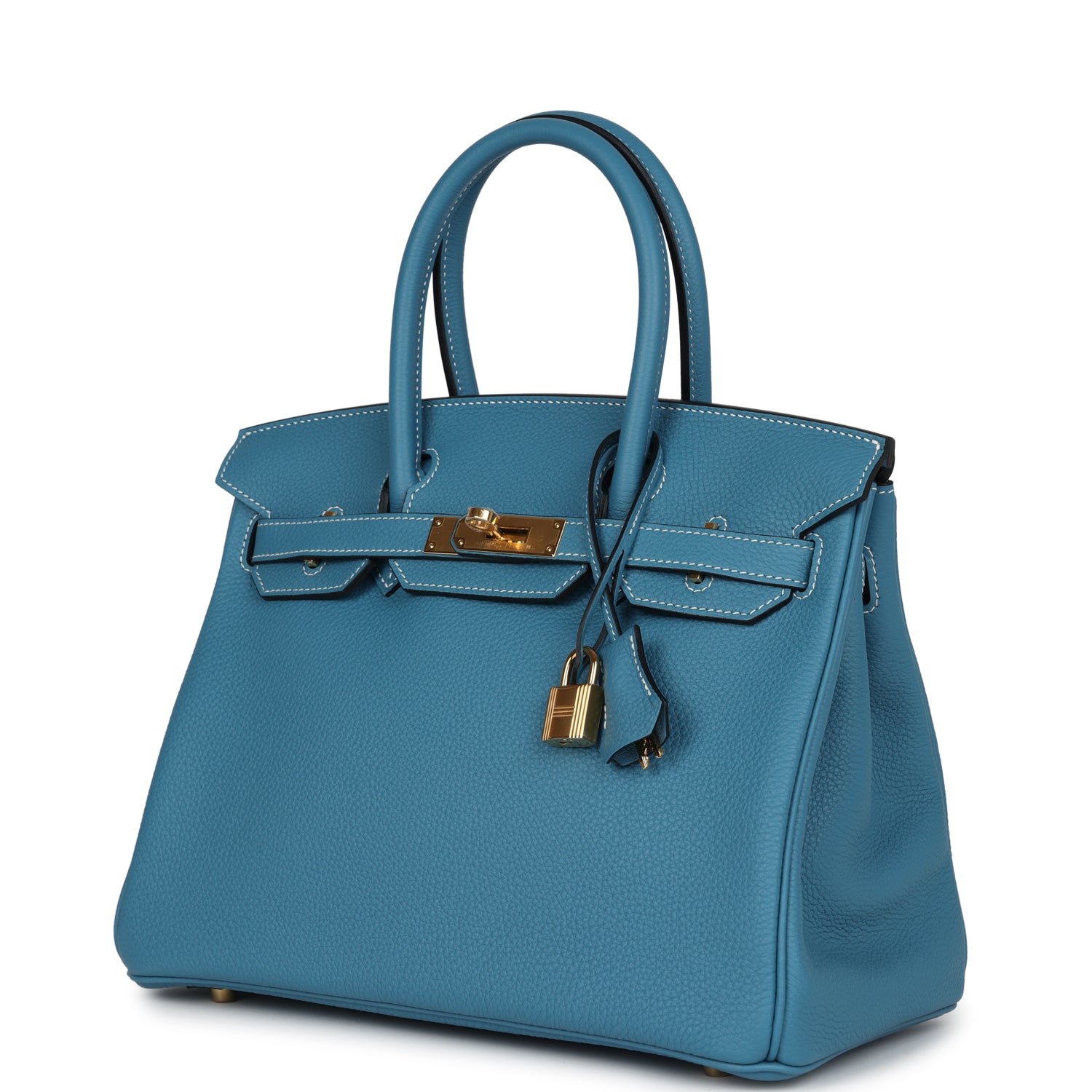 This Birkin is in Blue Jean togo leather with palladium hardware and has white contrast stitching, front flap, two straps with center toggle closure, clochette with lock and two keys, and double rolled handles.
