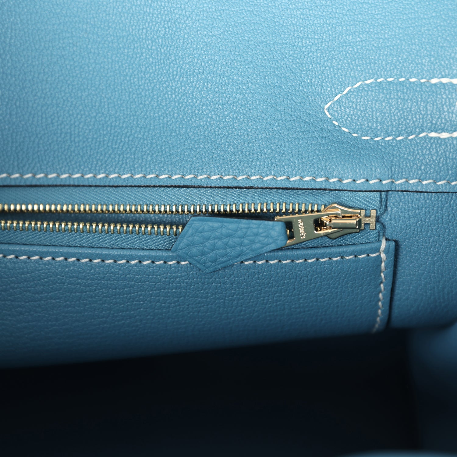 The interior is lined with Blue Jean chevre and has one zip pocket with an Hermes engraved zipper pull and an open pocket on the opposite side.