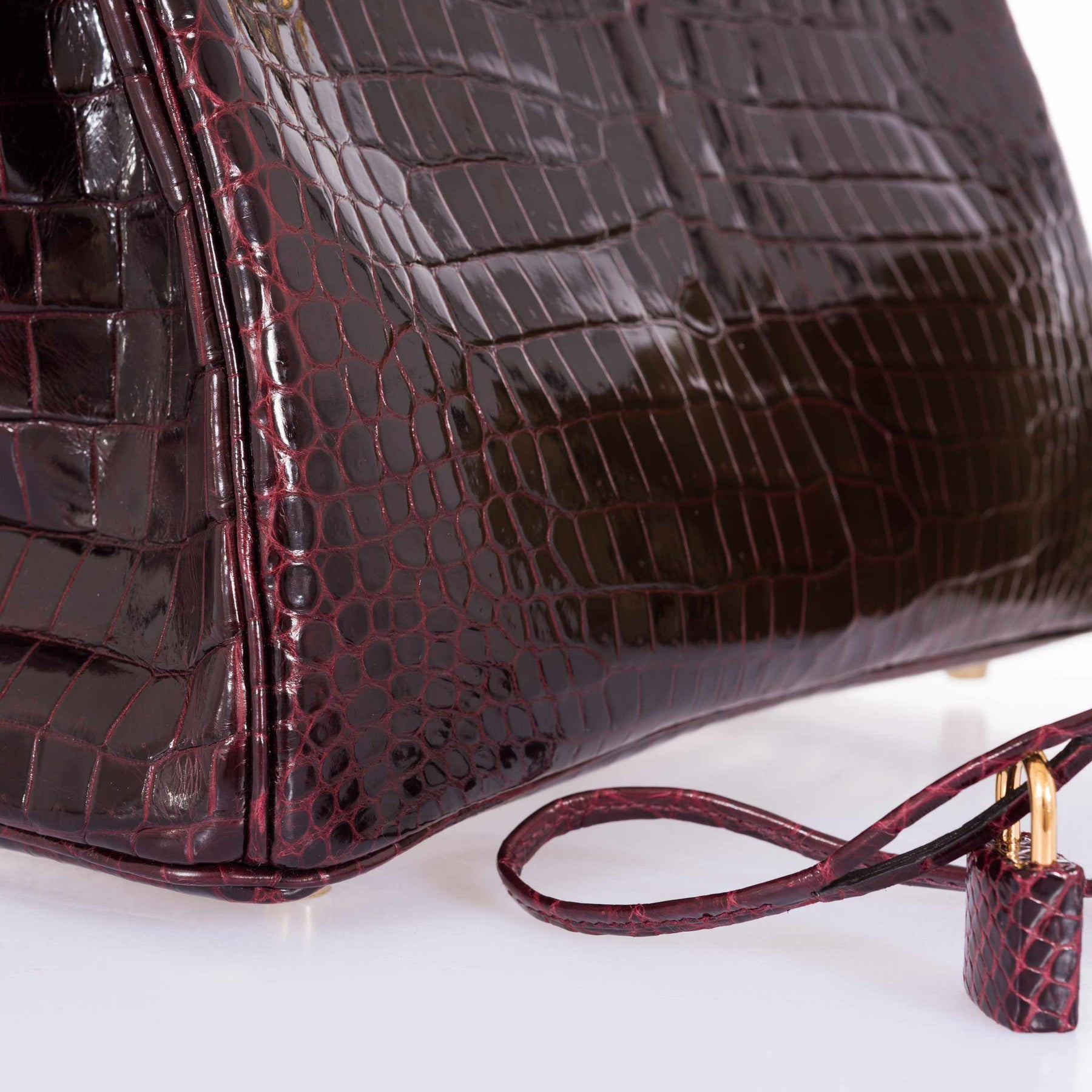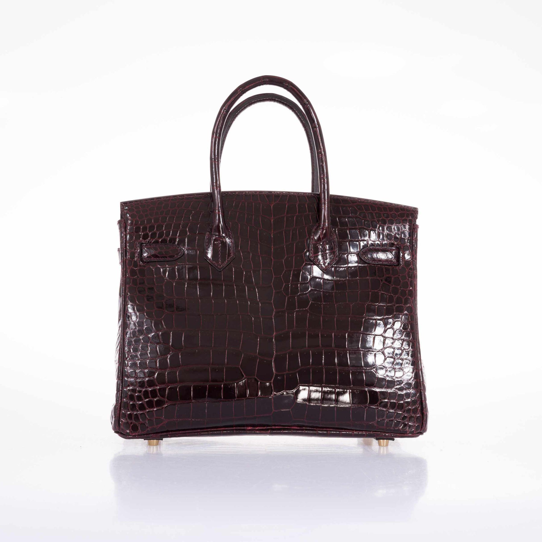 The magnificent and breathtaking Hermès Birkin 30 in the highly coveted Bordeaux Porosus Crocodile accented by Gold Hardware. This is a rare opportunity to own the perfect Hermès in color, size and exotic skin. Spectacular in every way, this is the pinnacle of Hermès exclusivity and a bag that is in Jane's personal collection. Collectors, celebrities and socialites are all drawn by the perfect croc scales and the luscious wine, brown and purple shades in this ultra-rich and luxurious Birkin.