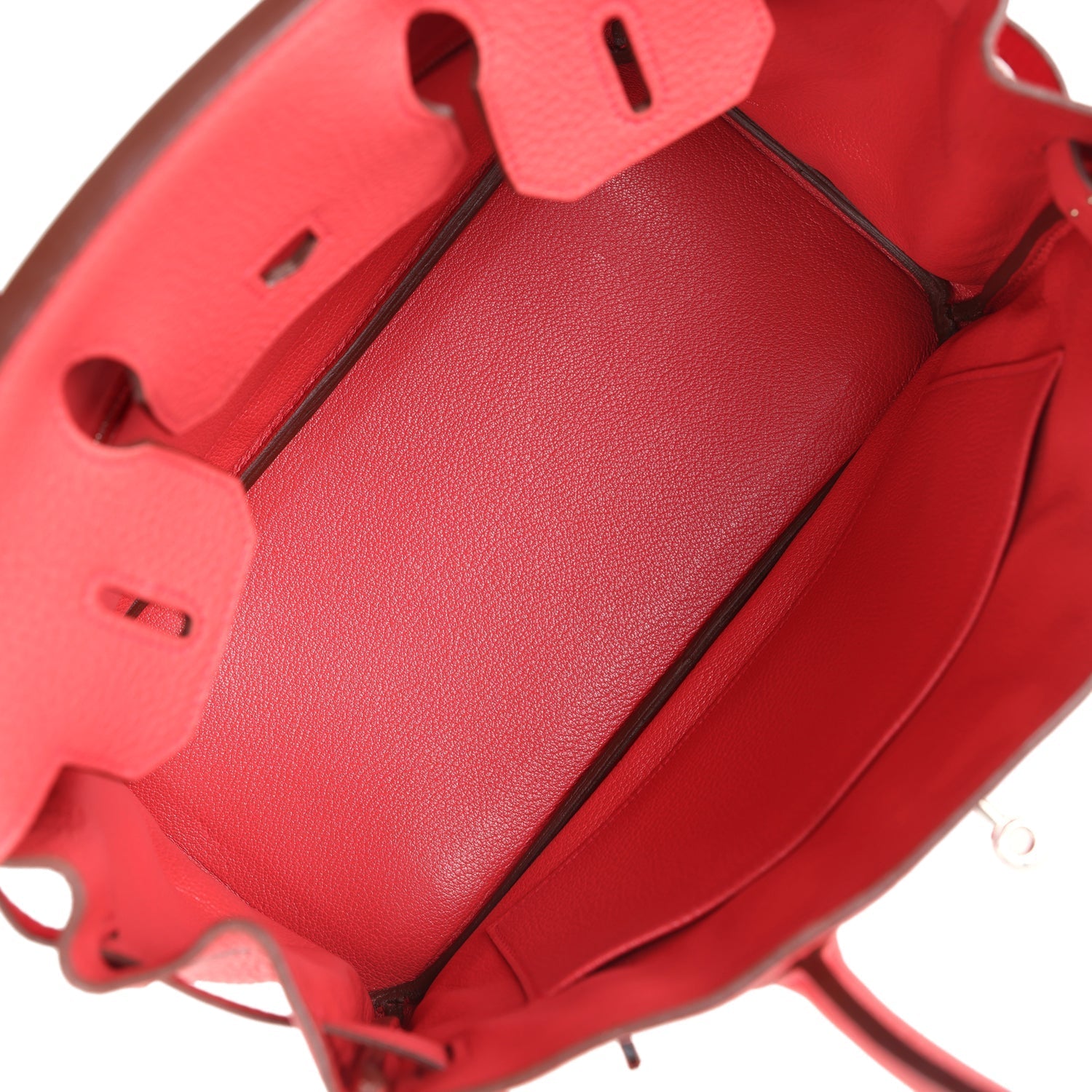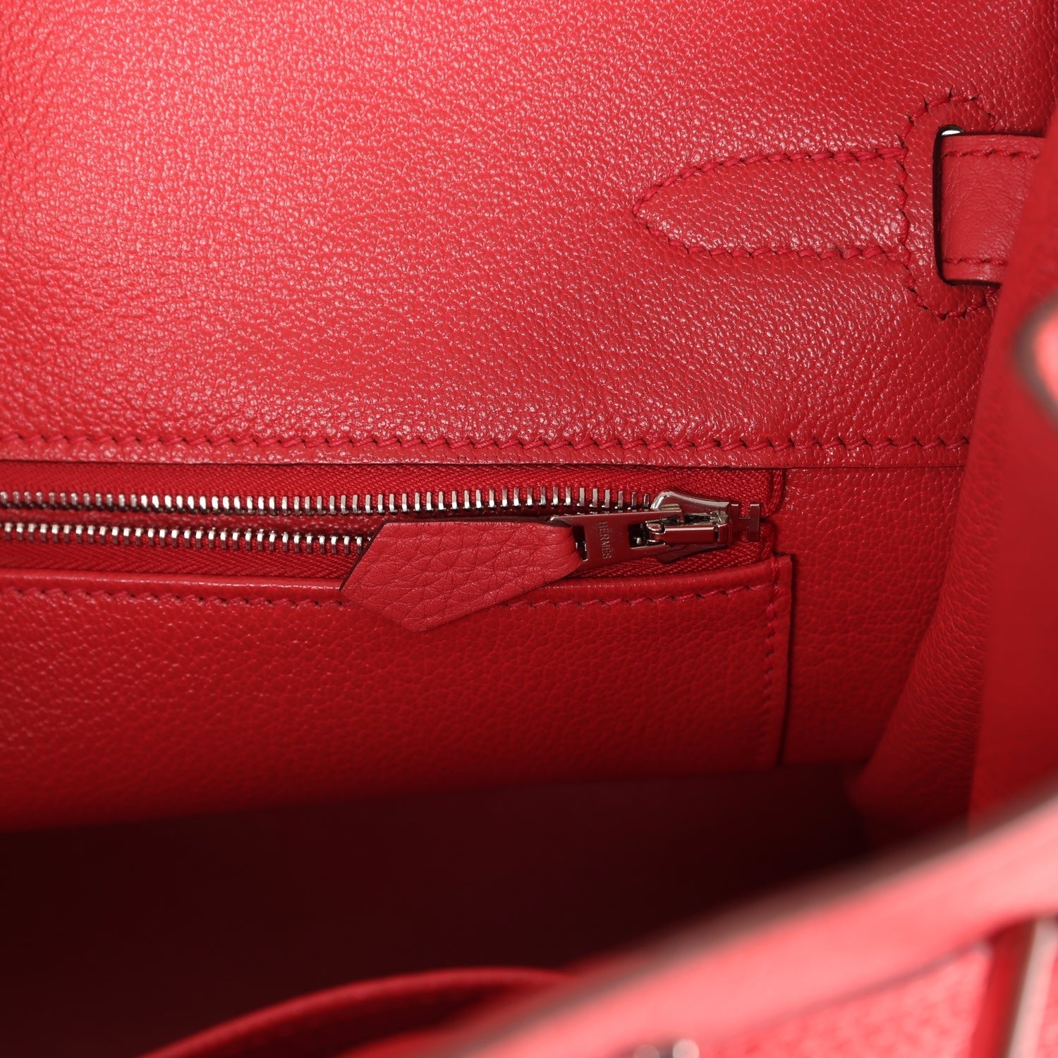 The interior is lined in Bougainvillea chevre leather and has one zip pocket with Hermes engraved pull; pocket on opposite side.
