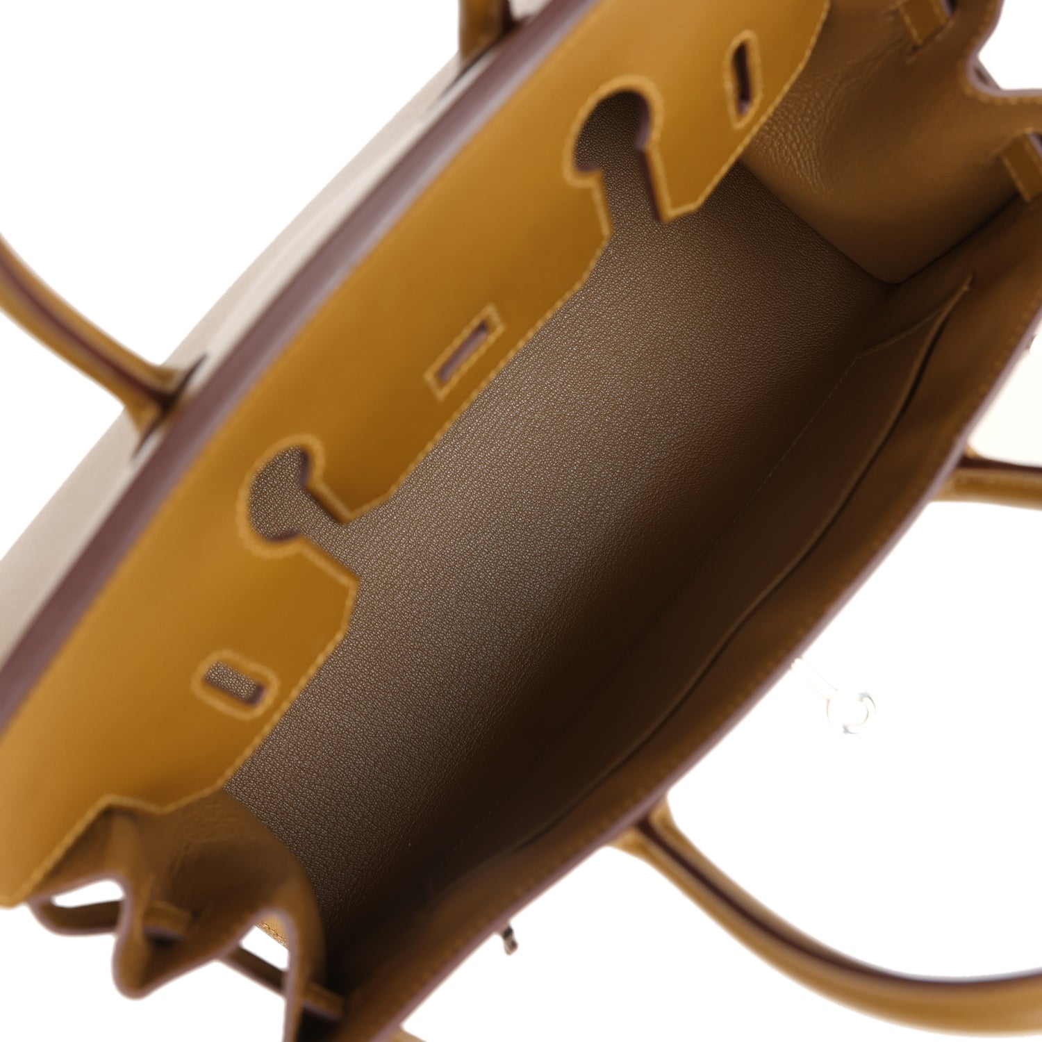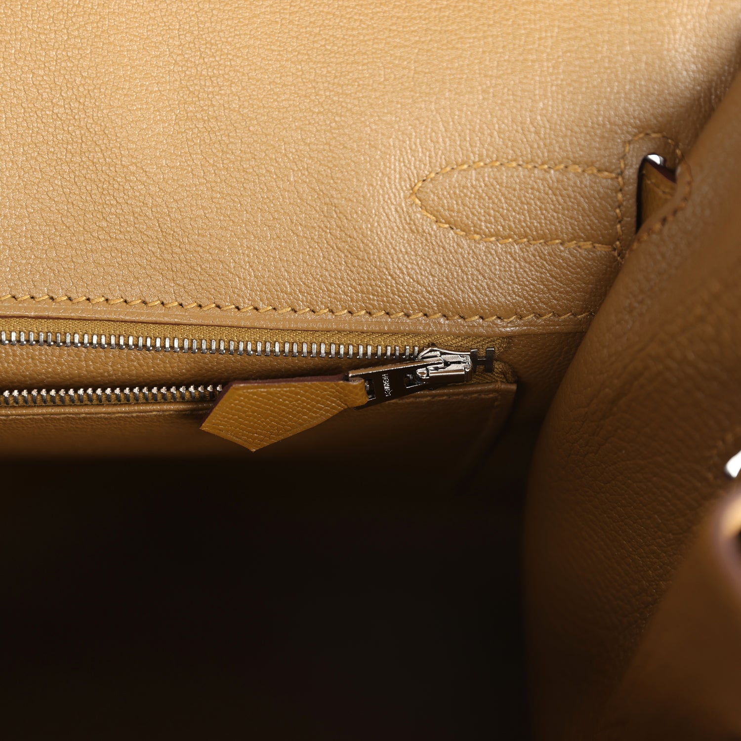 The interior is lined with Bronze Dore chevre and has one zip pocket with an Hermes engraved zipper pull and an open pocket on the opposite side.