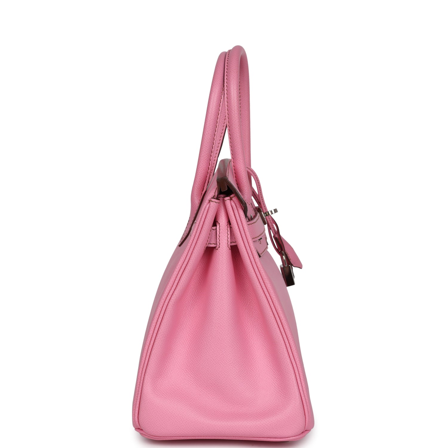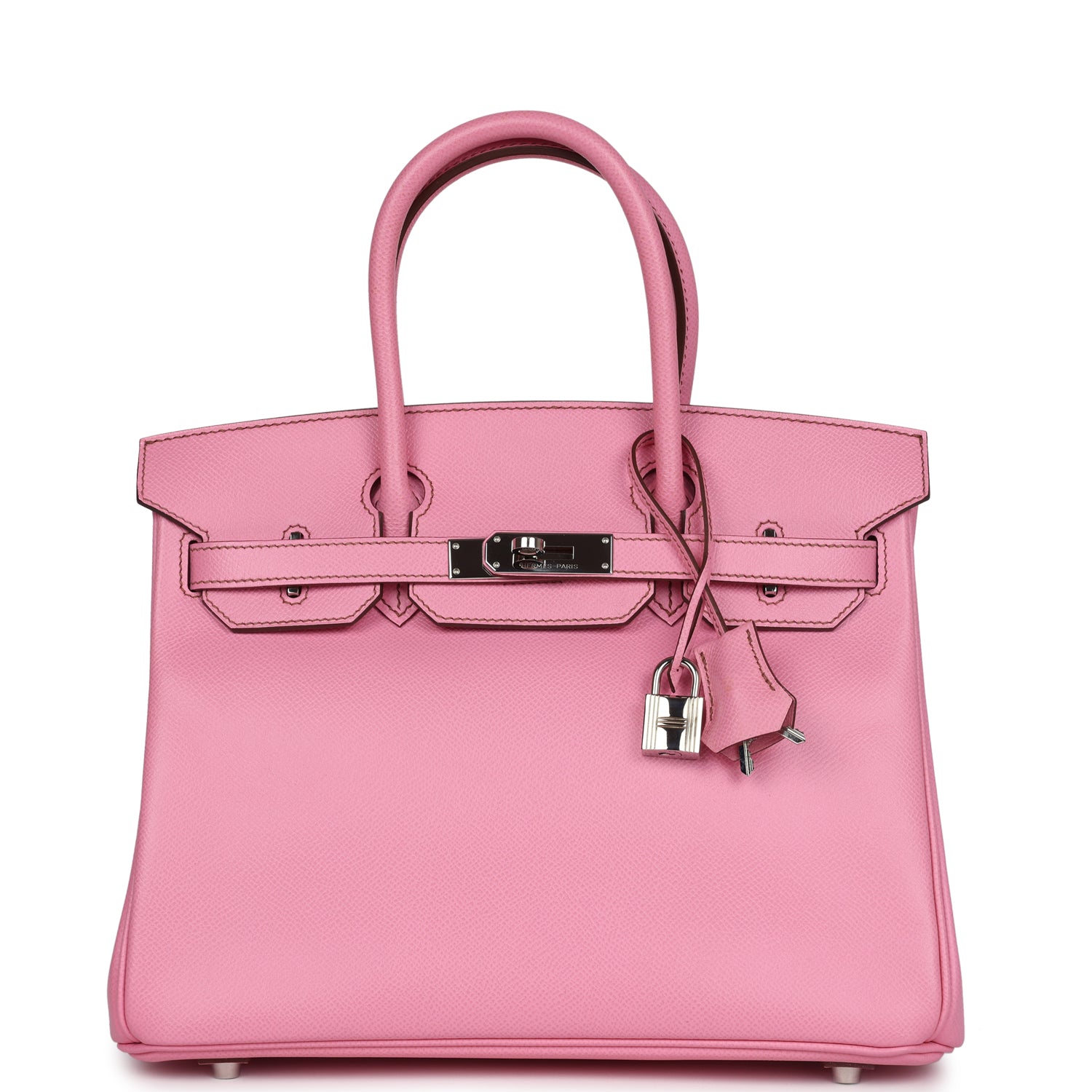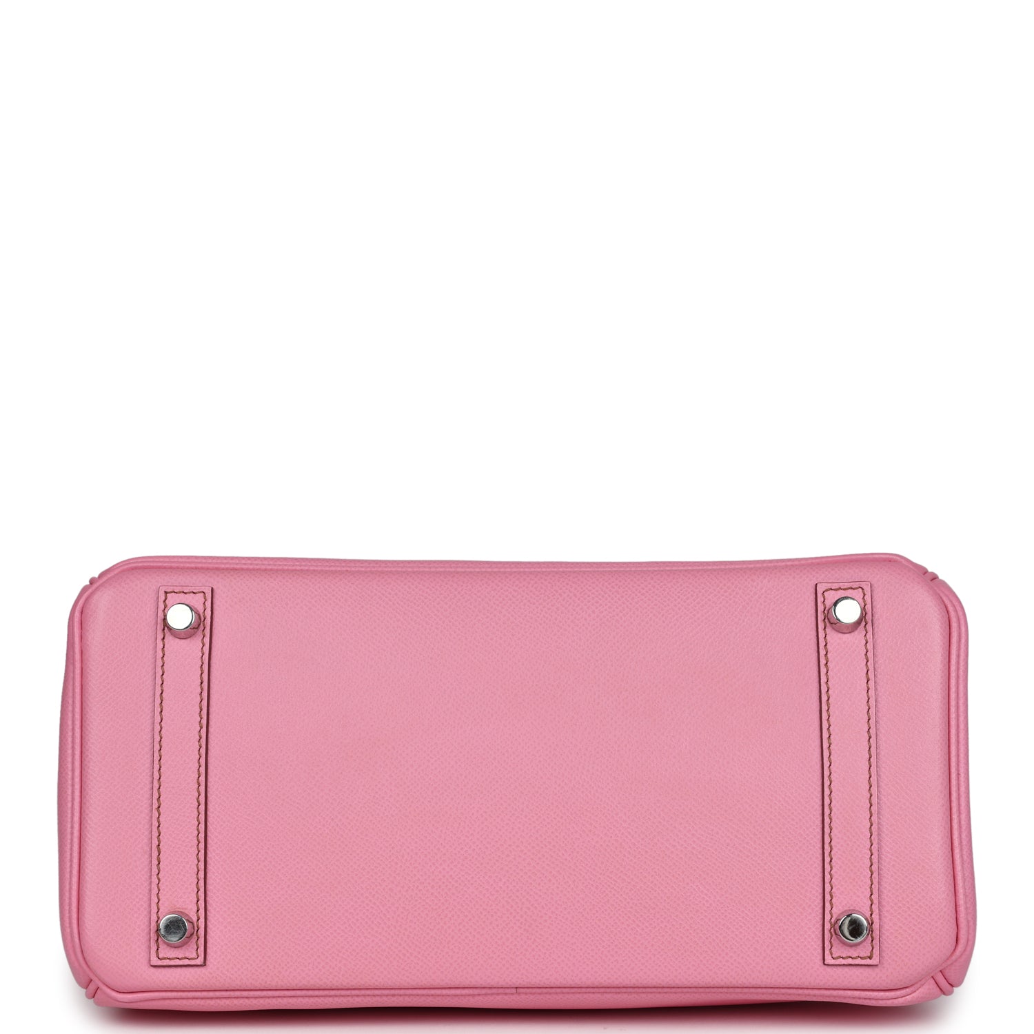 Birkin is in Bubblegum epsom leather with palladium hardware and has contrast stitching, front flap, two straps with center toggle closure, clochette with lock and two keys, and double rolled handles.