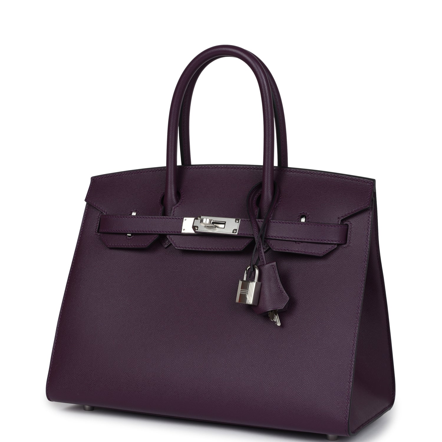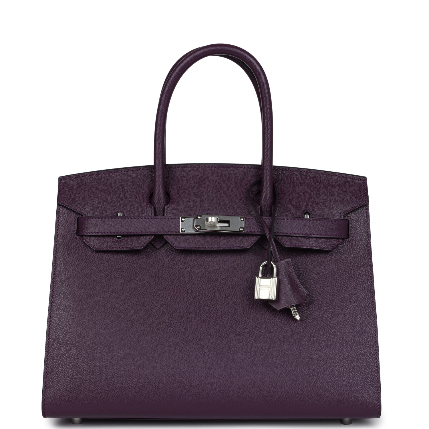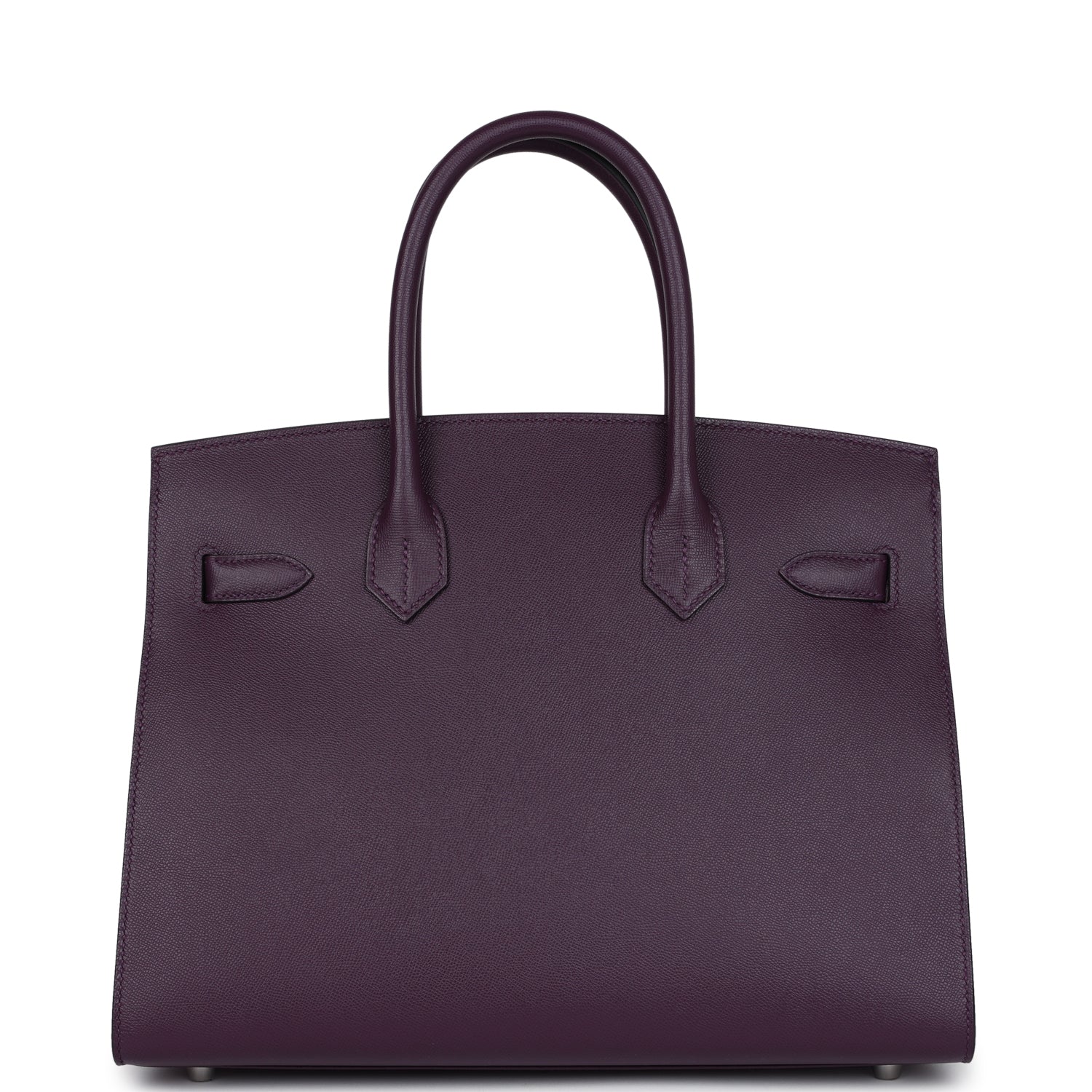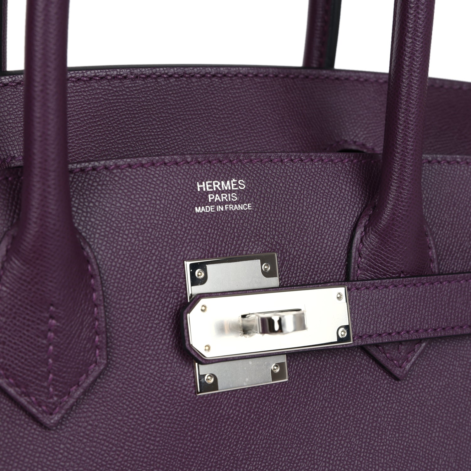 Birkin is in Cassis madame leather with palladium hardware and has tonal stitching, front flap, two straps with center toggle closure, clochette with lock and two keys, and double rolled handles.