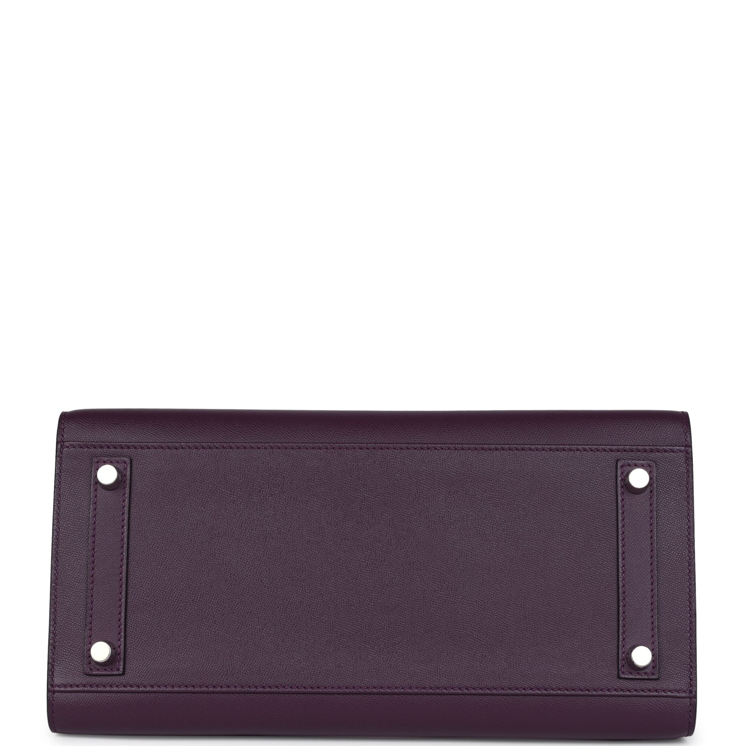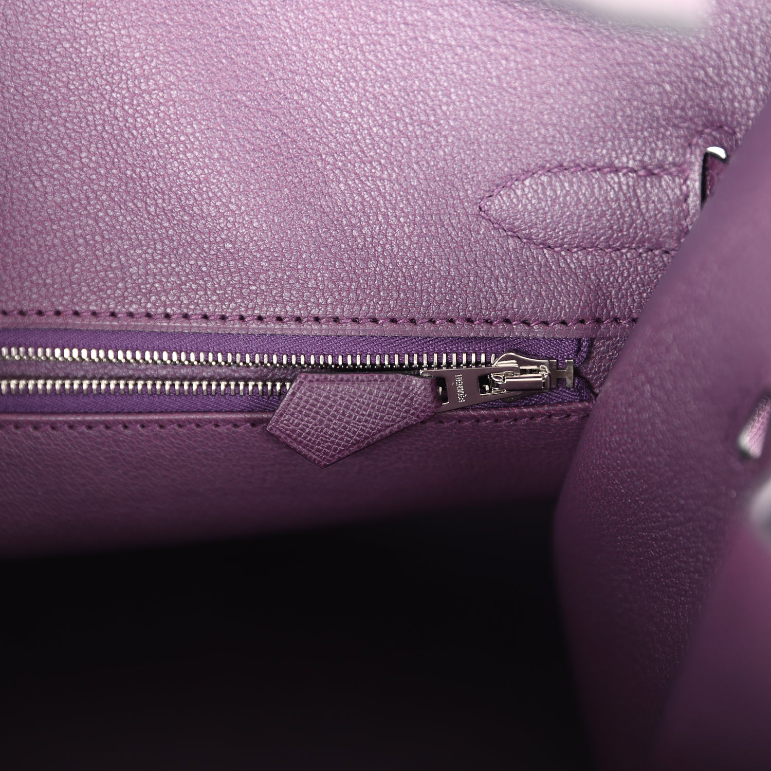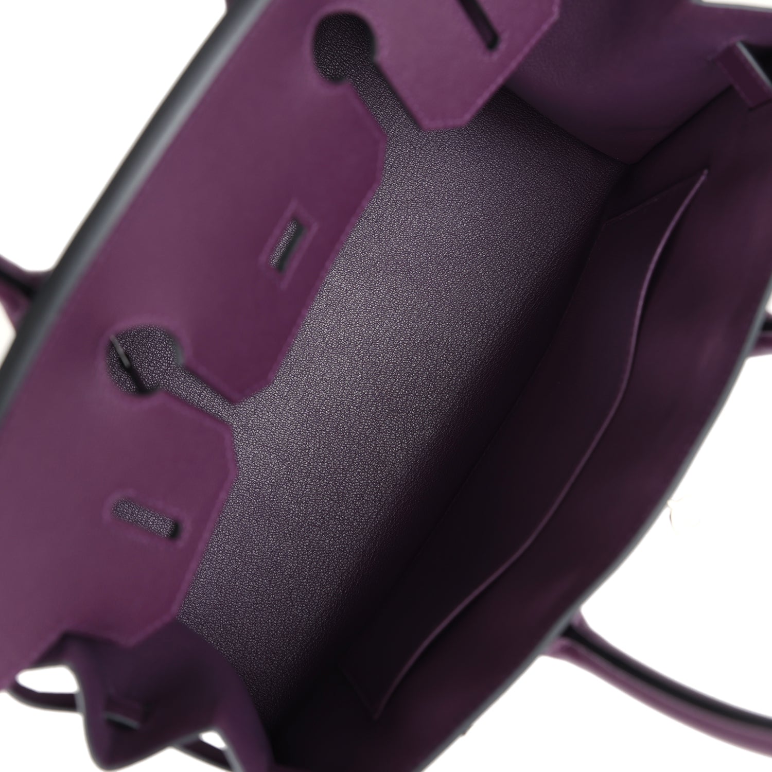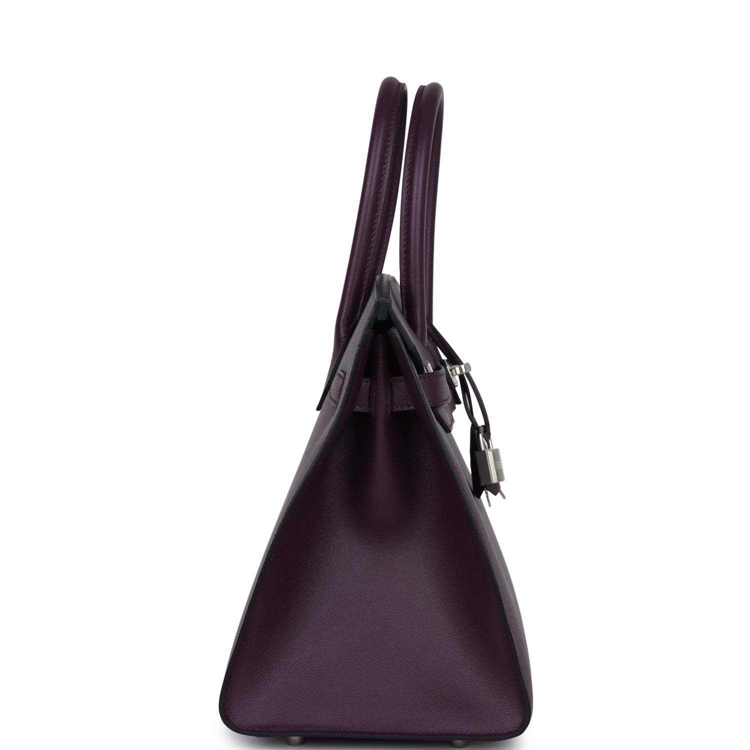 Birkin is in Cassis madame leather with palladium hardware and has tonal stitching, front flap, two straps with center toggle closure, clochette with lock and two keys, and double rolled handles.