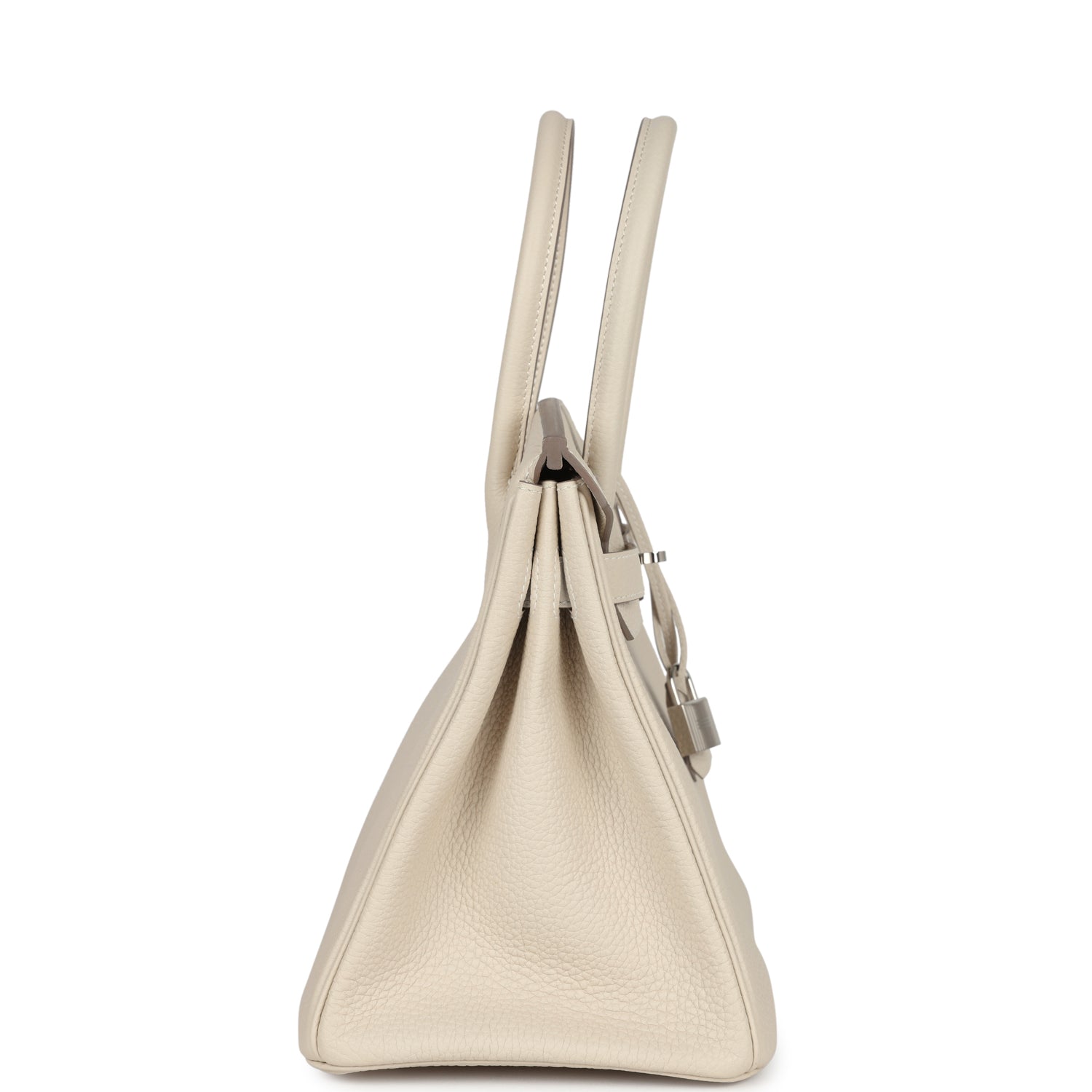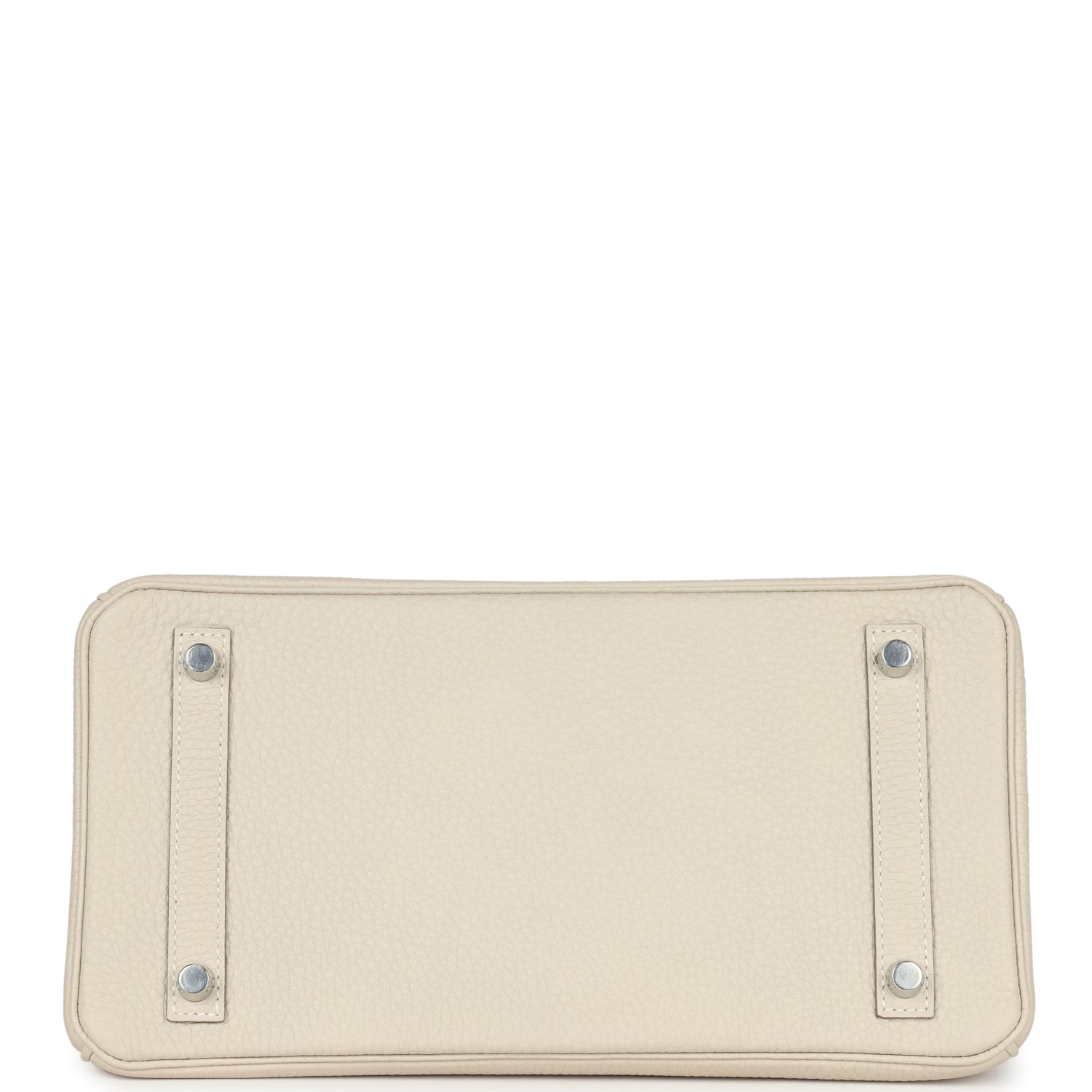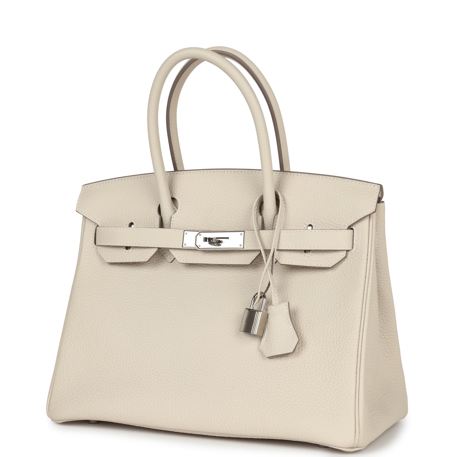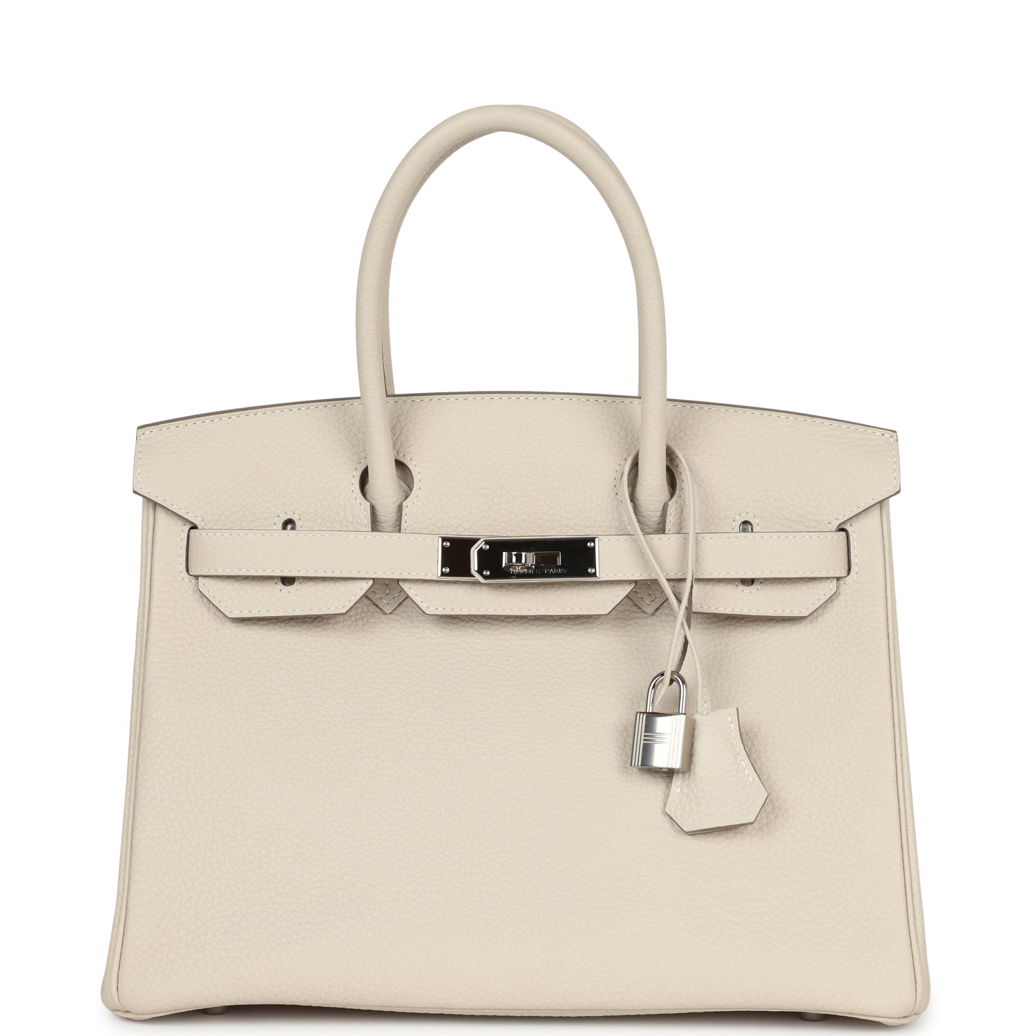 This Birkin is in Craie togo leather with palladium hardware and has tonal stitching, front flap, two straps with center toggle closure, clochette with lock and two keys, and double rolled handles.