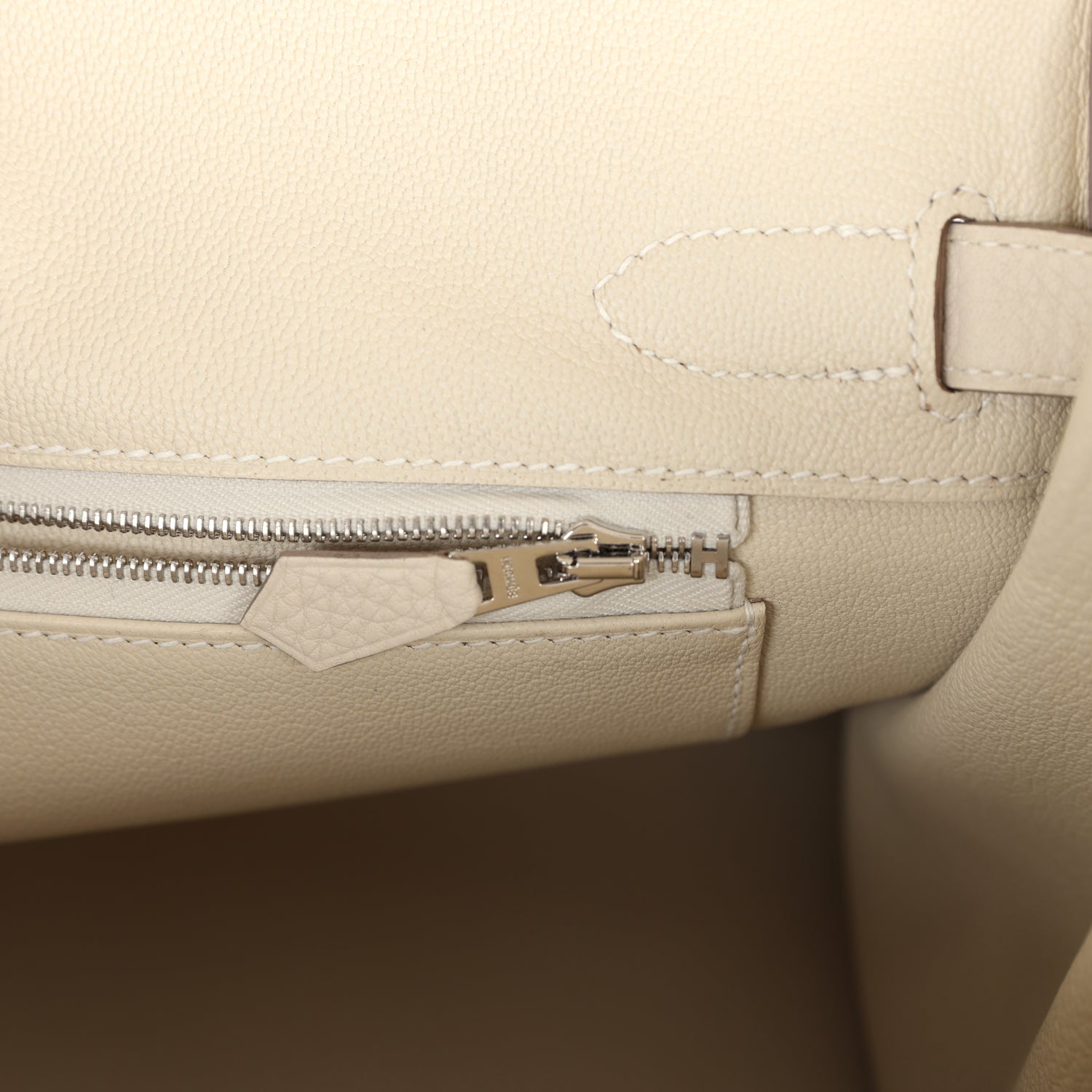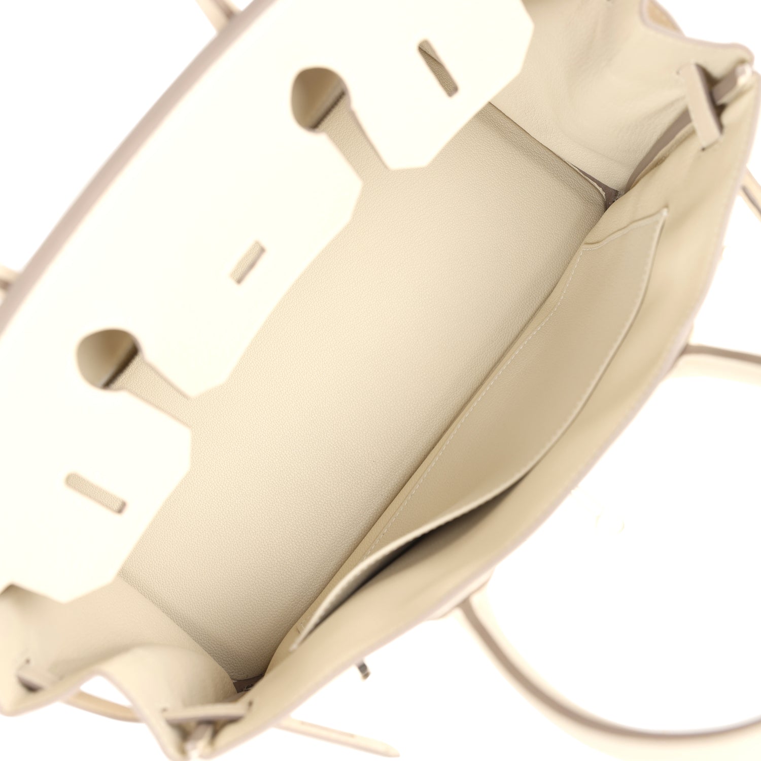 The interior is lined with Craie chevre and has one zip pocket with an Hermes engraved zipper pull and an open pocket on the opposite side.
