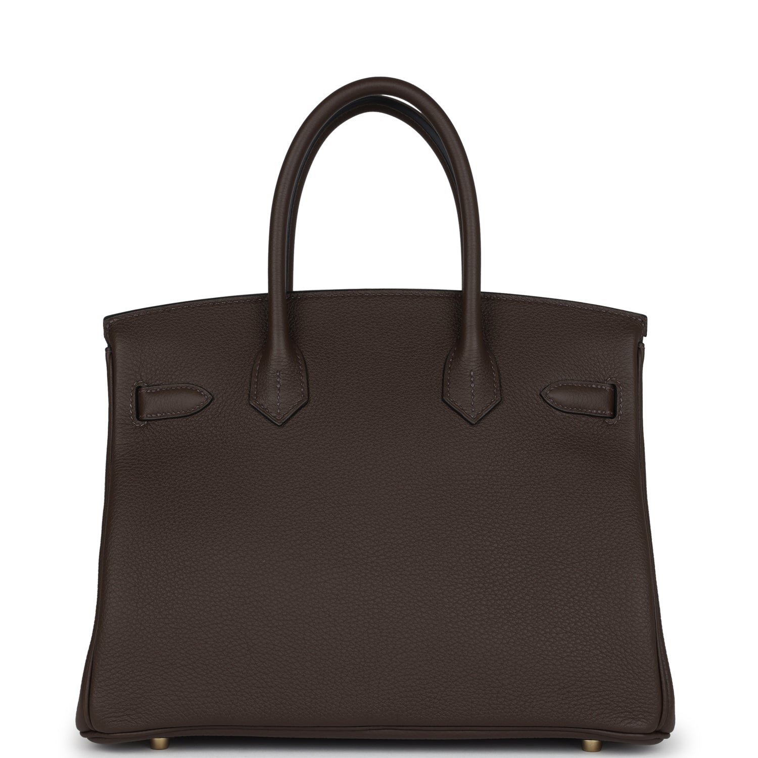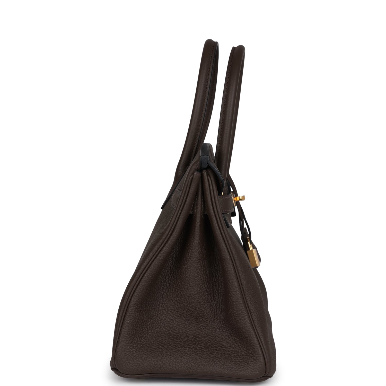 Birkin is in Ecorce togo leather with gold hardware and has tonal stitching, front flap, two straps with center toggle closure, clochette with lock and two keys, and double rolled handles.