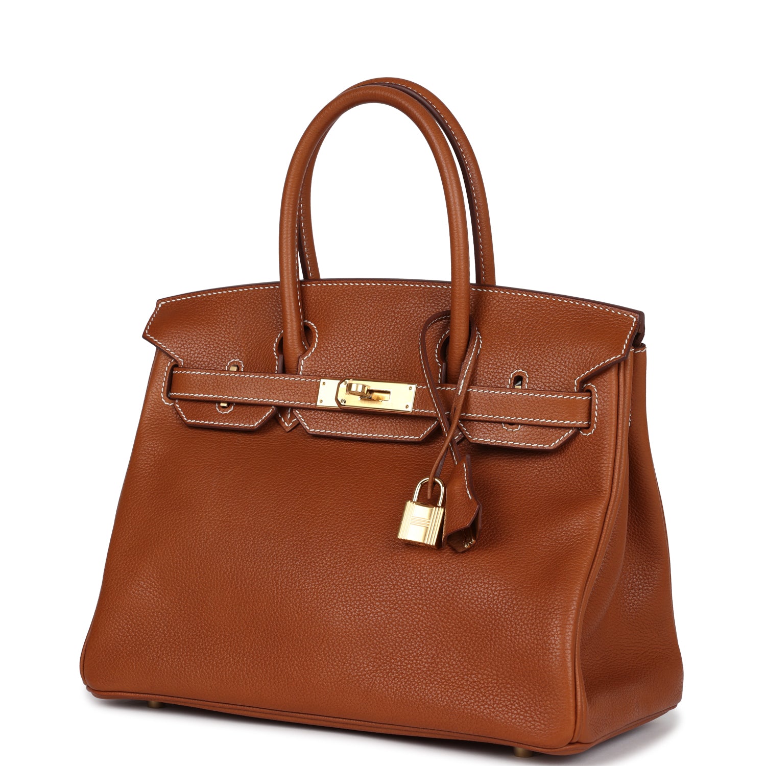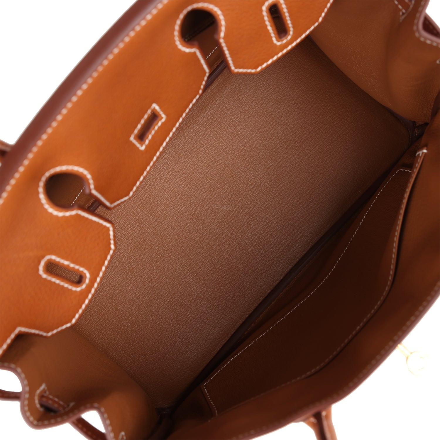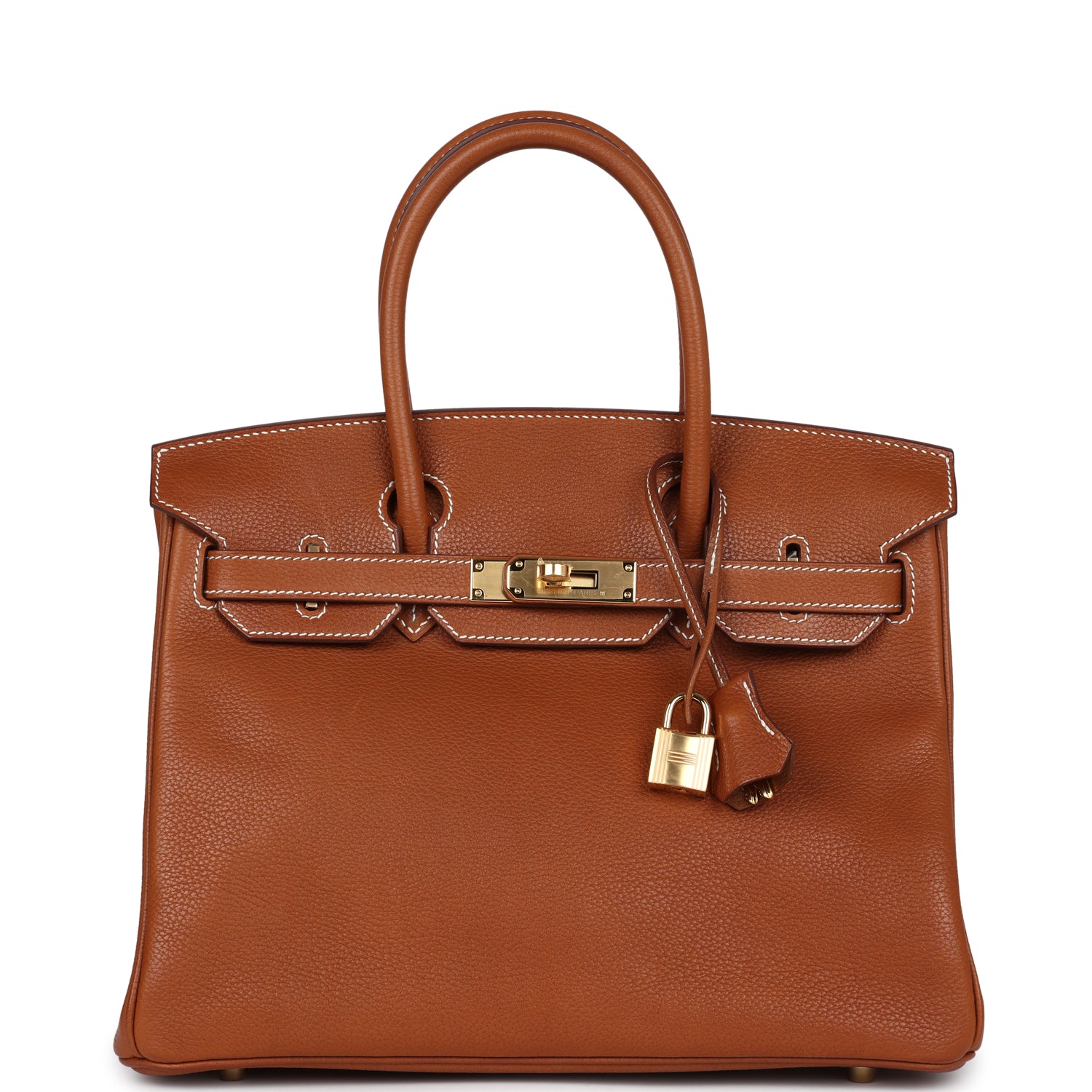 Birkin is in Fauve Barenia Faubourg leather with gold hardware and has contrast stitching, front flap, two straps with center toggle closure, clochette with lock and two keys, and double rolled handles.