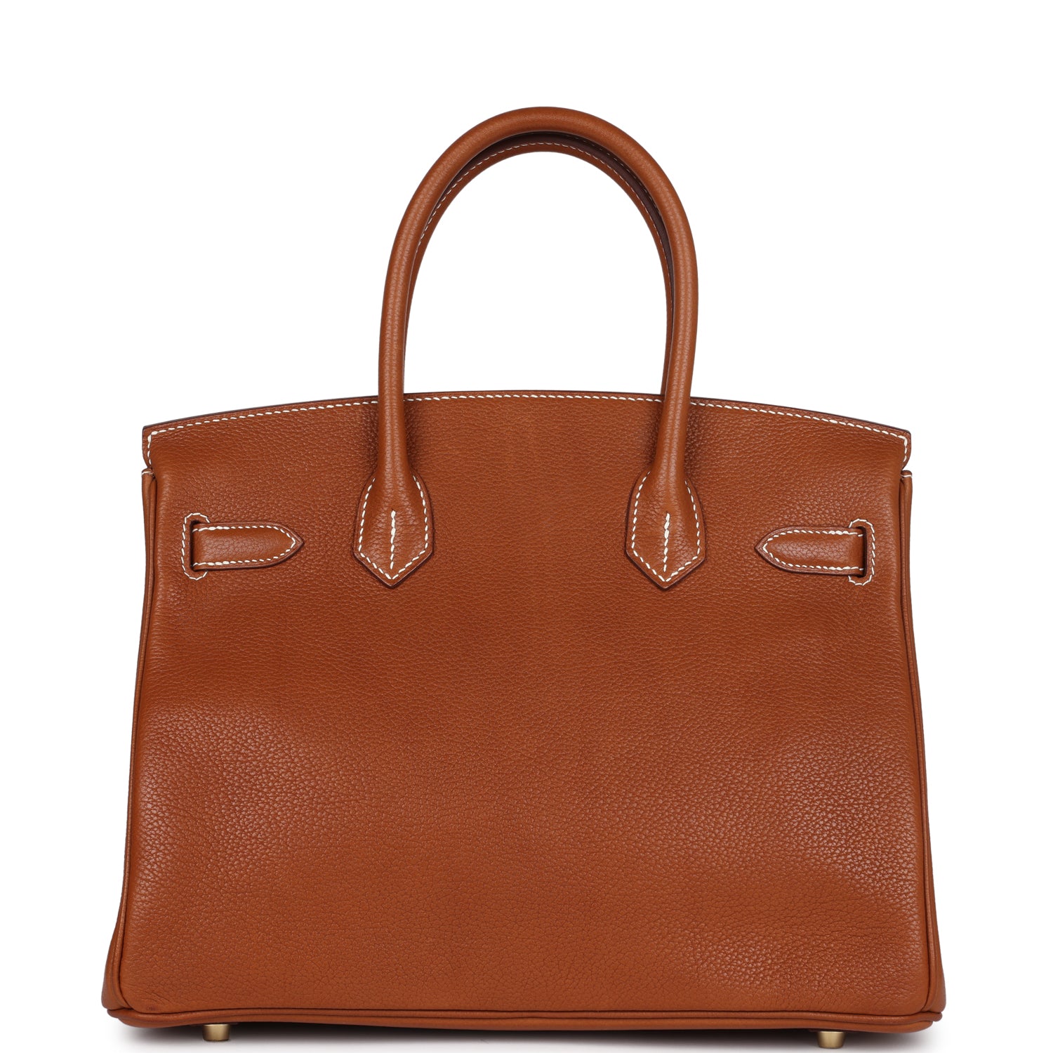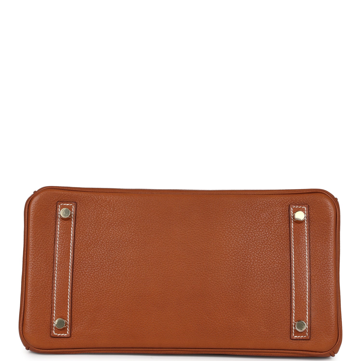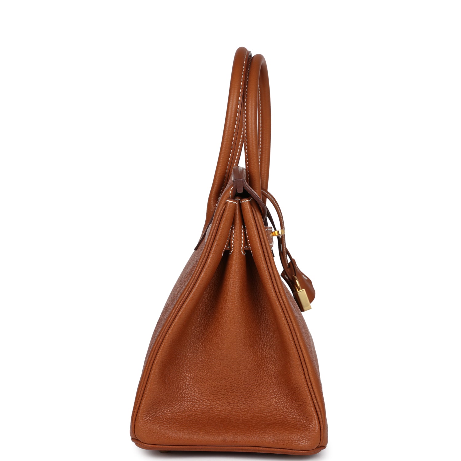 Birkin is in Fauve Barenia Faubourg leather with gold hardware and has contrast stitching, front flap, two straps with center toggle closure, clochette with lock and two keys, and double rolled handles.