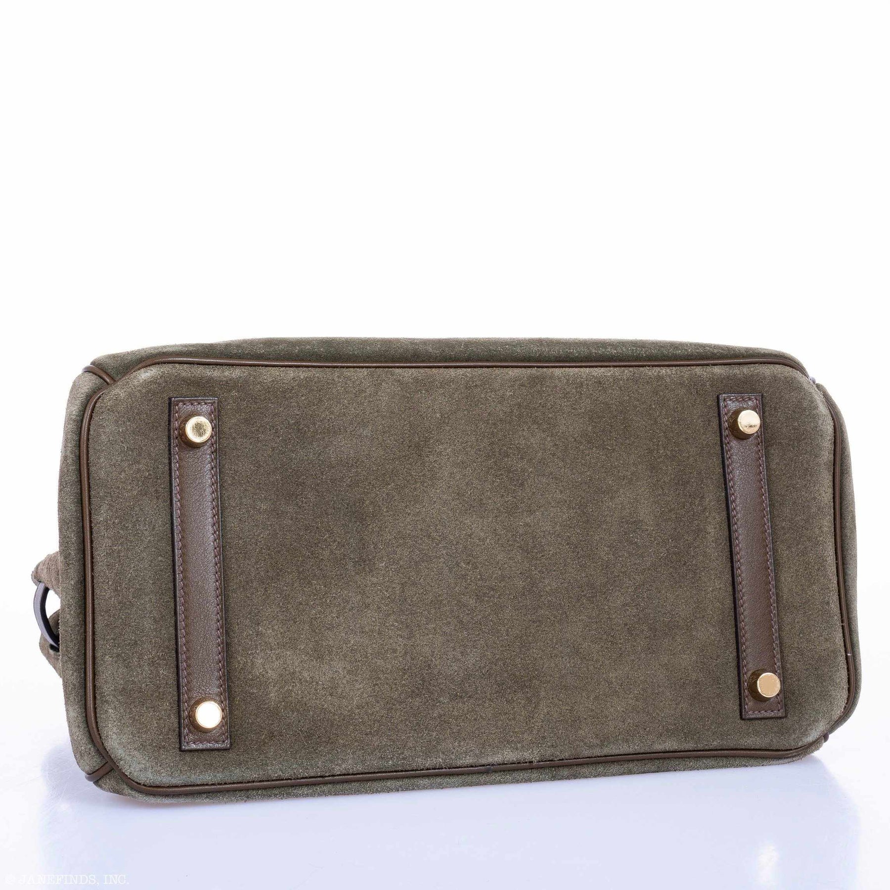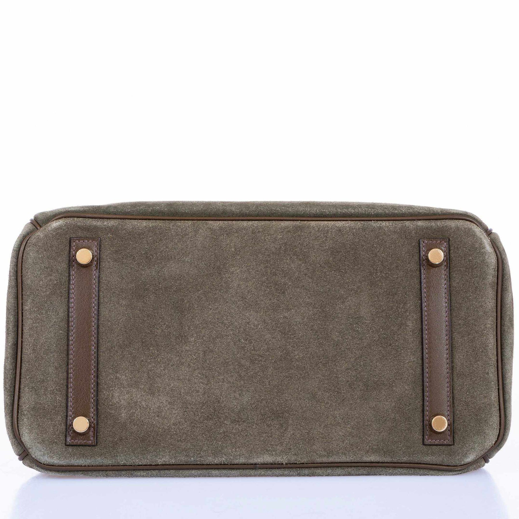 This Hermès Birkin Grizzly 30cm bag is one of the rarest handbags in the world. The stamp on this collector’s piece is “P” in a square and the bag is accentuated with Permabrass hardware. The lower body of this handbag is made from suede while the upper section is made from smooth Swift leather. This special edition Hermès Birkin is featured in the rare Veau and Vert de Gris colors.