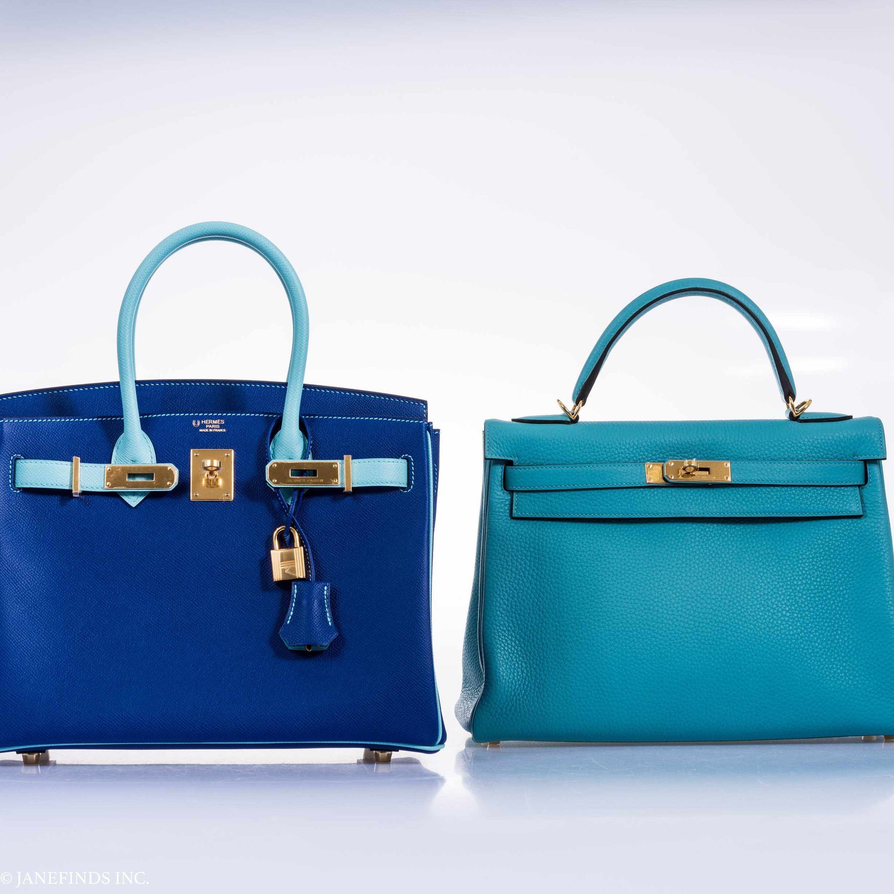 One of our favorites from Hermès, a stunning combination... Hermès Horseshoe Stamp (HSS) special order Bi-Color Birkin 30cm Blue Electric and Blue Atoll epsom leather with gold hardware and contrast stitching. The interior is lined with Blue Atoll chevre and has one zip pocket with an Hermès engraved pull and an open pocket on the opposite side.