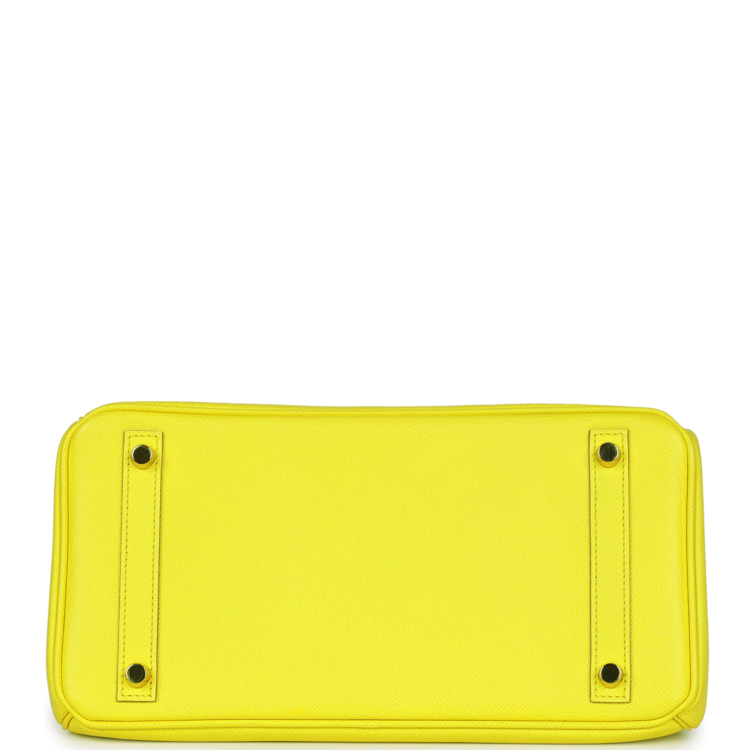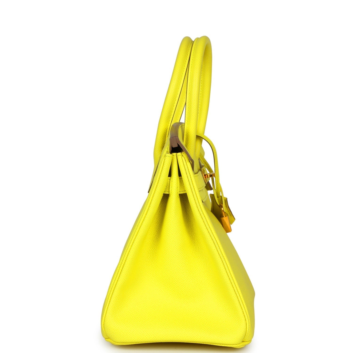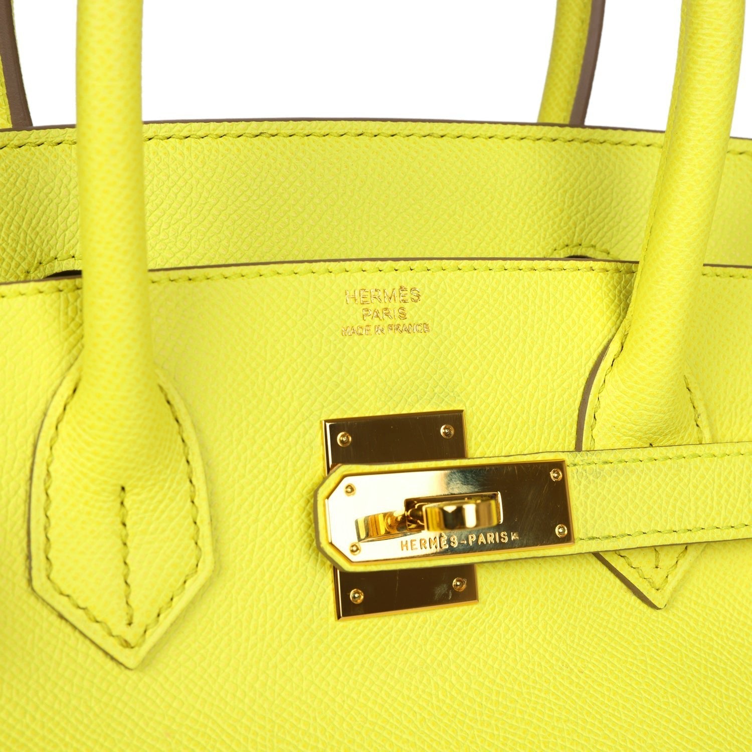 Birkin is in Lime epsom leather with gold hardware and has tonal stitching, two straps with front toggle closure, clochette with lock and two keys and double rolled handles.