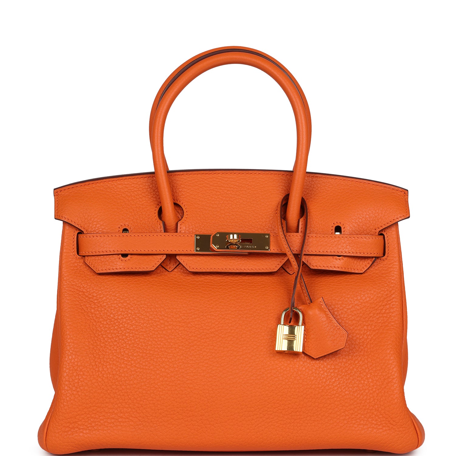 Birkin is in Orange togo leather with gold hardware and has tonal stitching, front flap, two straps with center toggle closure, clochette with lock and two keys and double rolled handles.