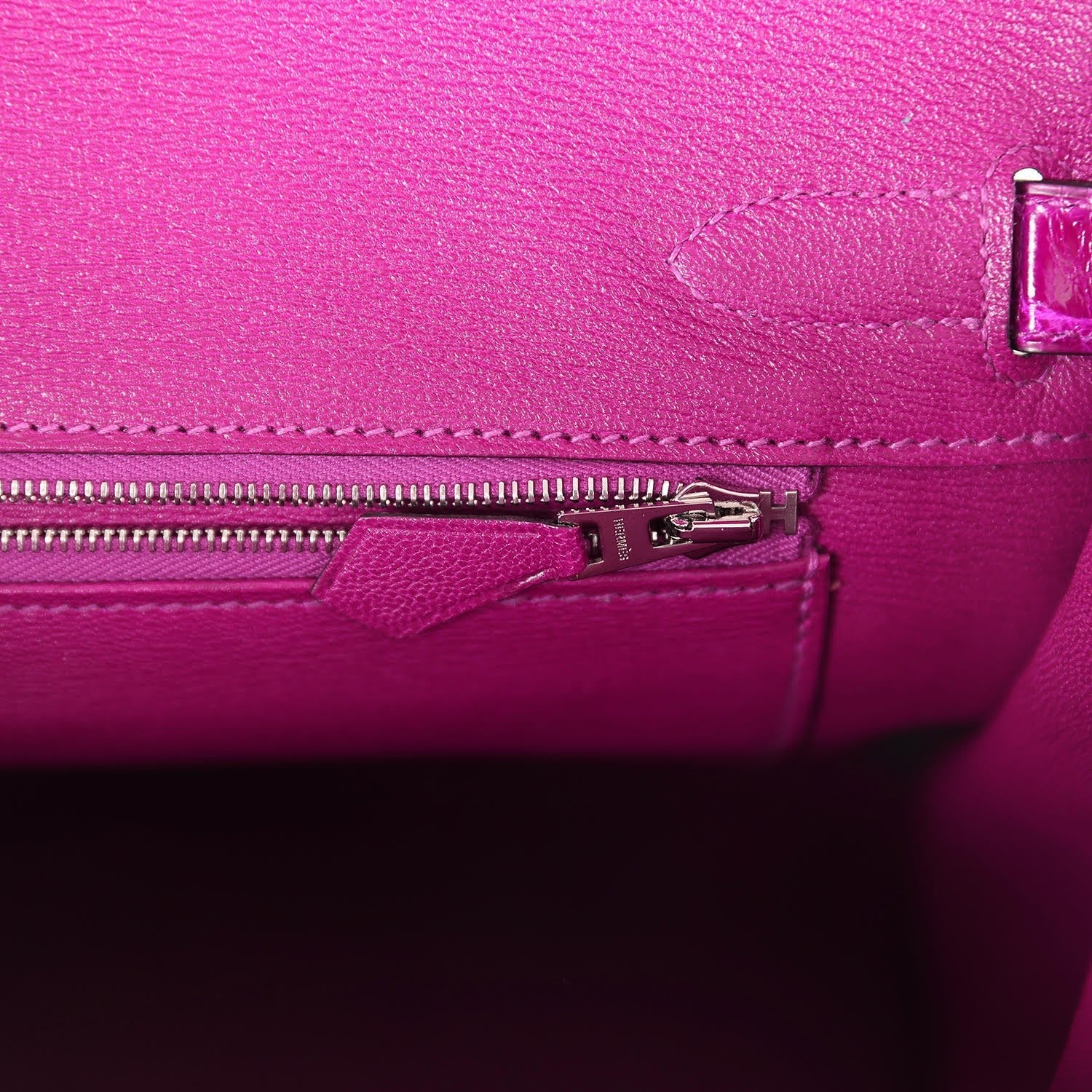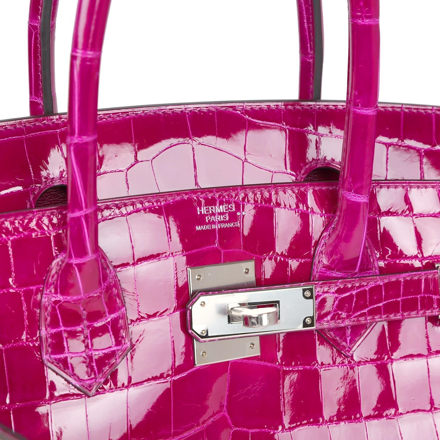 Birkin is in Rose Pourpre Shiny Niloticus Crocodile leather with palladium hardware, tonal stitching, front flap with two straps, front toggle closure, clochette with lock and two keys, double rolled handles.