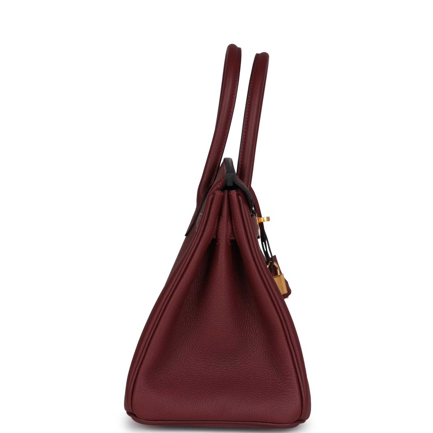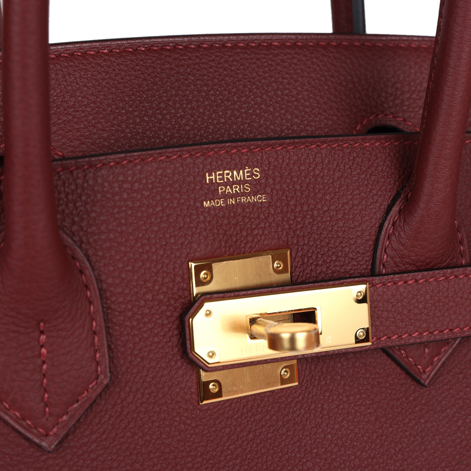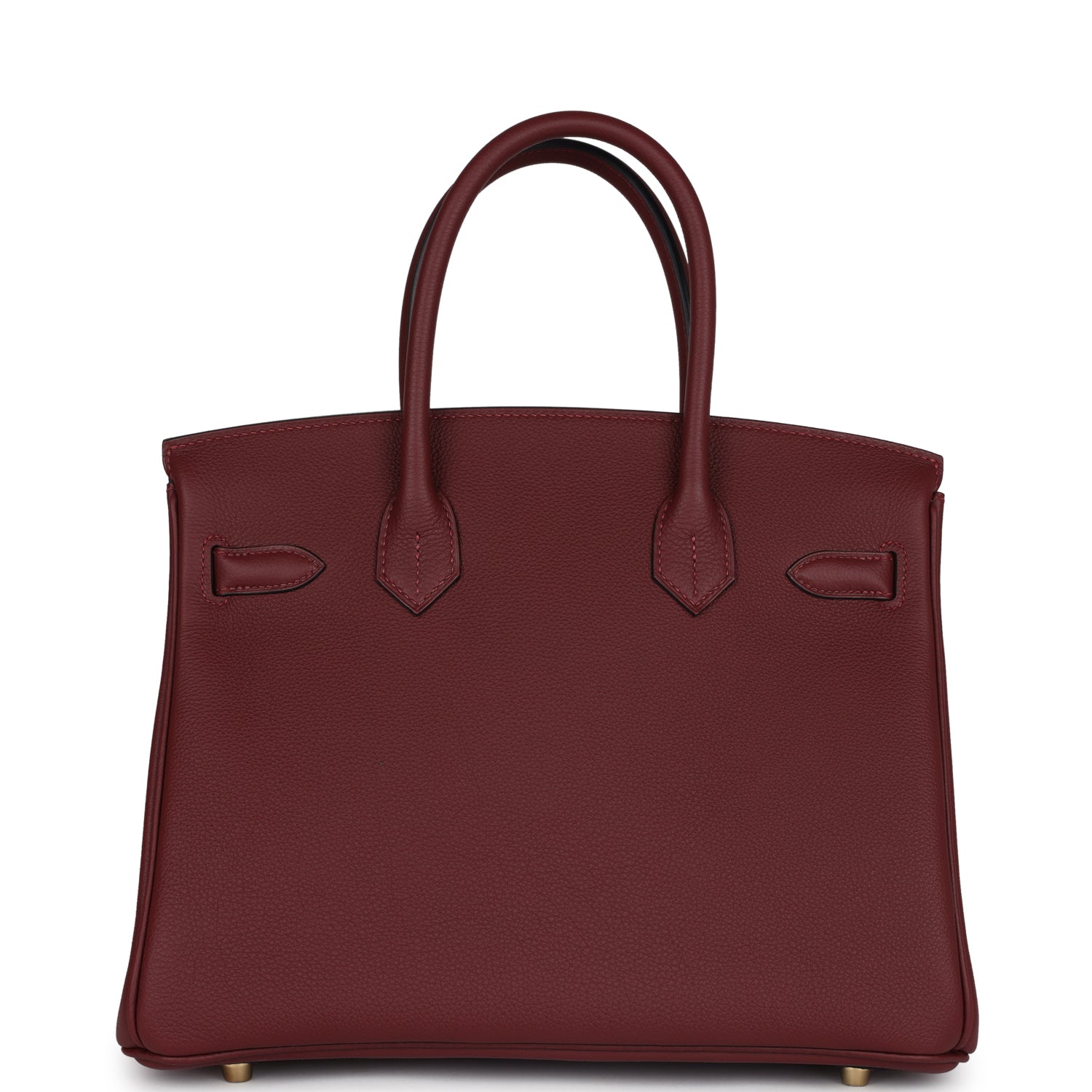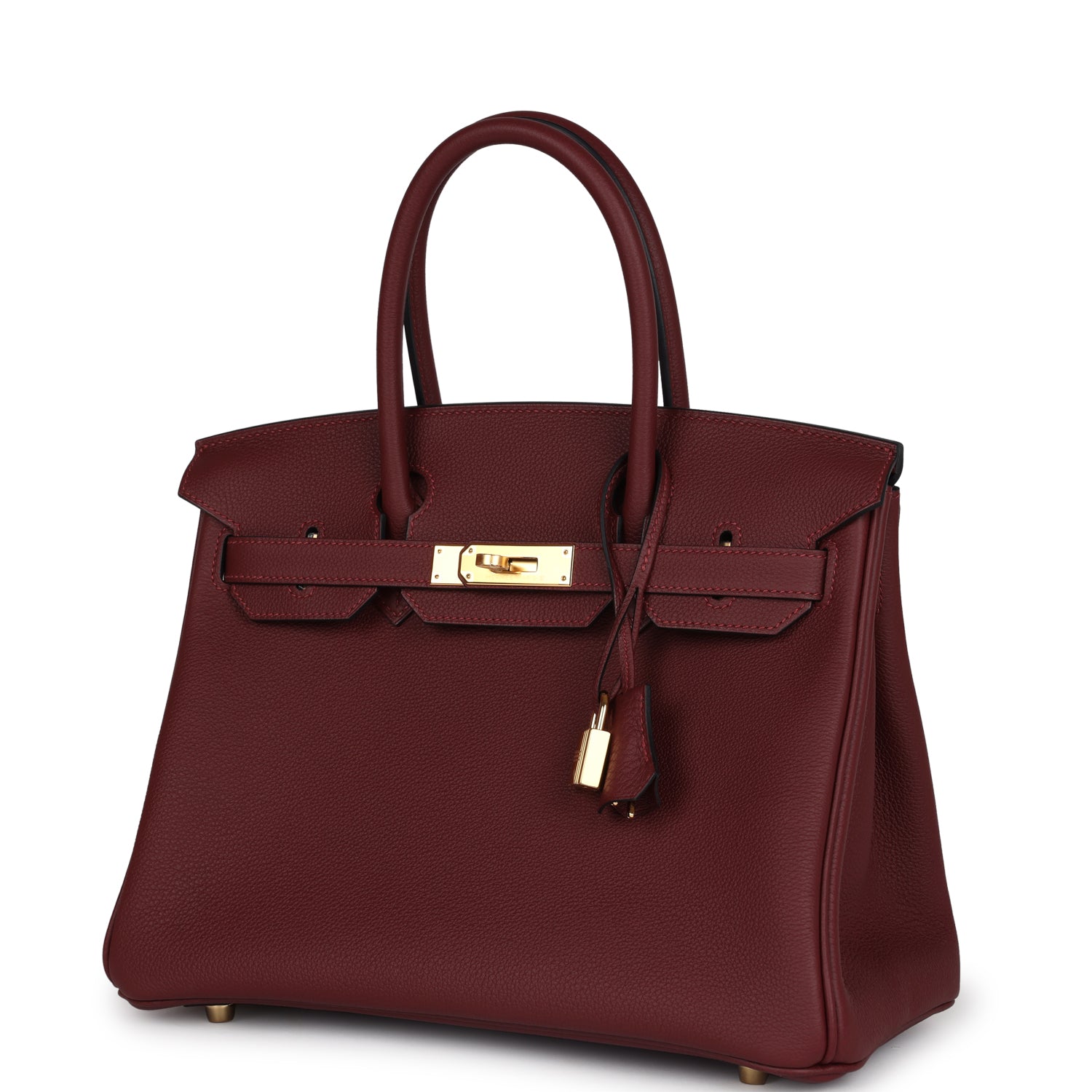 Birkin is in Rouge H togo leather with gold hardware and has tonal stitching, front flap, two straps with center toggle closure, clochette with lock and one key, and double rolled handles.