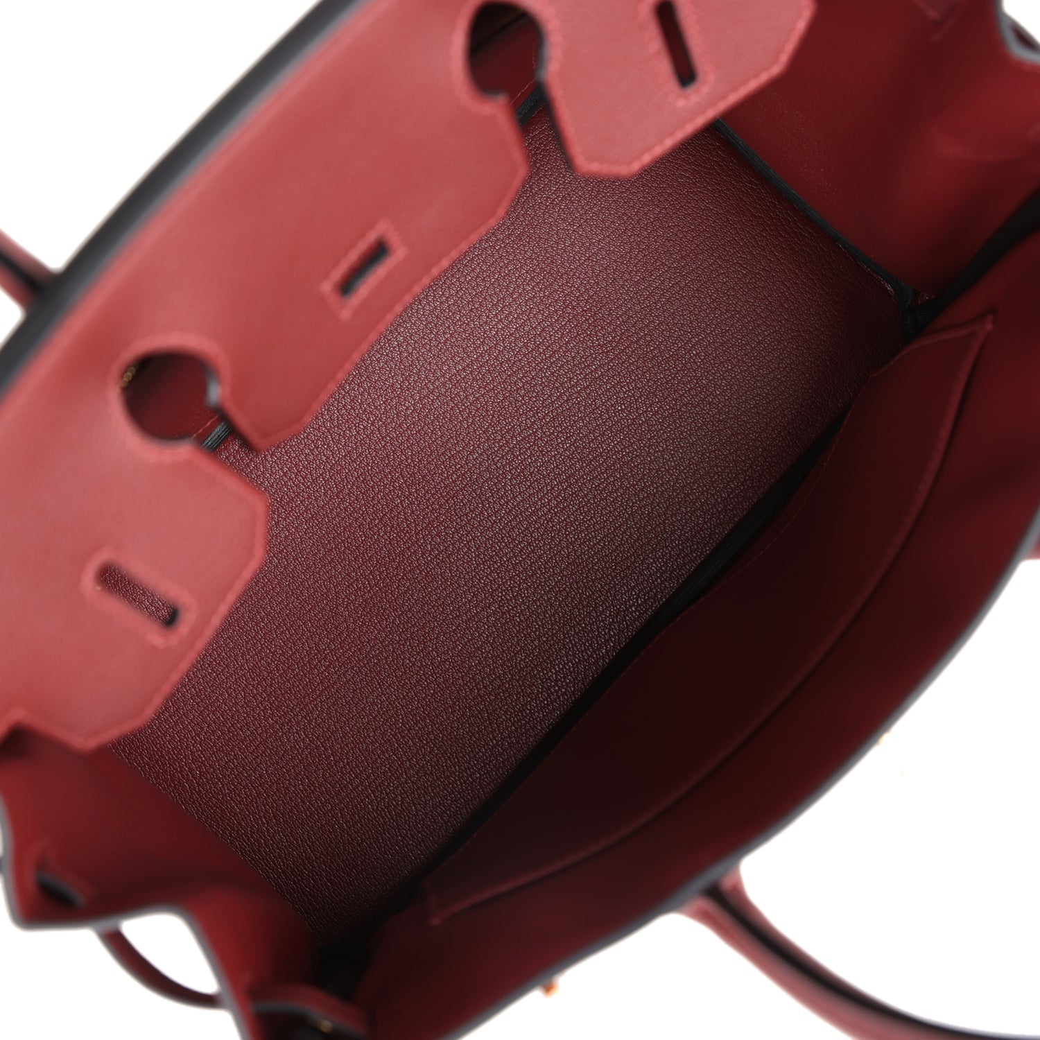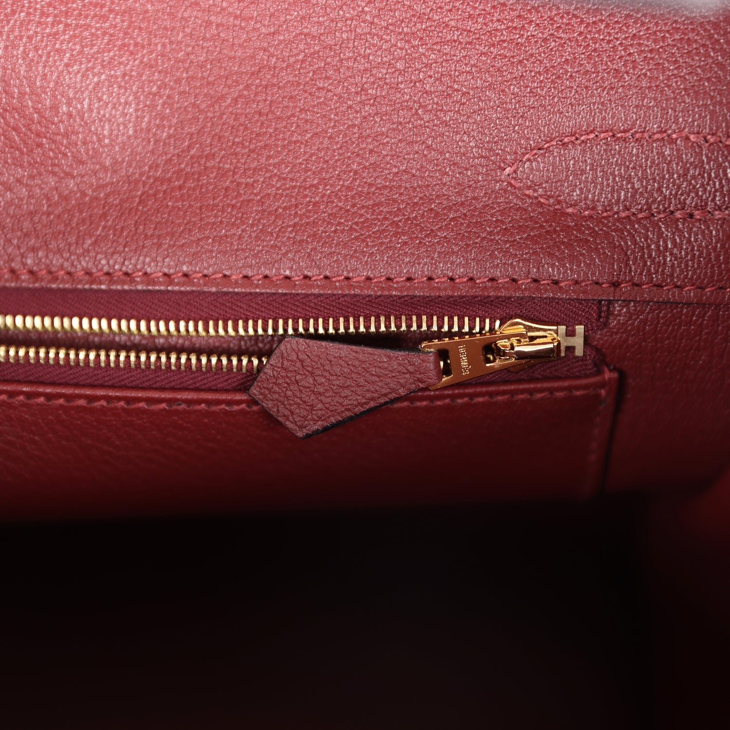 The interior is lined with Rouge H chevre and has one zip pocket with an Hermes engraved zipper pull and an open pocket on the opposite side.