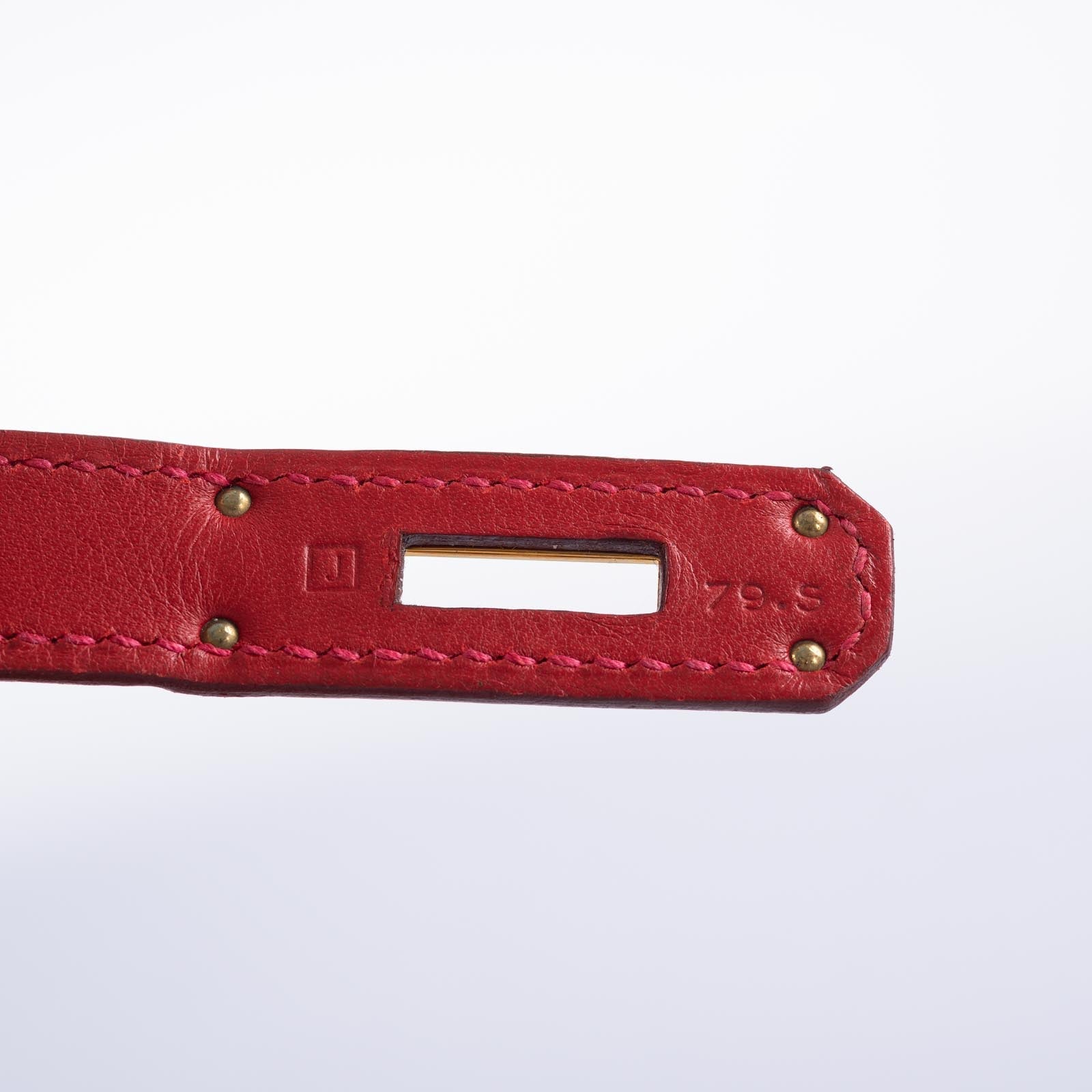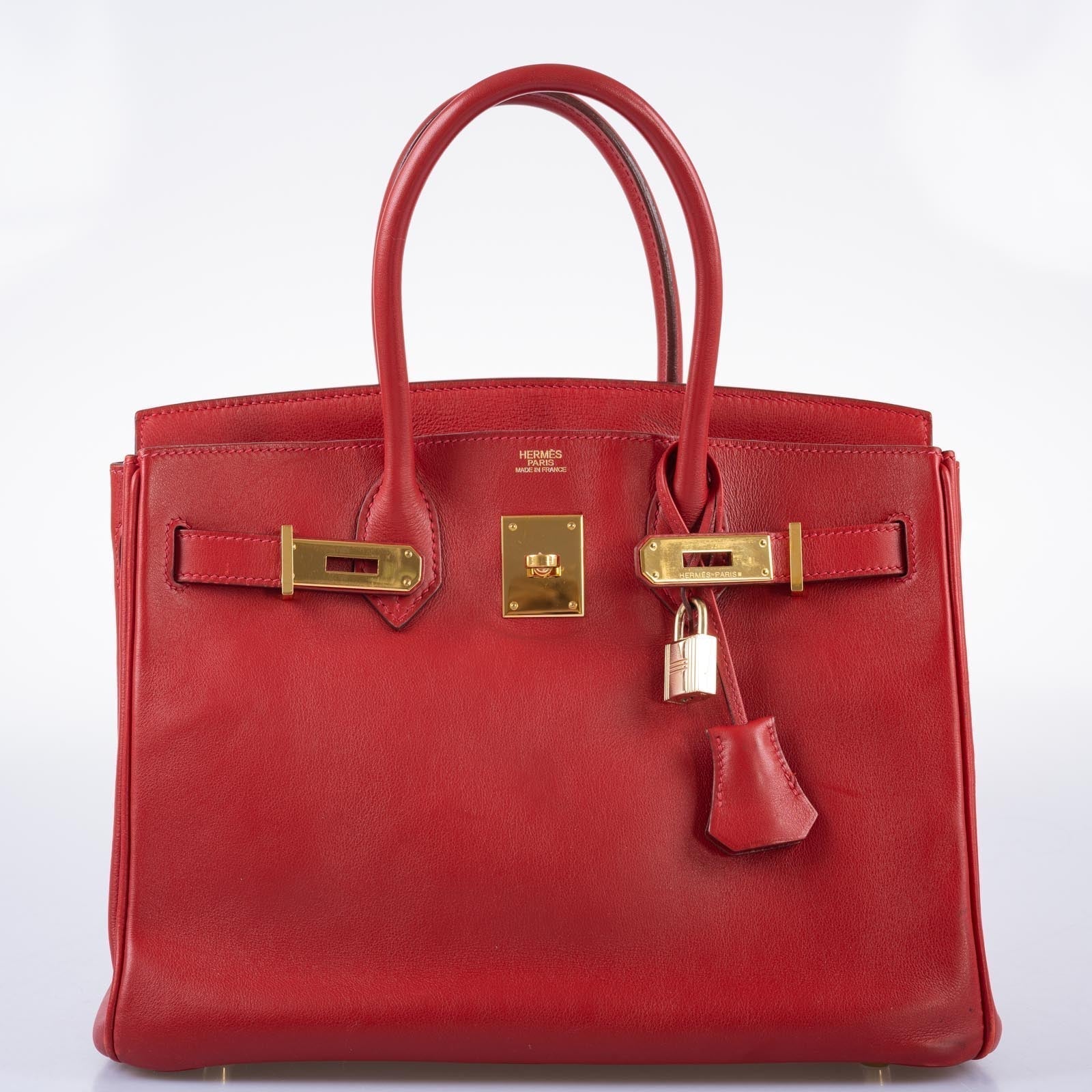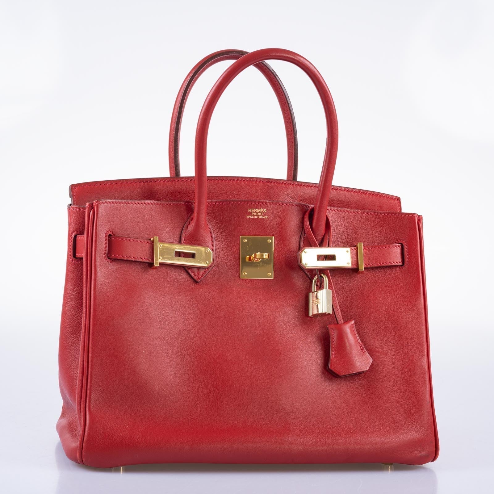 Rouge Vif is Hermès’ classic bright red. Found on bags dating back decades, it is distinguished from other shades of red by its slightly pink stitching. This Birkin 30 is a fine example, sporting the shade proudly on smooth Swift leather. Paired with Gold hardware, the effect is bold and luscious. Dating from 2006, this Birkin has been used lovingly and displays a patina of delicate wear including hardware scratches, corner scuffs and a faint ‘smiley’ mark under the spindle.