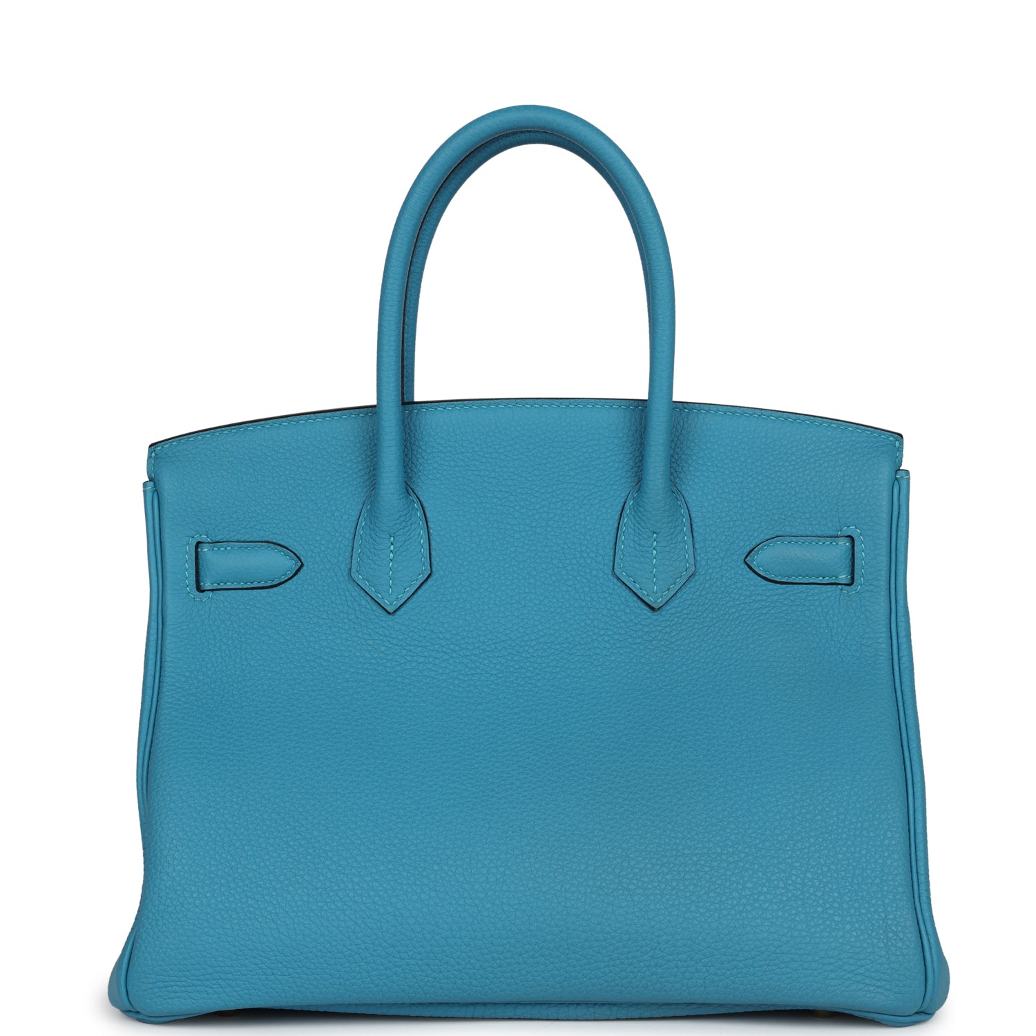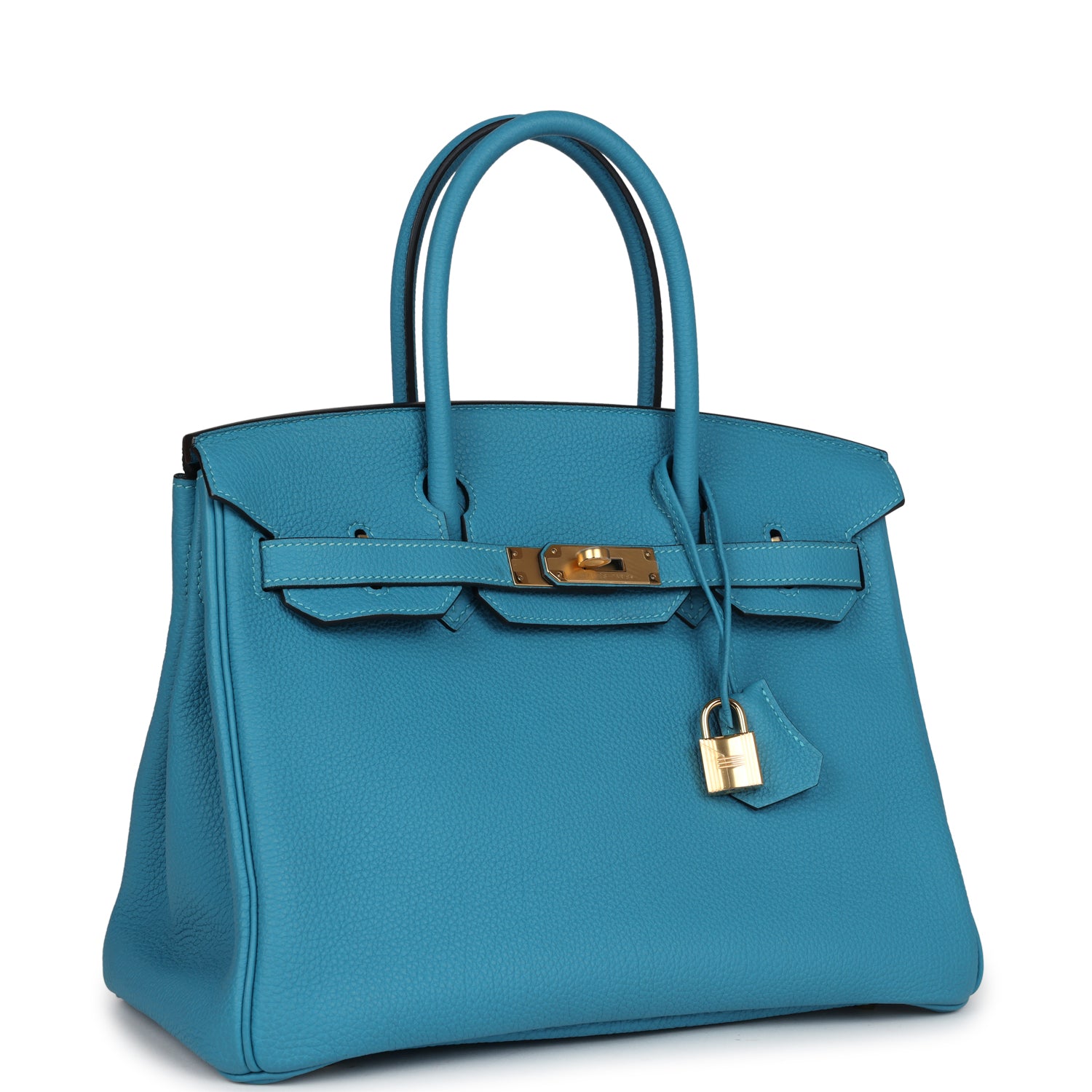 This Birkin is in Turquoise togo leather with gold hardware and has tonal stitching, front flap, two straps with center toggle closure, clochette with lock and two keys, and double rolled handles.