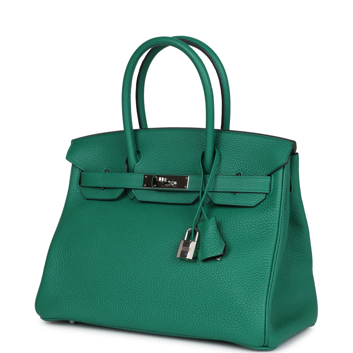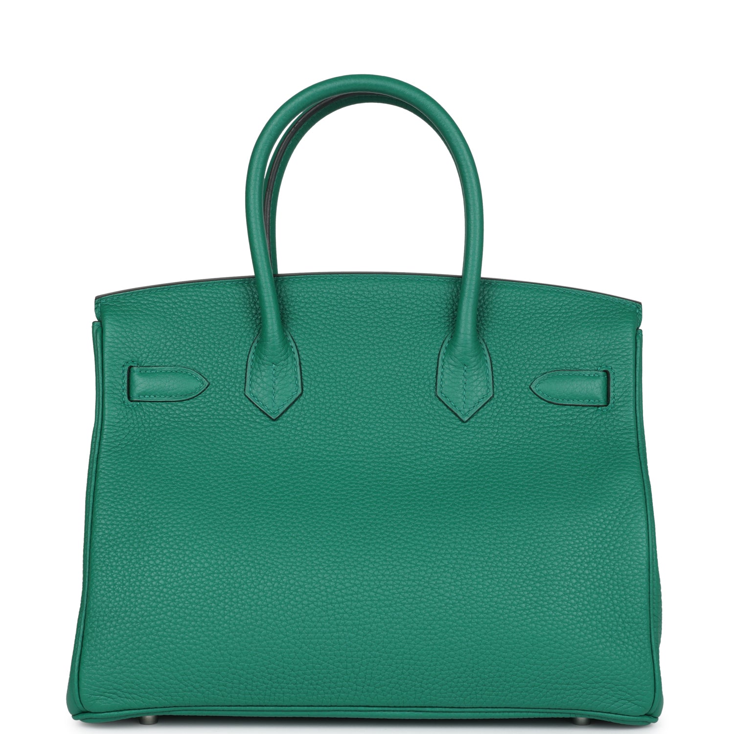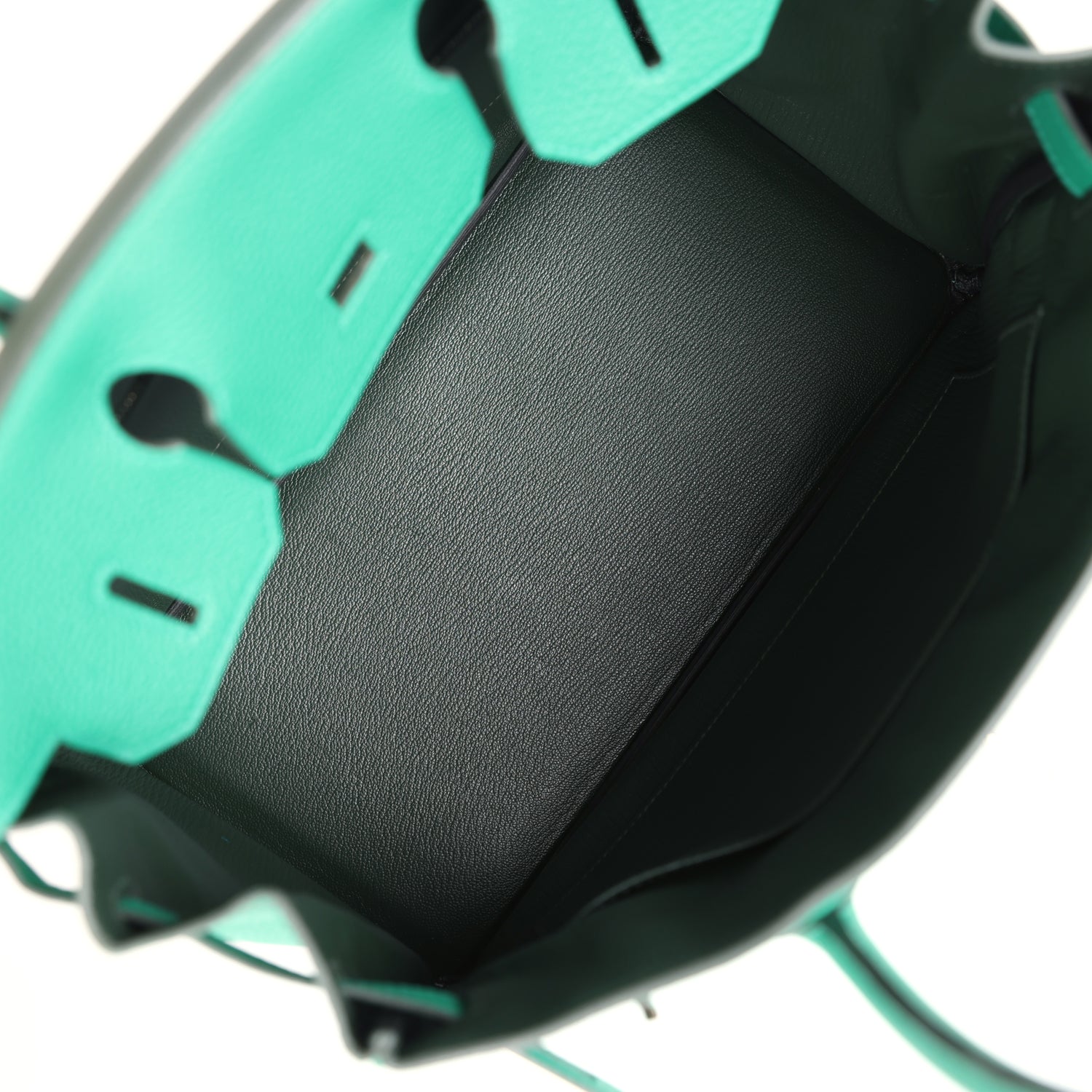 Verso Birkin is in Vert Vertigo clemence leather with palladium hardware and has tonal stitching, two straps with front toggle closure, clochette with lock and two keys and double rolled handles.