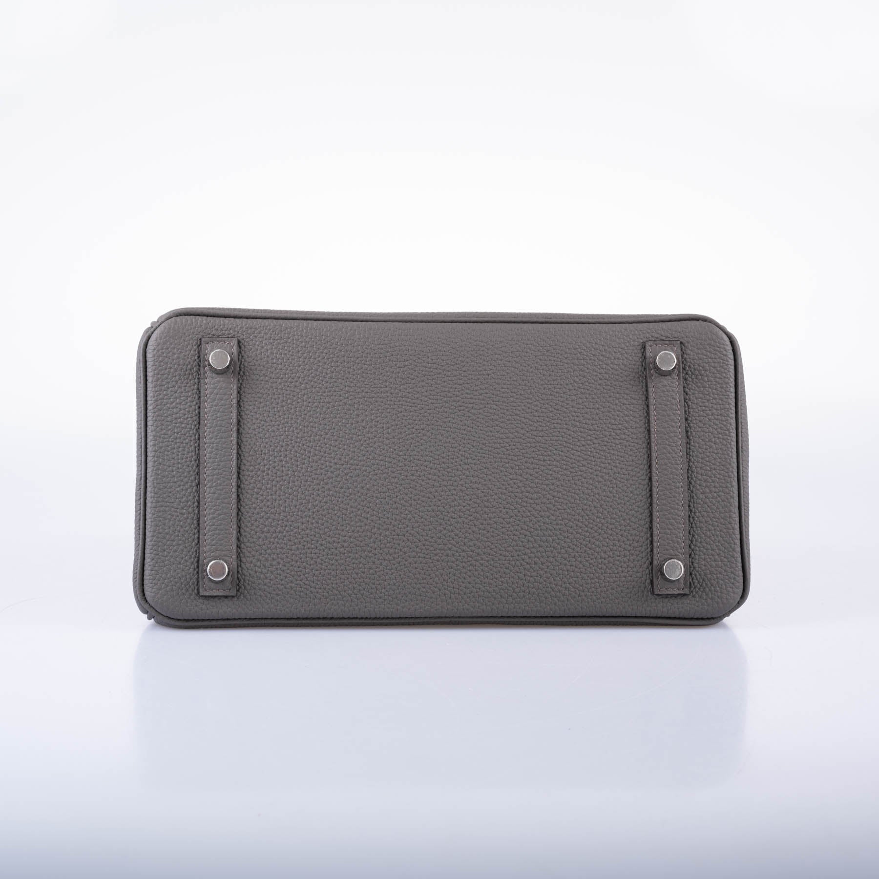 Introducing Vert Gris, the mysterious hue that has everyone talking. A color that seems to shift and change before your very eyes, it's no wonder this shade has been causing quite a stir in the fashion world. Our latest Birkin bag in Vert Gris is a true standout piece, with its unique shade that seems to be a blend of gray, green, brown, and blue all at once. This shade is truly one of a kind, appearing icy and warm, steely and soft, depending on the lighting and angle. And with its 30cm size and stunning palladium hardware, this Birkin is sure to make a statement wherever it goes. In pristine, store-fresh condition, this neutral bag is anything but ordinary. Don't miss out on the chance to add this limited edition Hermès piece to your collection. Vert Gris is a shade that simply can't be explained, it must be experienced.