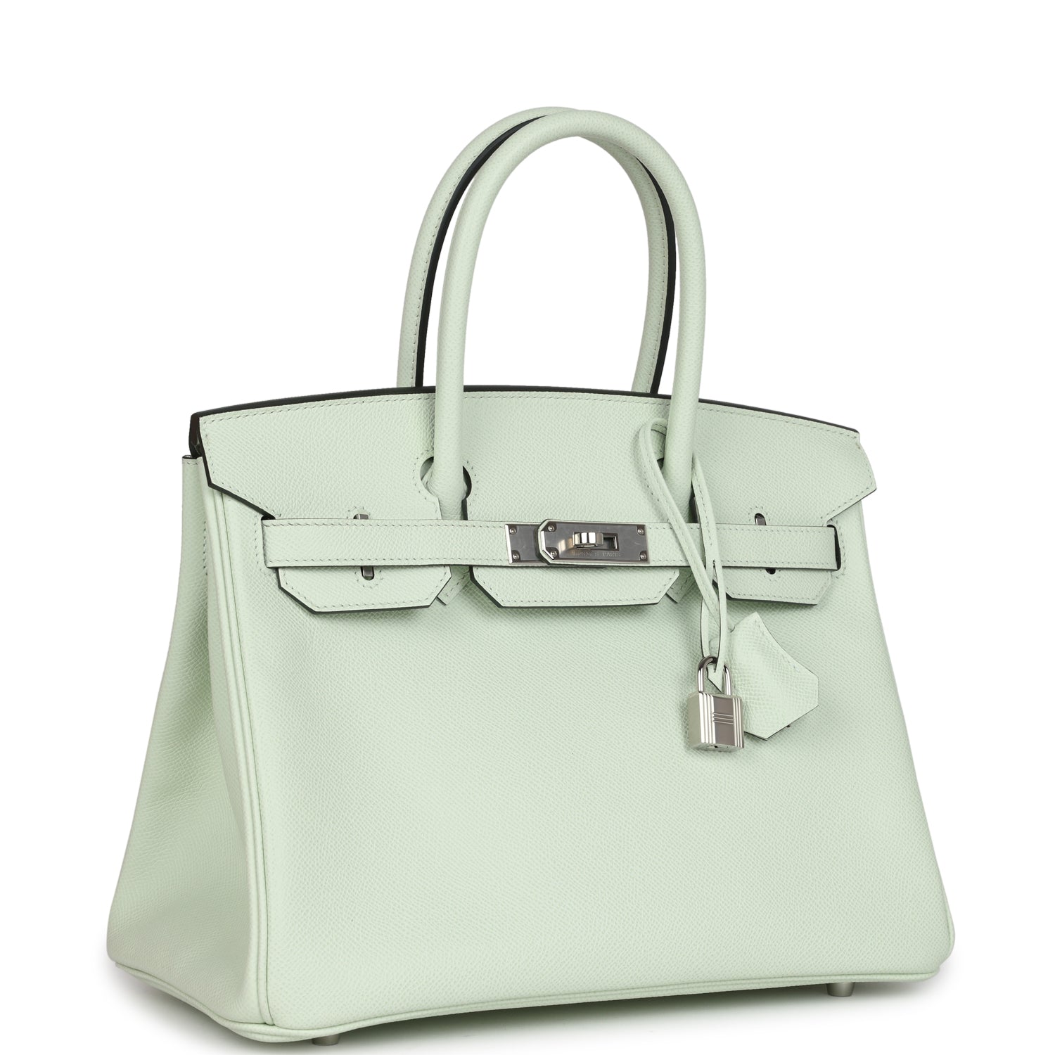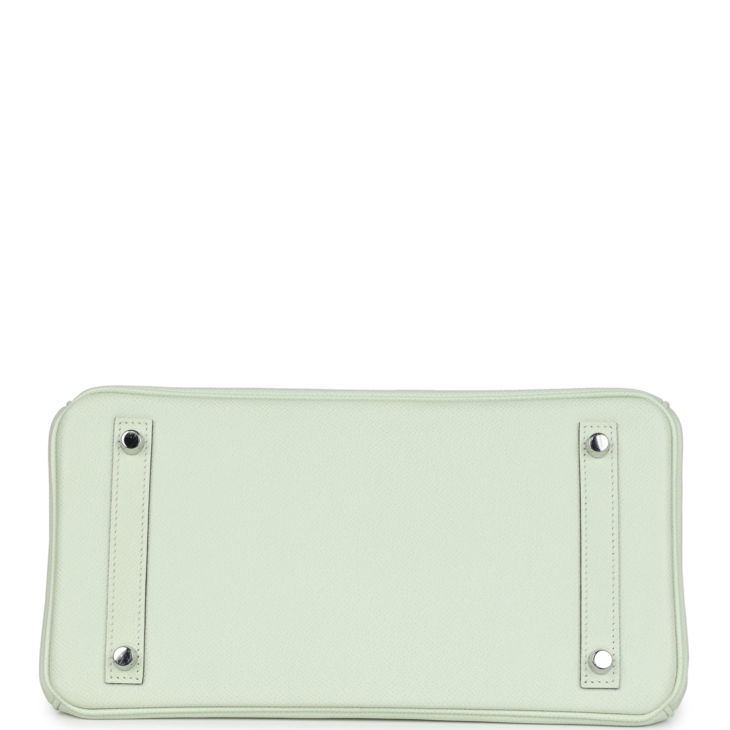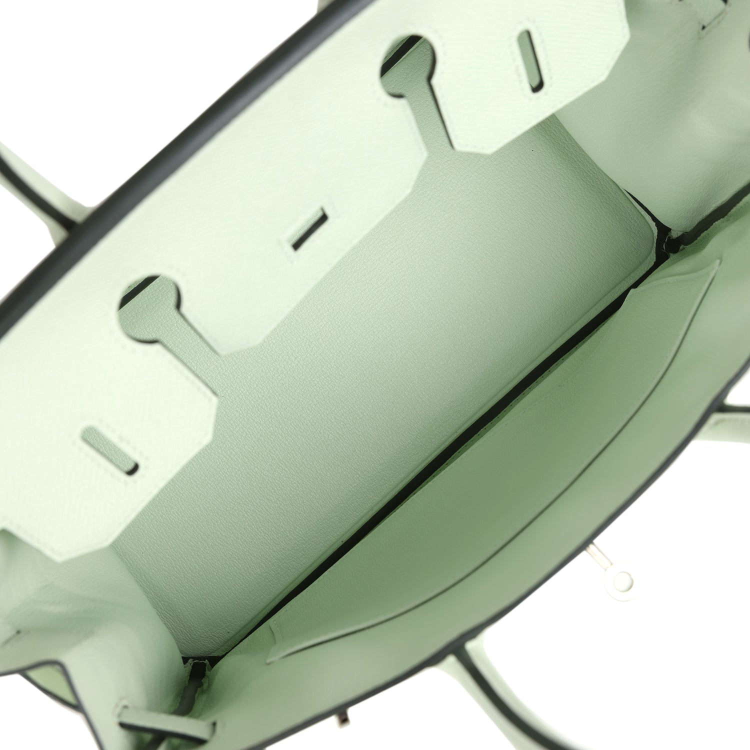 This Birkin is in Vert Fizz epsom leather with palladium hardware and has tonal stitching, front flap, two straps with center toggle closure, clochette with lock and two keys, and double rolled handles.