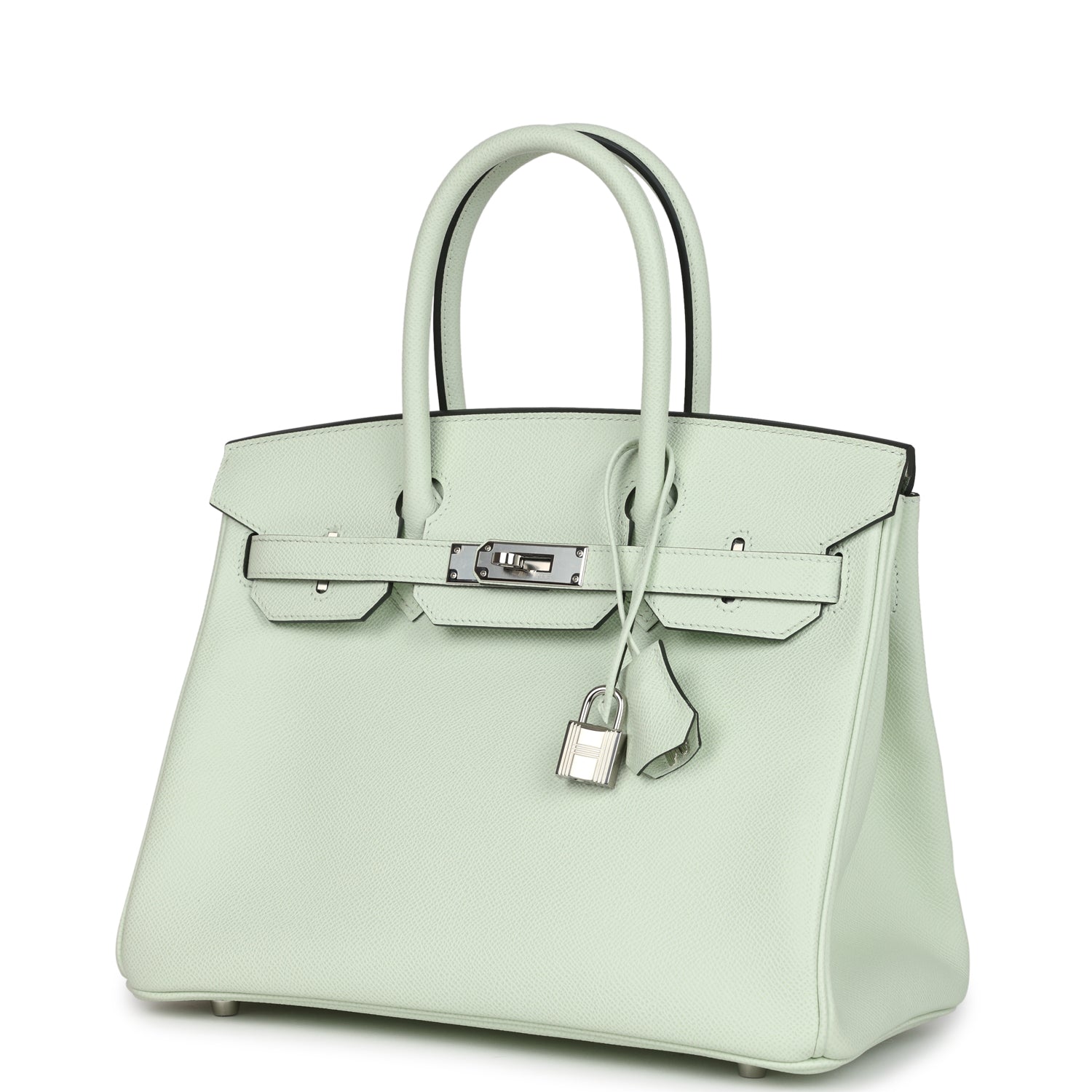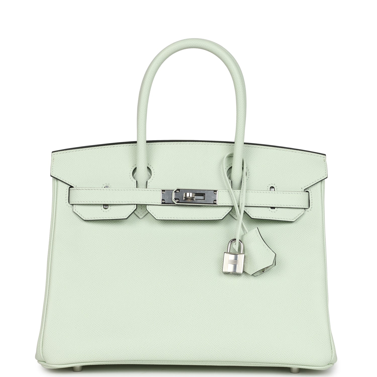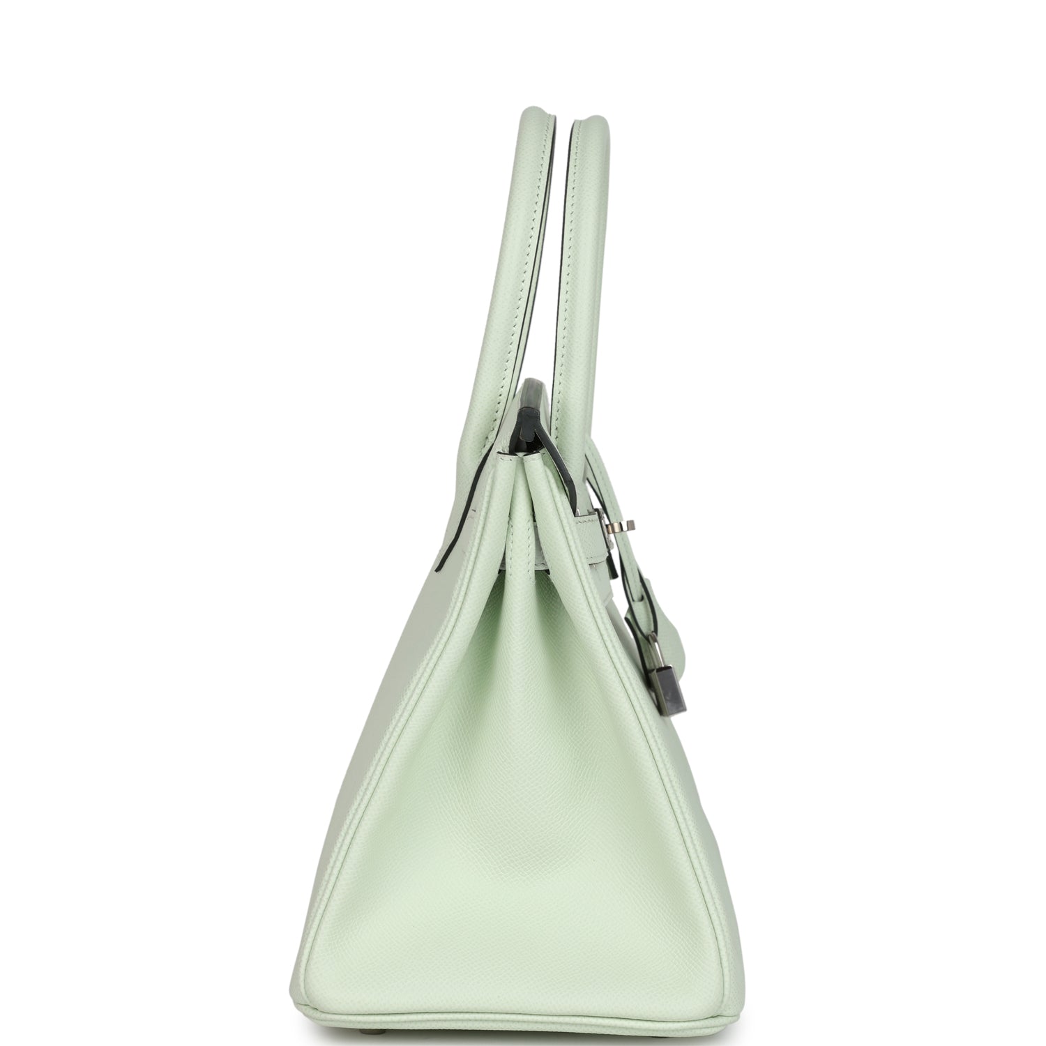 This Birkin is in Vert Fizz epsom leather with palladium hardware and has tonal stitching, front flap, two straps with center toggle closure, clochette with lock and two keys, and double rolled handles.