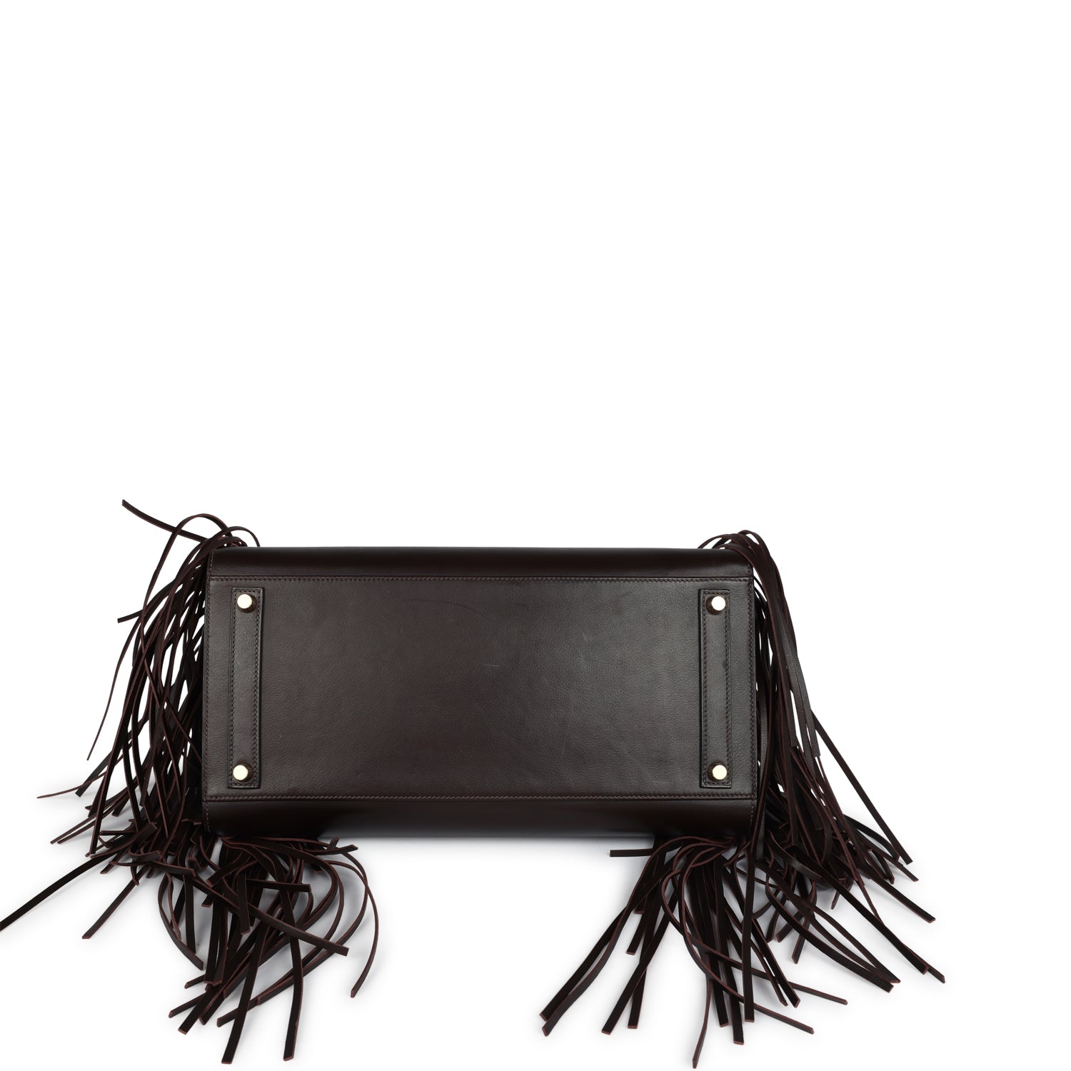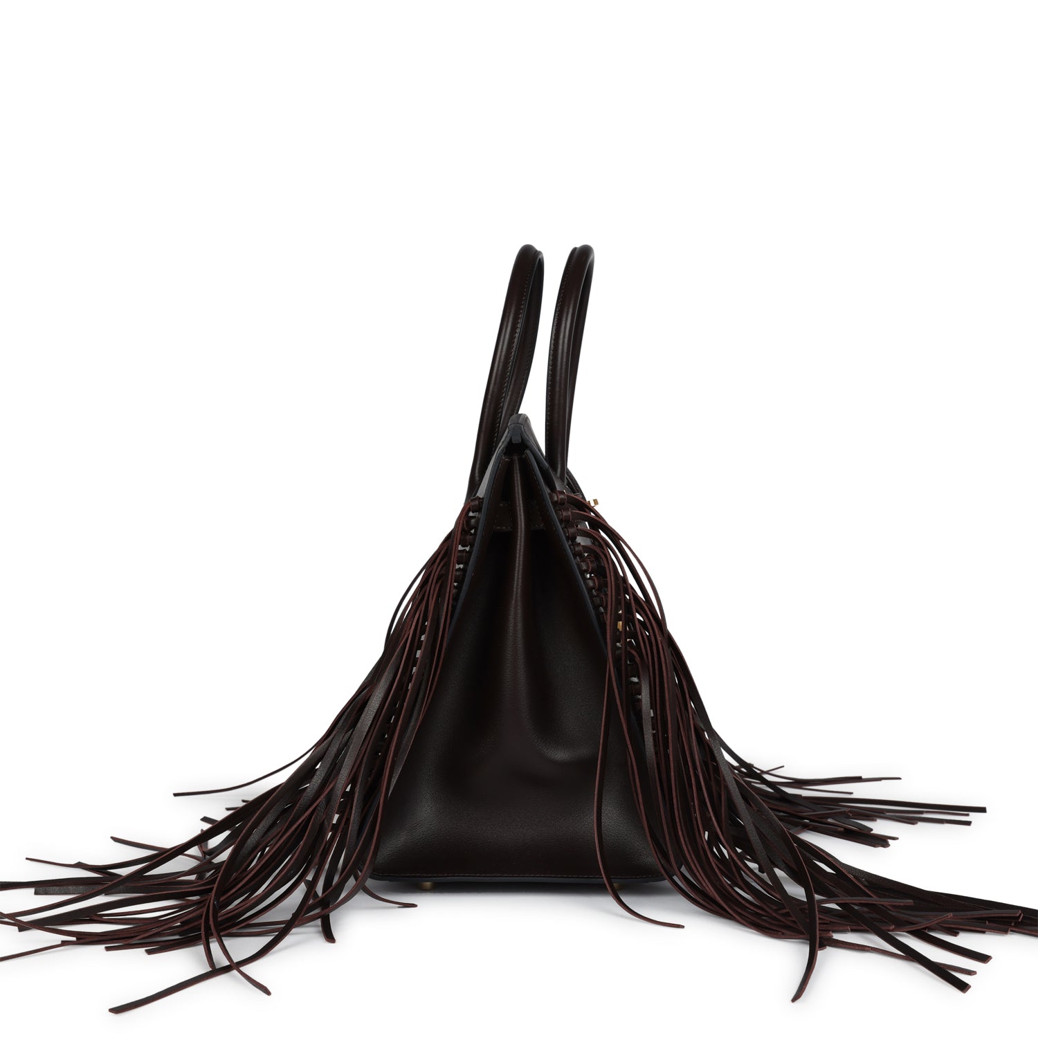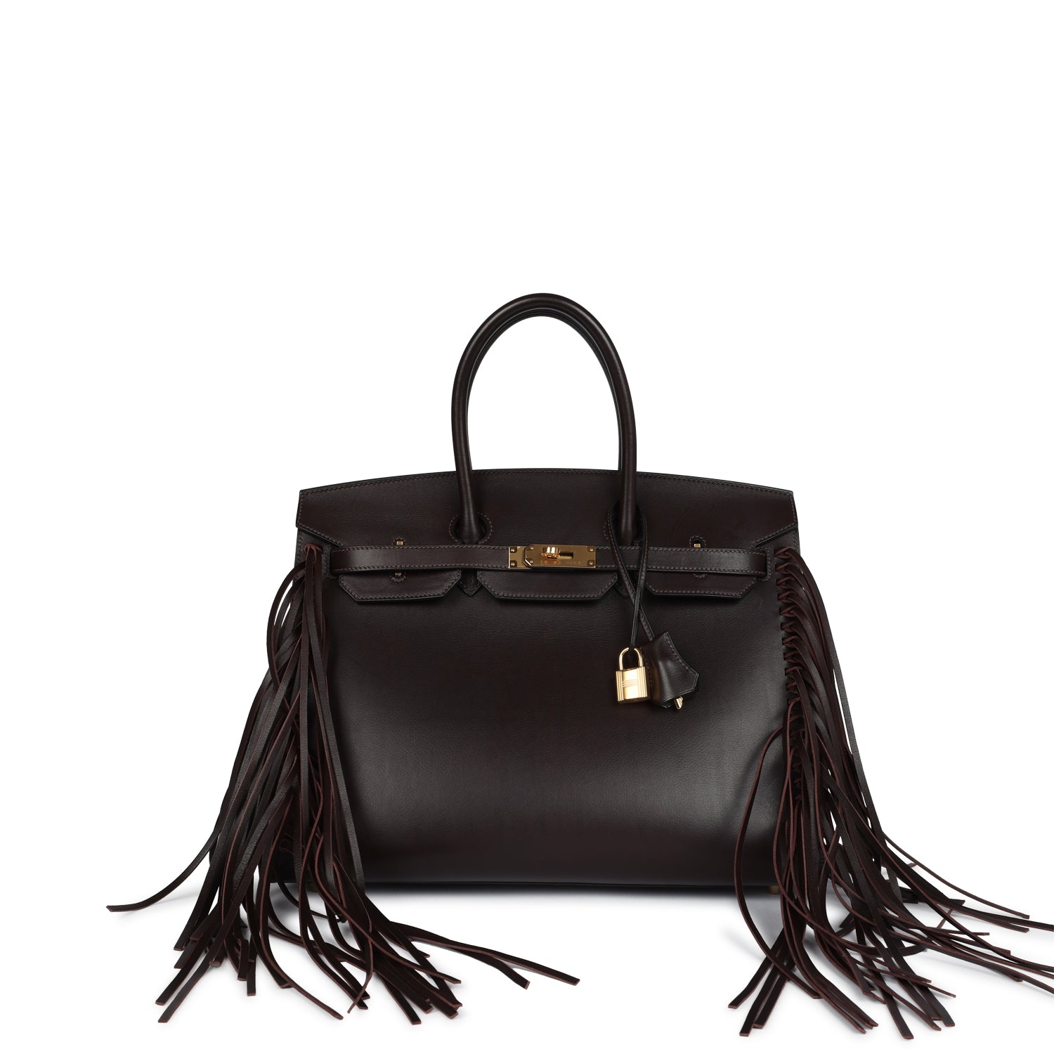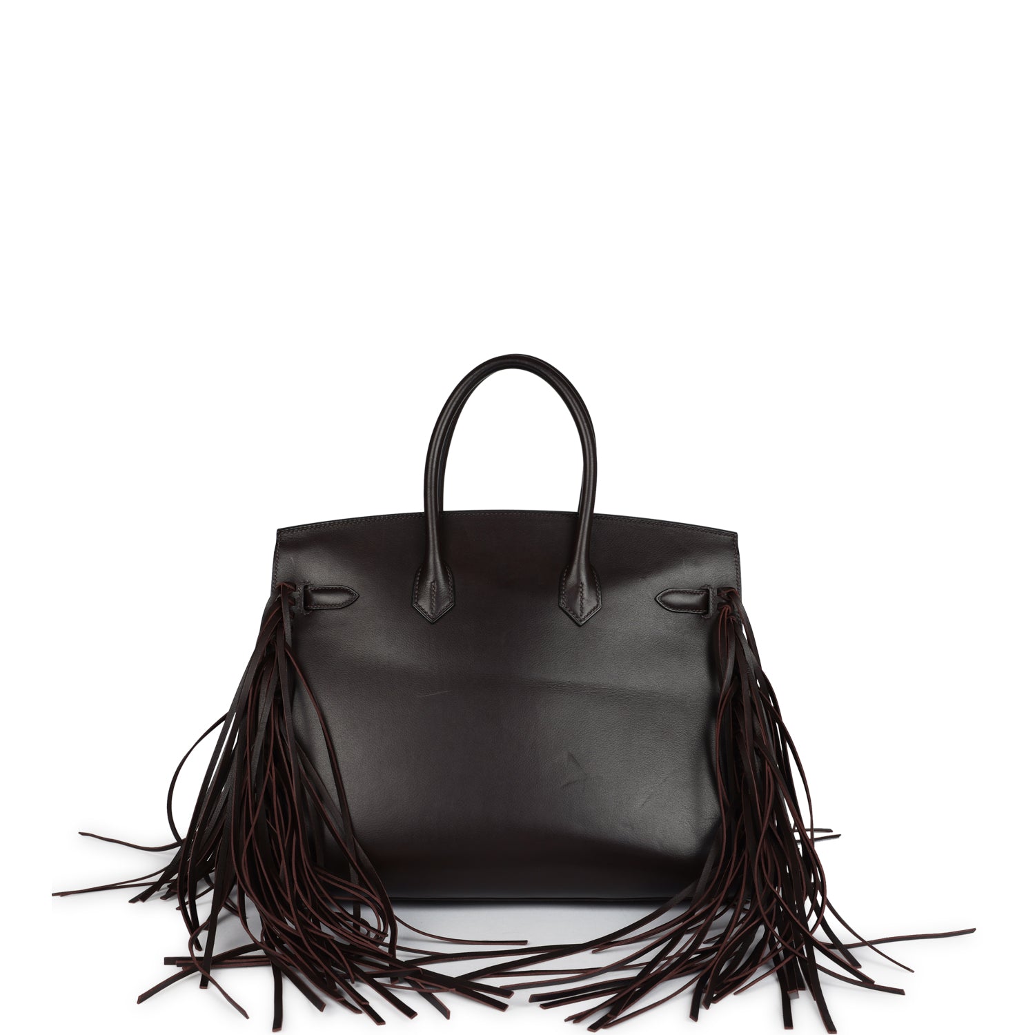 Anate Birkin is in Chocolat Evergrain leather with gold hardware and has tonal stitching, fringe side detailing on front and back, front flap, two straps with center toggle closure, clochette with lock and two keys, and double rolled handles.