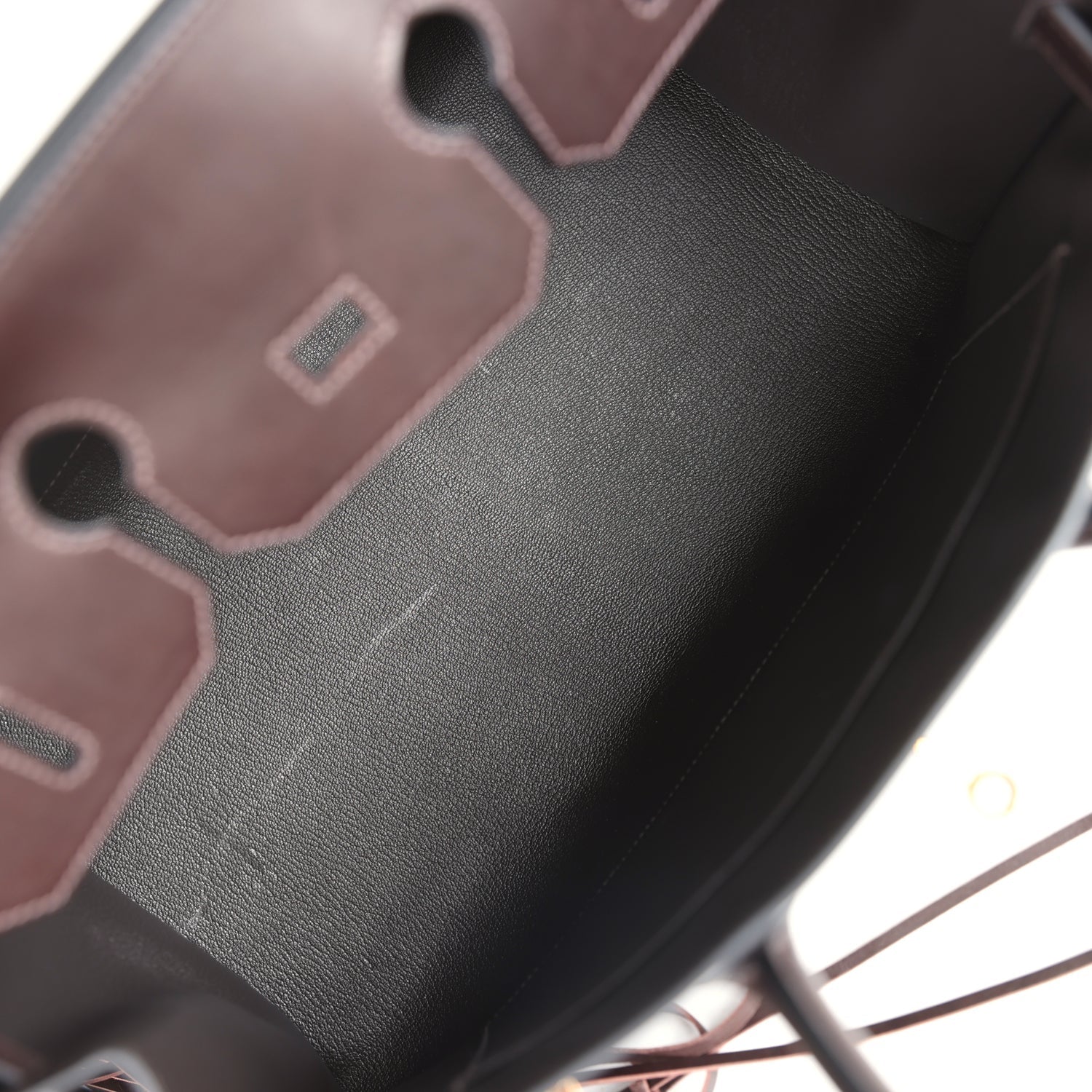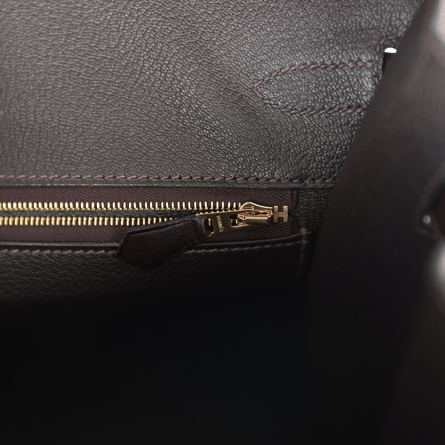 The interior is lined with Chocolat chevre and has one zip pocket with an Hermes engraved zipper pull and an open pocket on the opposite side.
