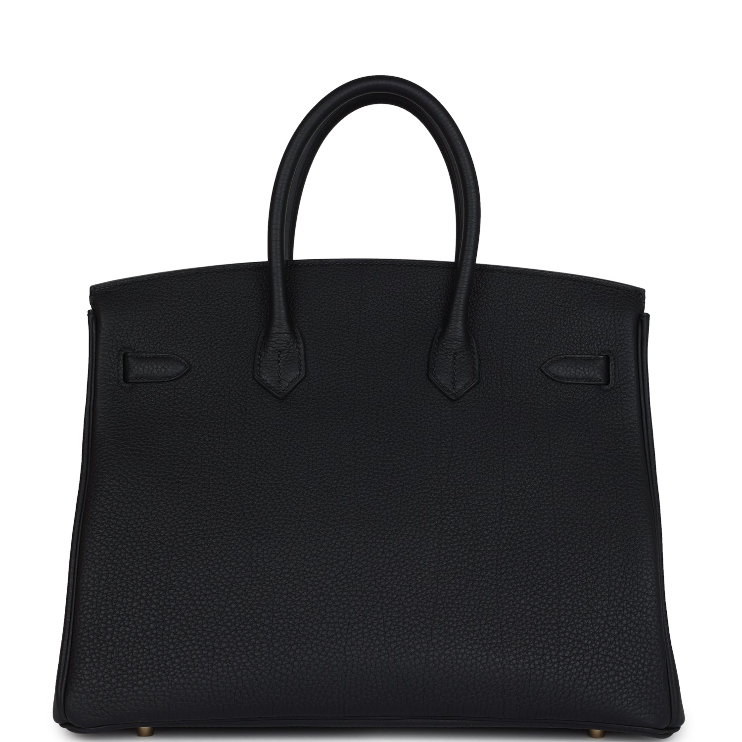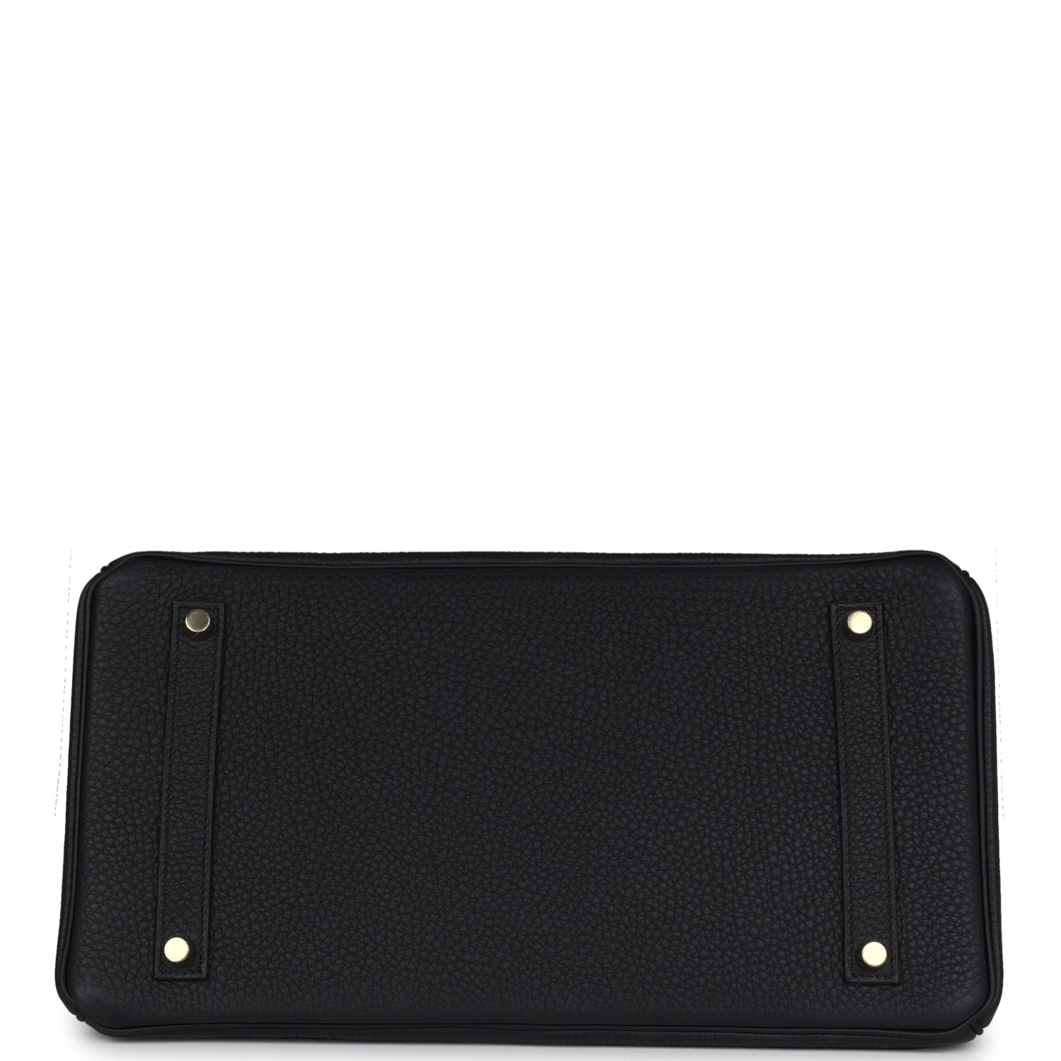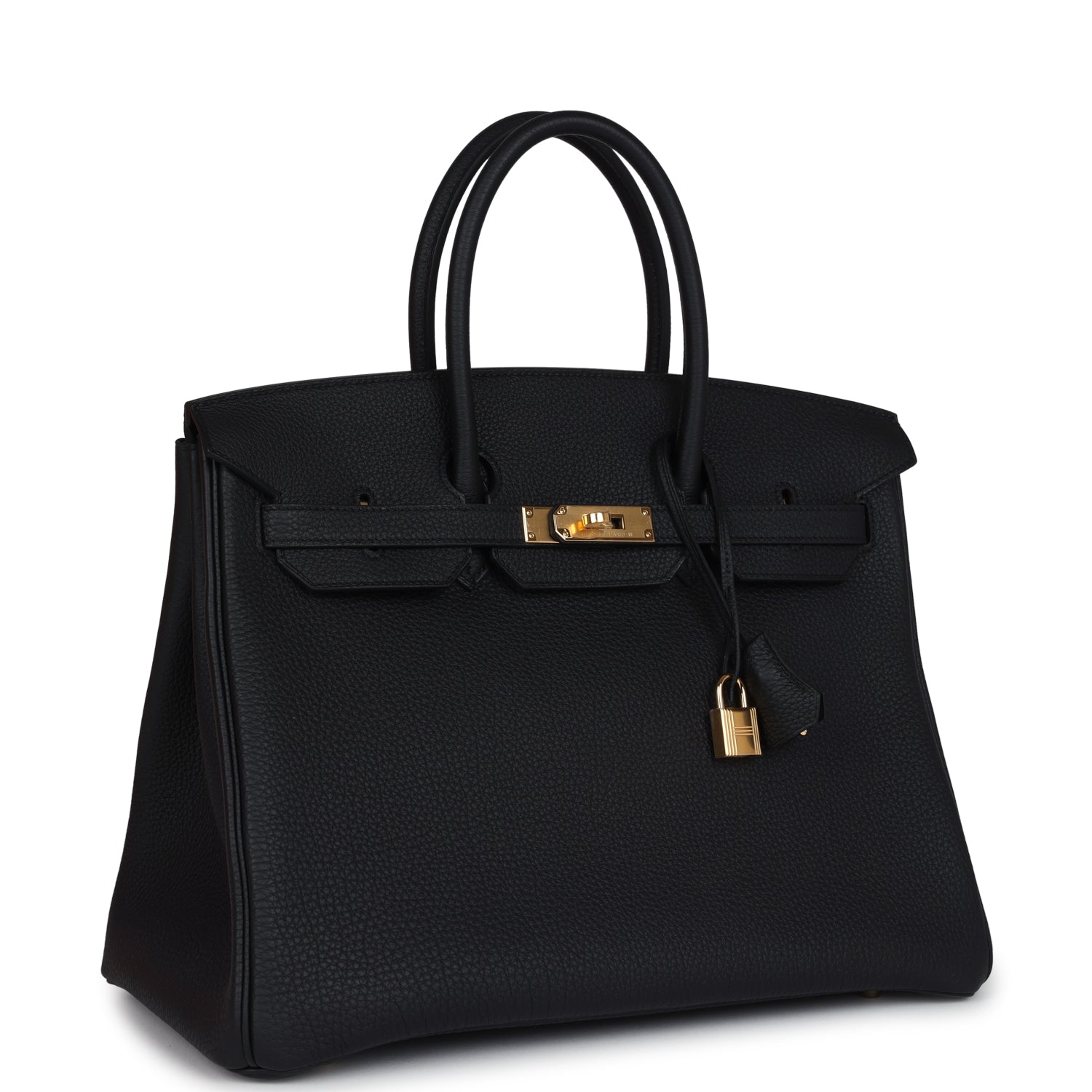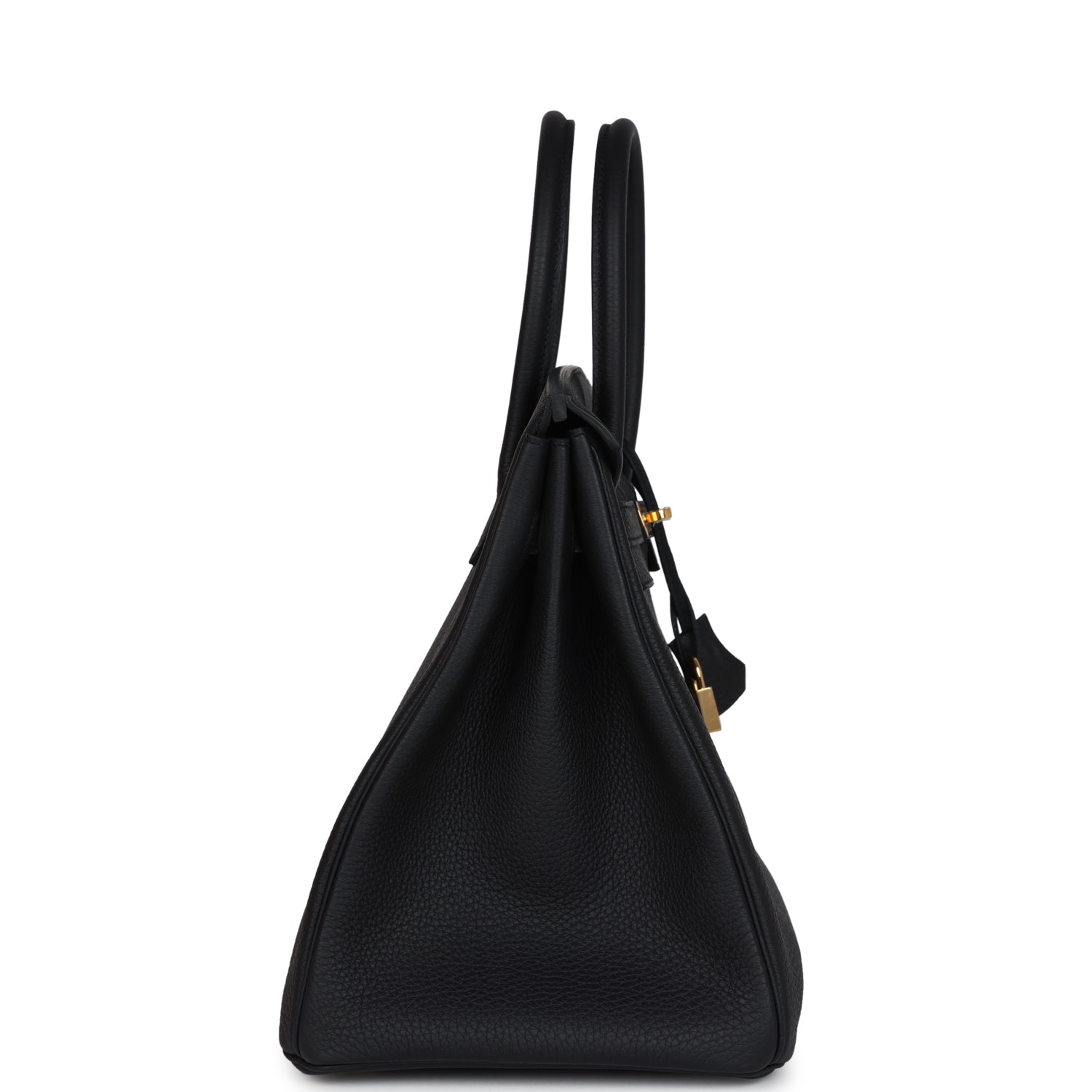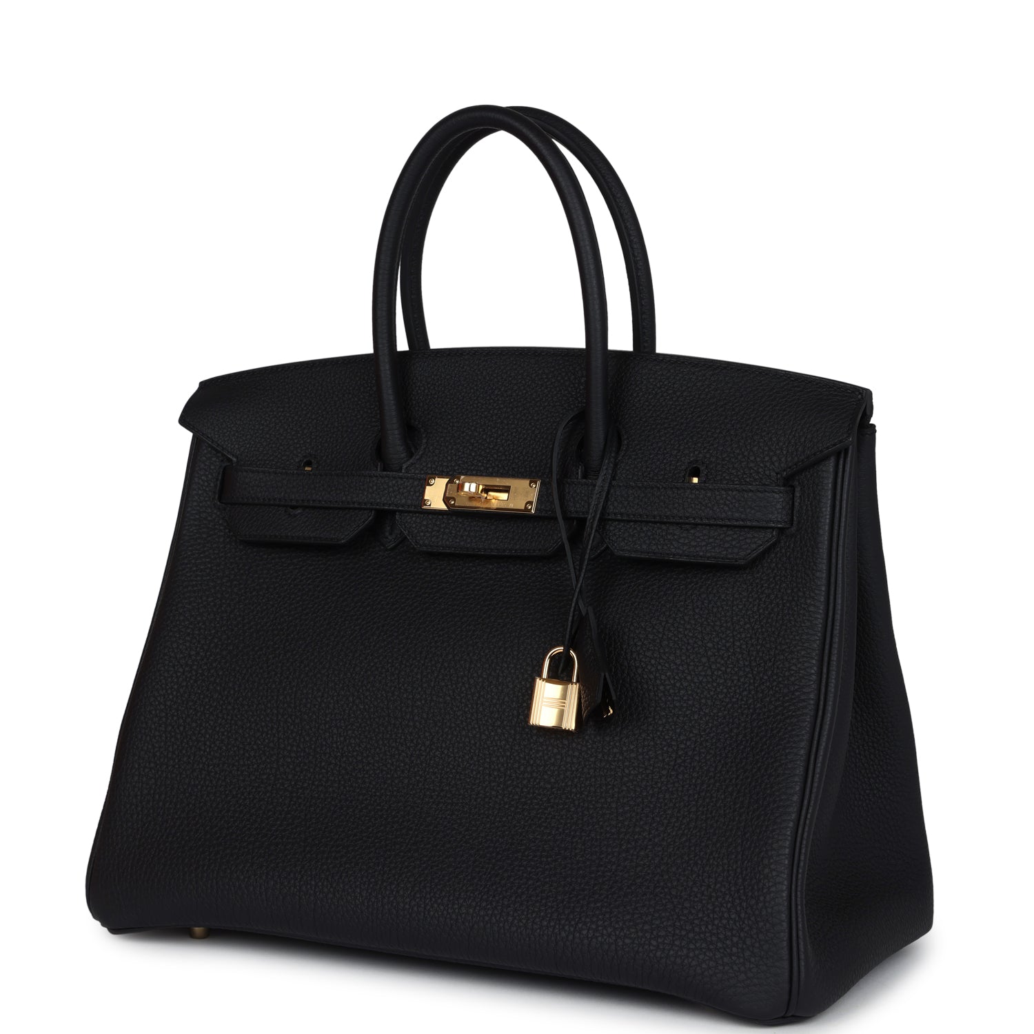 This Birkin is in Black togo leather with gold hardware and has tonal stitching, front flap, two straps with center toggle closure, clochette with lock and two keys, and double rolled handles.