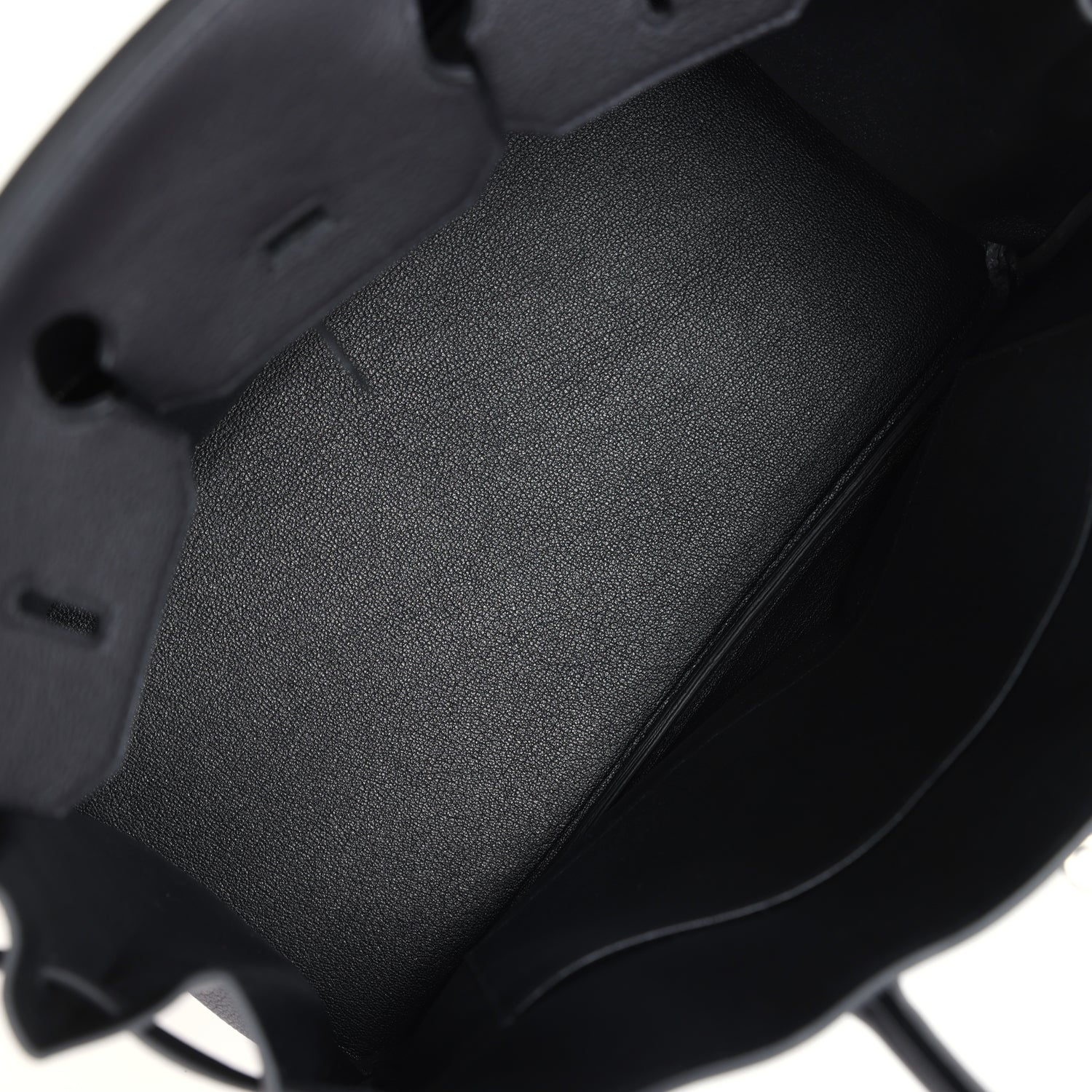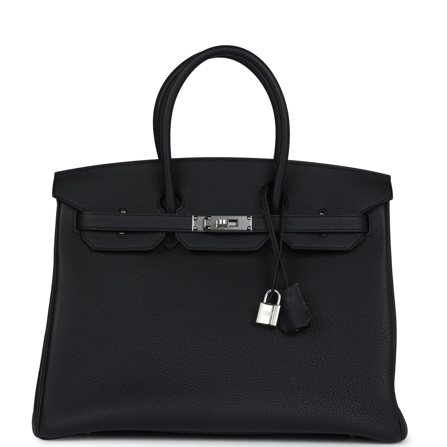 This Birkin is in Black togo leather with palladium hardware and has tonal stitching, front flap, two straps with center toggle closure, clochette with lock and two keys, and double rolled handles.
