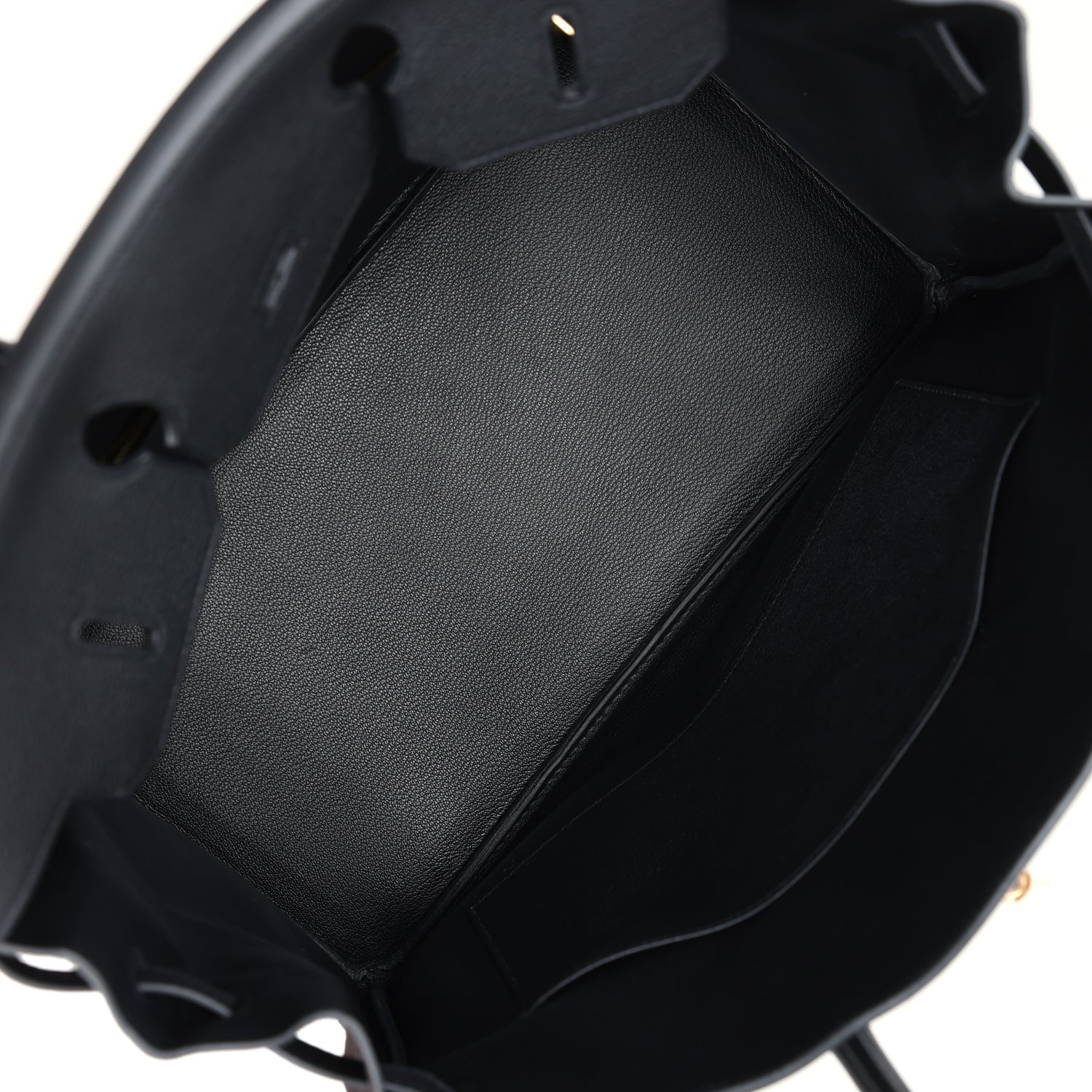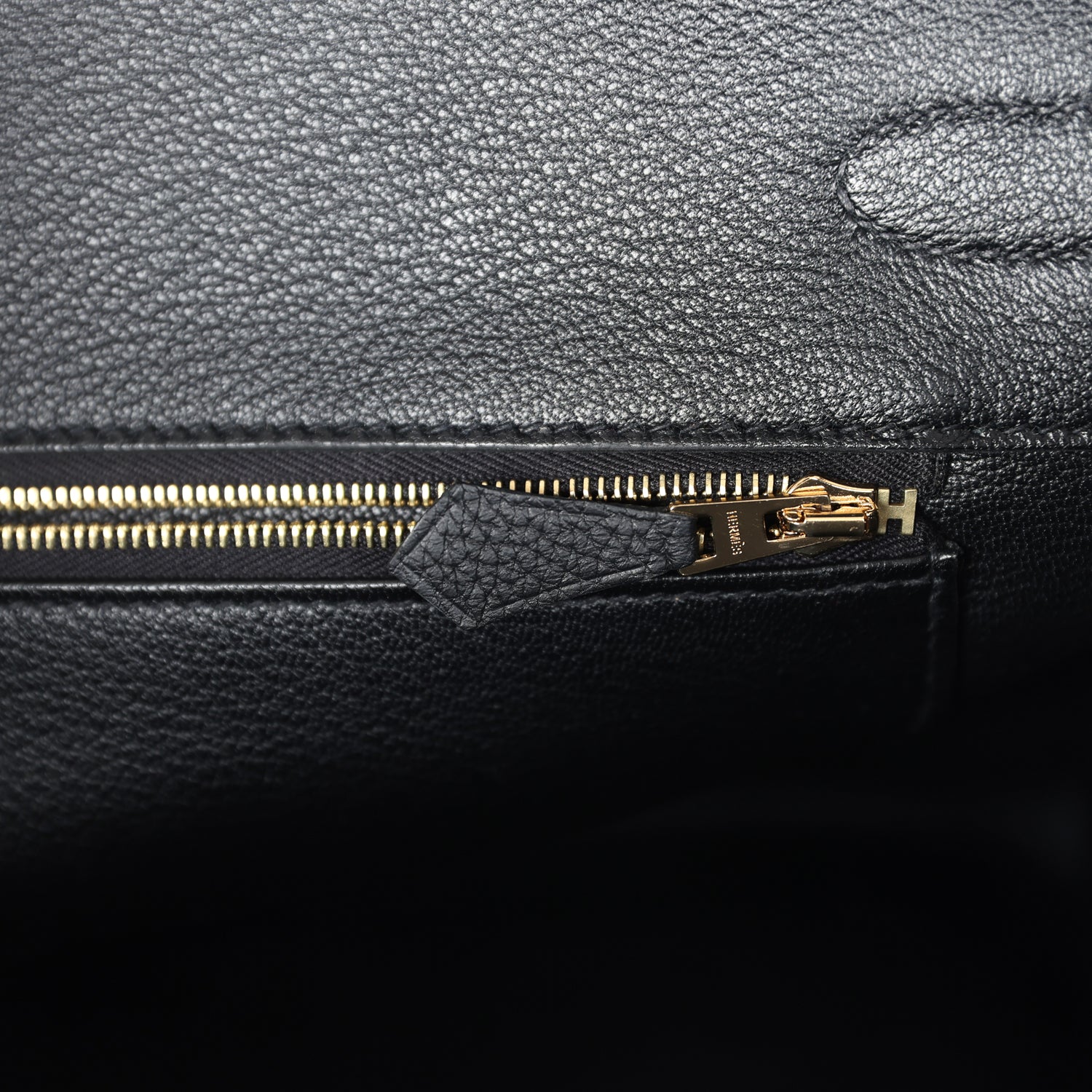 The interior is lined with Black chevre and has one zip pocket with an Hermes engraved zipper pull and an open pocket on the opposite side.