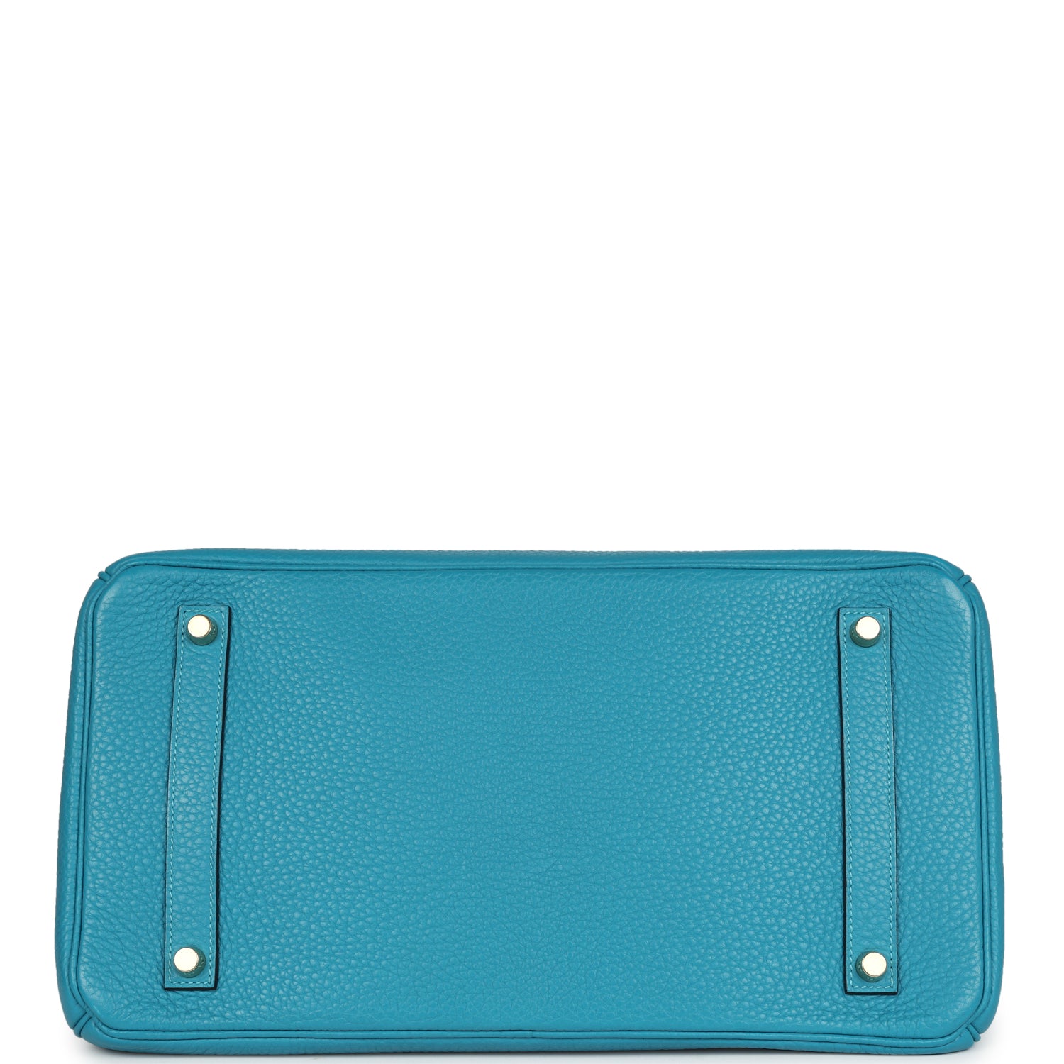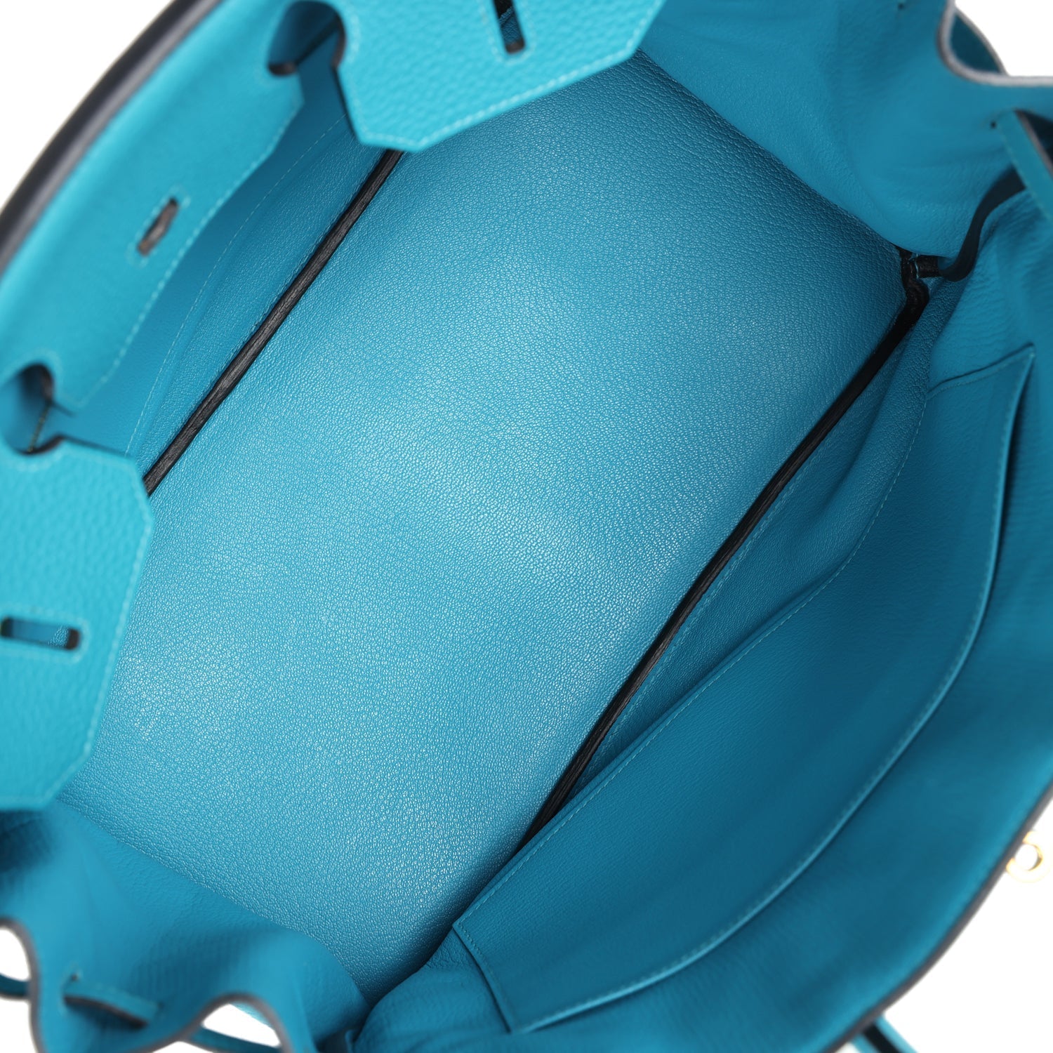 This Birkin is in Bleu Izmir clemence leather with gold hardware and has tonal stitching, front flap, two straps with center toggle closure, clochette with lock and two keys, and double rolled handles.