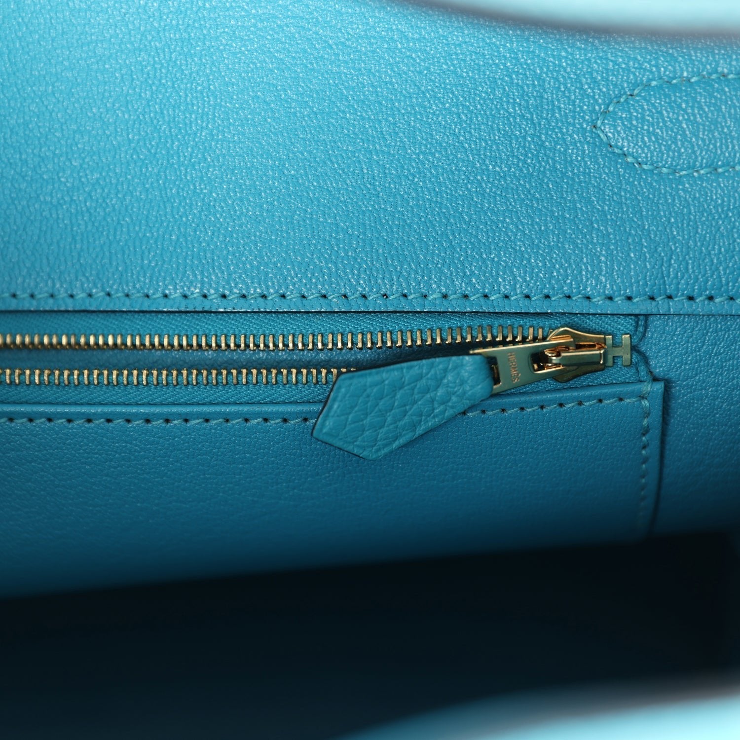 The interior is lined with Bleu Izmir chevre and has one zip pocket with an Hermes engraved zipper pull and an open pocket on the opposite side.