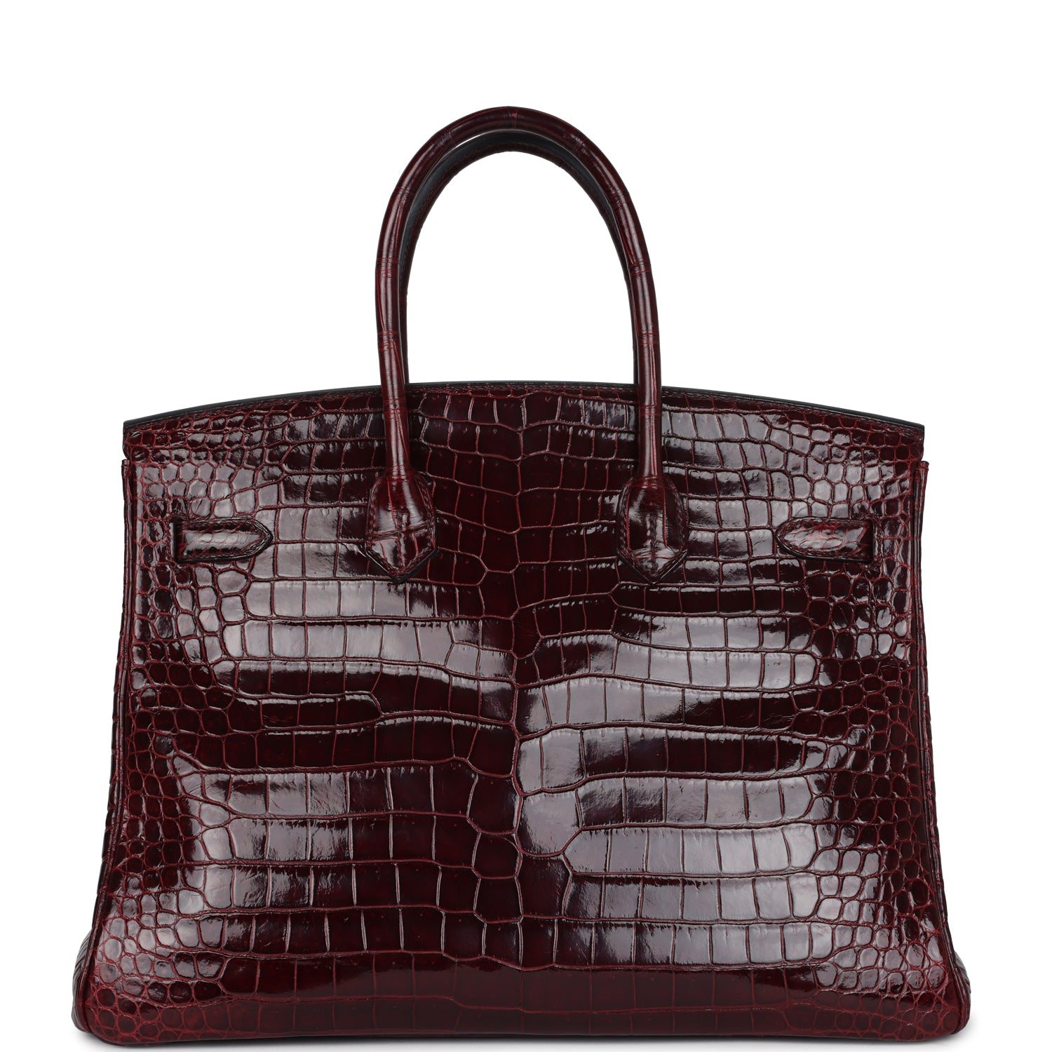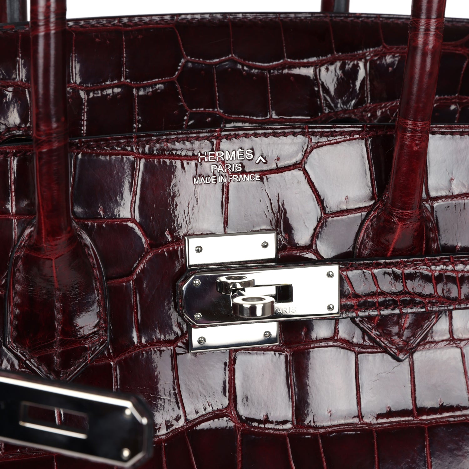 Birkin is of Bordeaux Shiny Porosus Crocodile leather with palladium hardware and features tonal stitching, front flap, two straps with center toggle closure, clochette with lock and two keys, and double rolled handles.