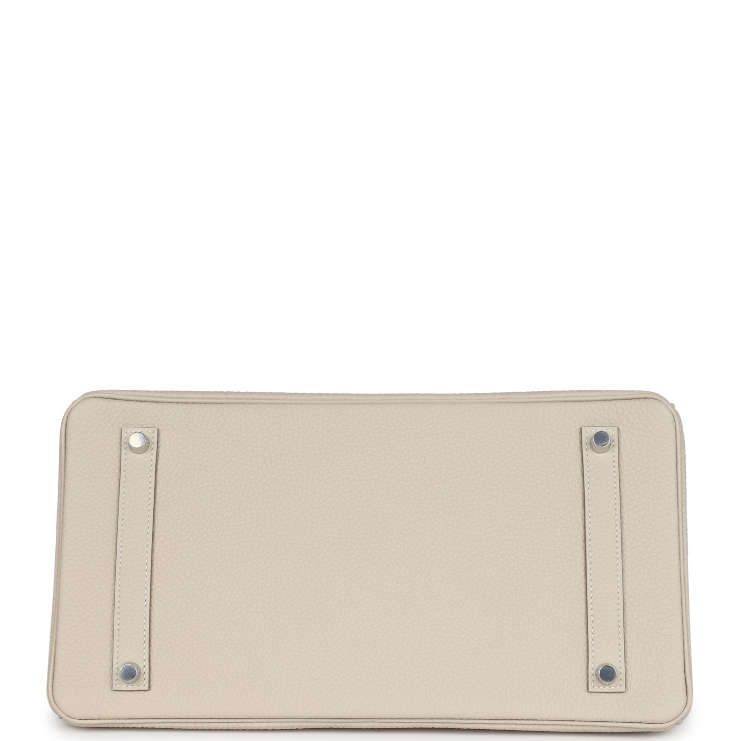 Birkin is in Craie togo leather with palladium hardware and has tonal stitching, front flap, two straps with center toggle closure, clochette with lock and two keys, and double rolled handles.
