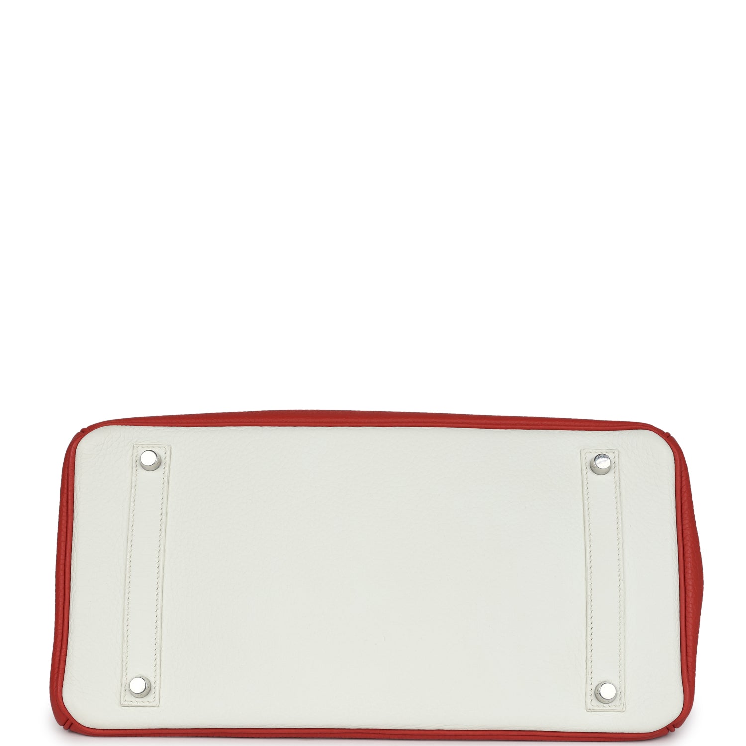 Birkin is in Eclat is in Sanguine and White clemence with palladium hardware, contrast stitching, front flap, two straps with center toggle closure, clochette with lock and two keys and double rolled handles.
