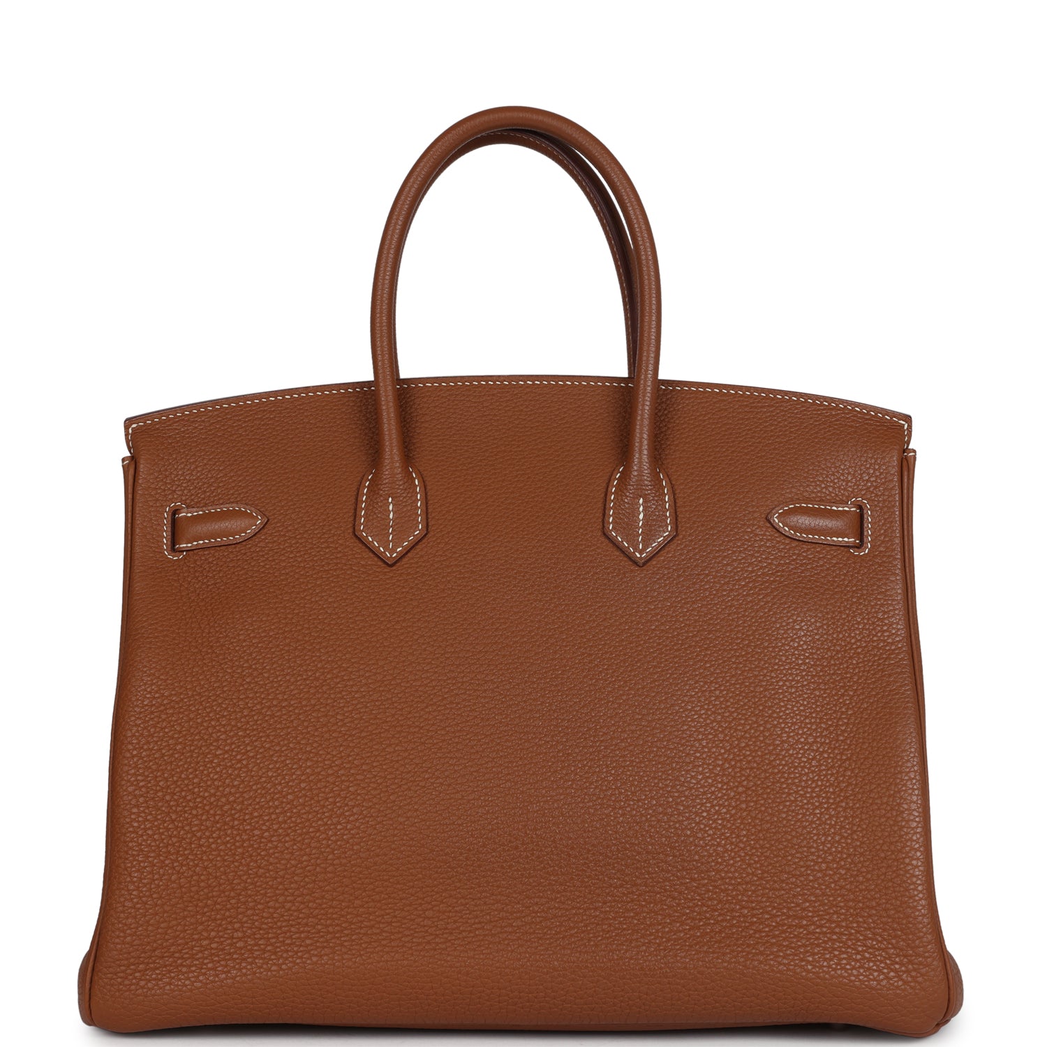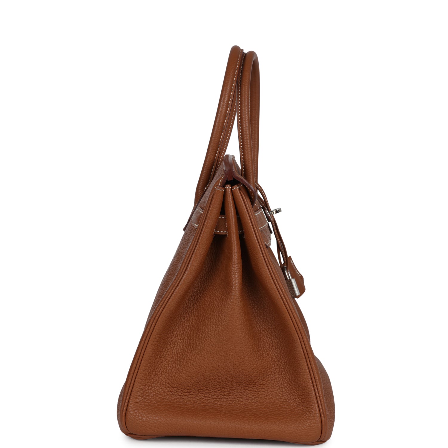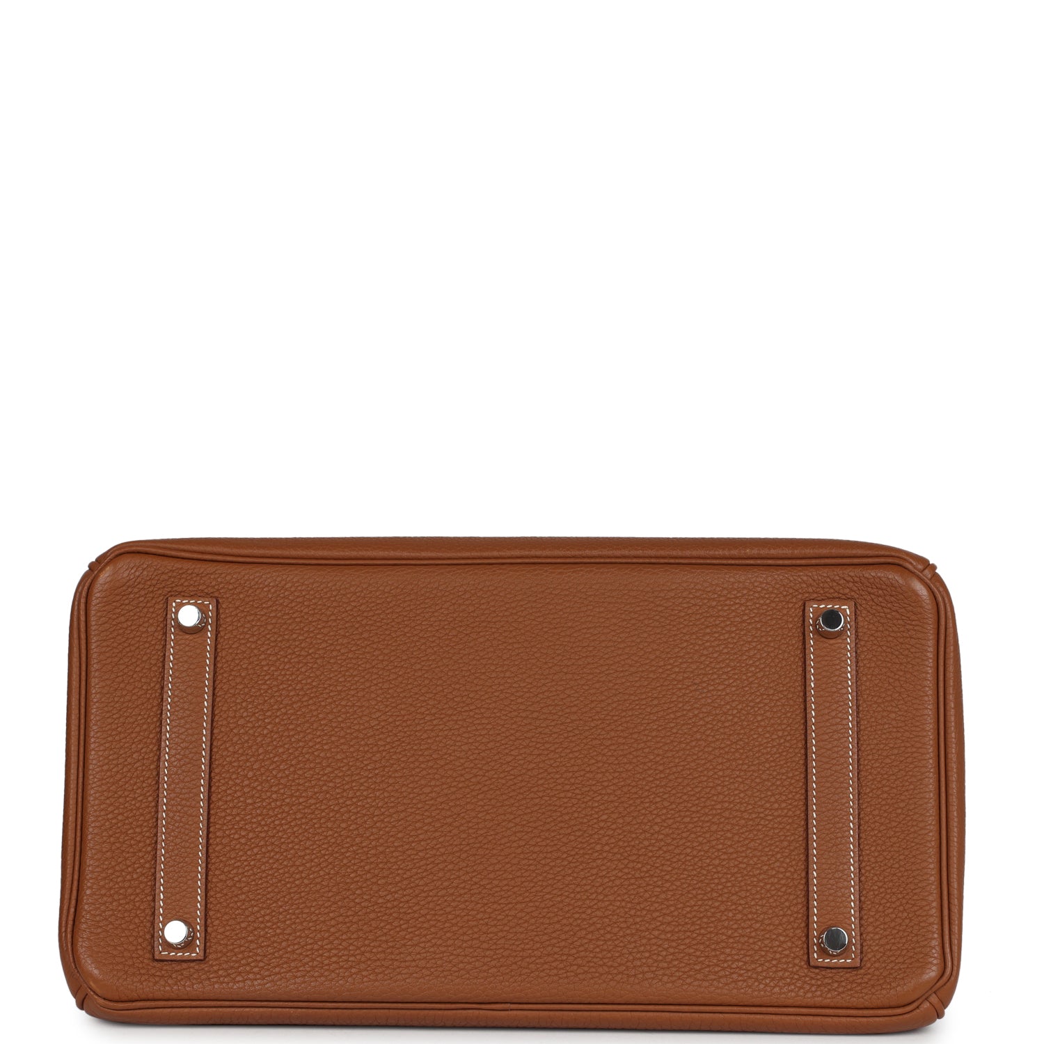 Birkin is in Gold togo leather with palladium hardware and has contrast stitching, front flap, two straps with center toggle closure, clochette with lock and two keys, and double rolled handles.
