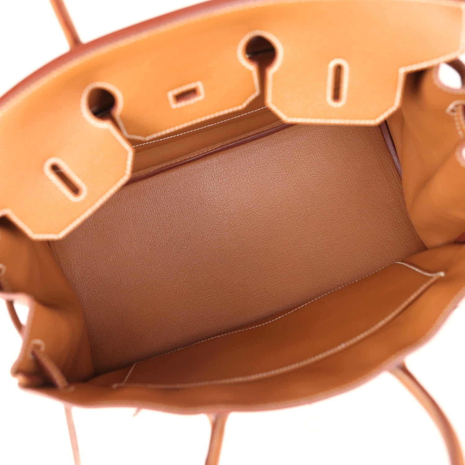 This Birkin is in Gold togo leather with palladium hardware and has contrast stitching, two straps with front toggle closure, clochette with lock and two keys and double rolled handles.