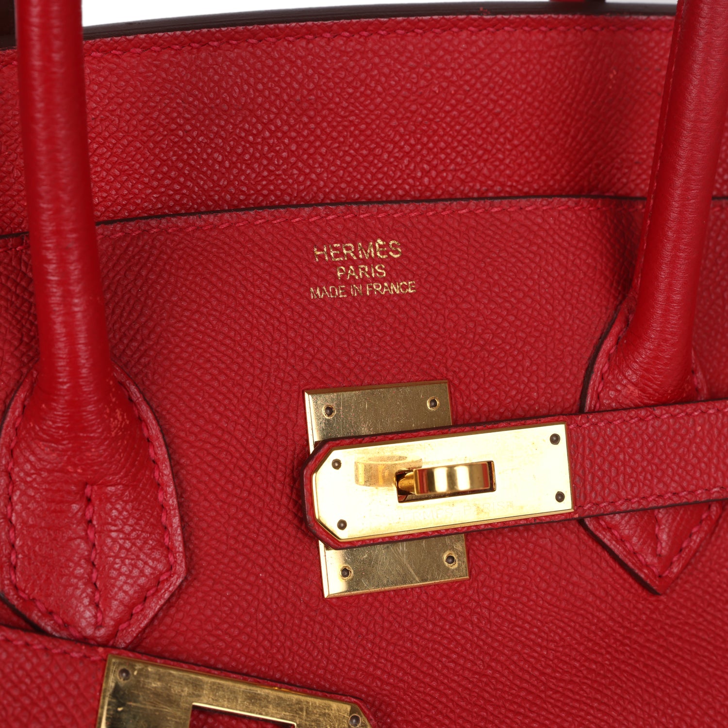 Birkin is in Rouge Casaque epsom leather with gold hardware and has tonal stitching, front flap, two straps with center toggle closure, clochette with lock and two keys, and double rolled handles.