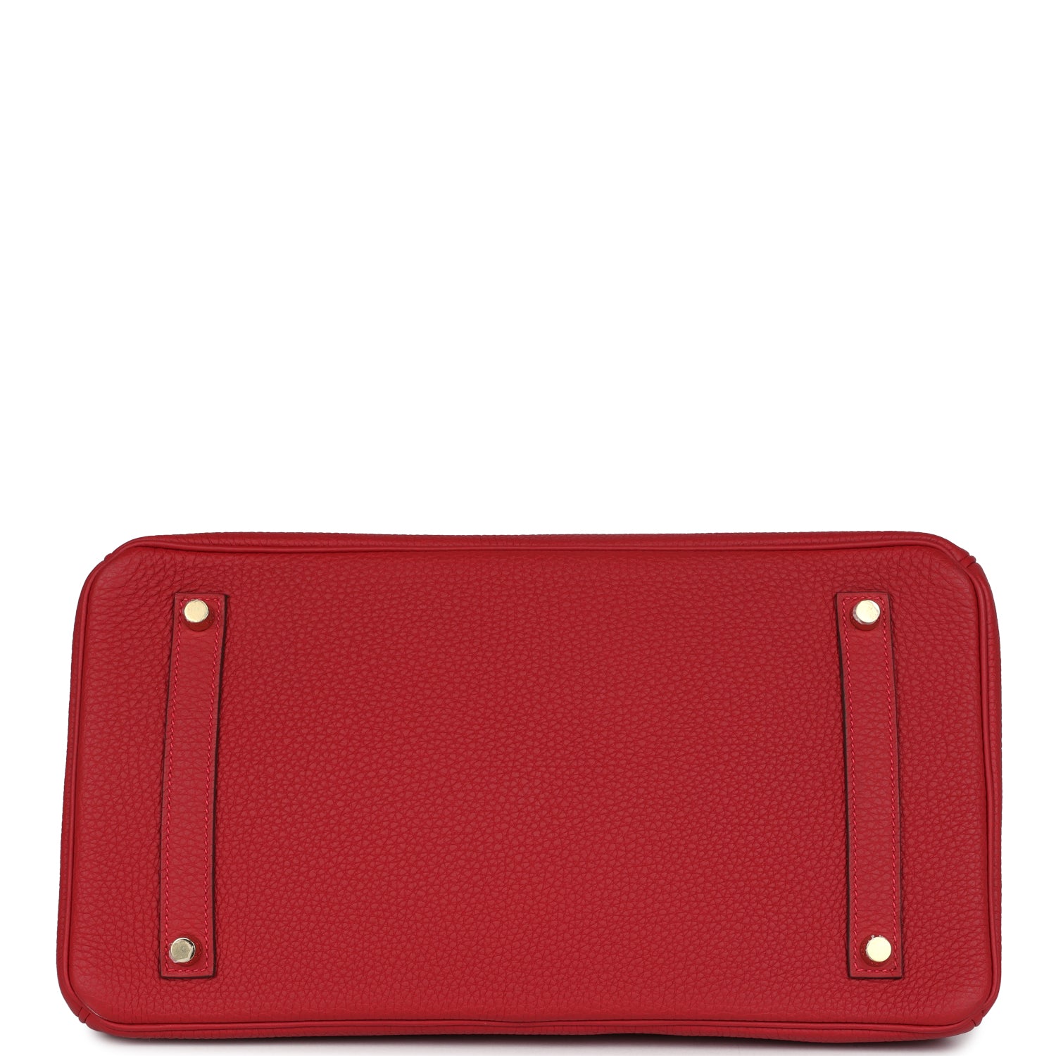 Birkin is in Rouge Casaque togo leather with gold hardware and tonal stitching, front flap, two straps with center toggle closure, clochette with lock and two keys, and double rolled handles.
