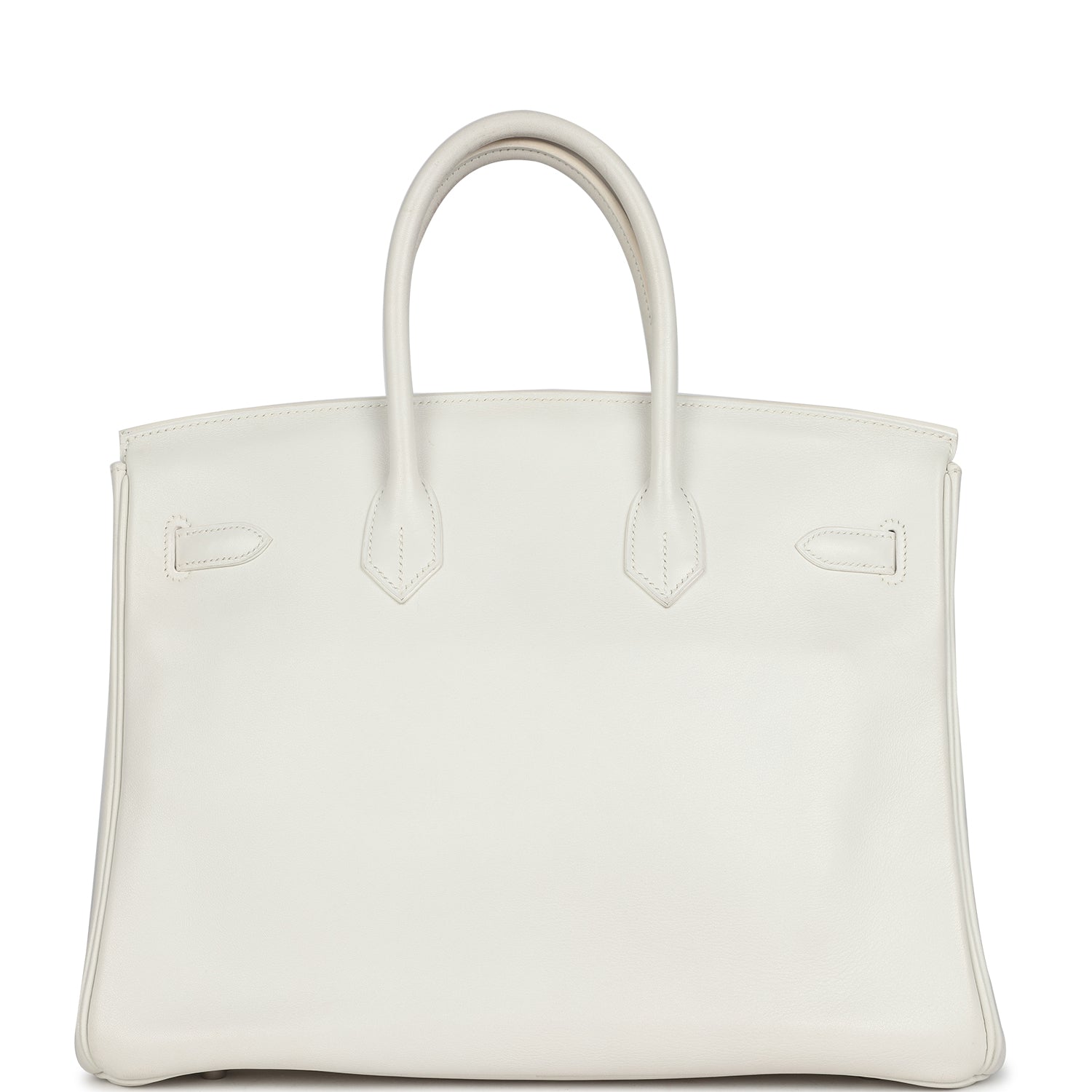 Birkin is in White swift leather with palladium hardware and has tonal stitching, front flap, two straps with center toggle closure, clochette with lock and two keys, and double rolled handles.
