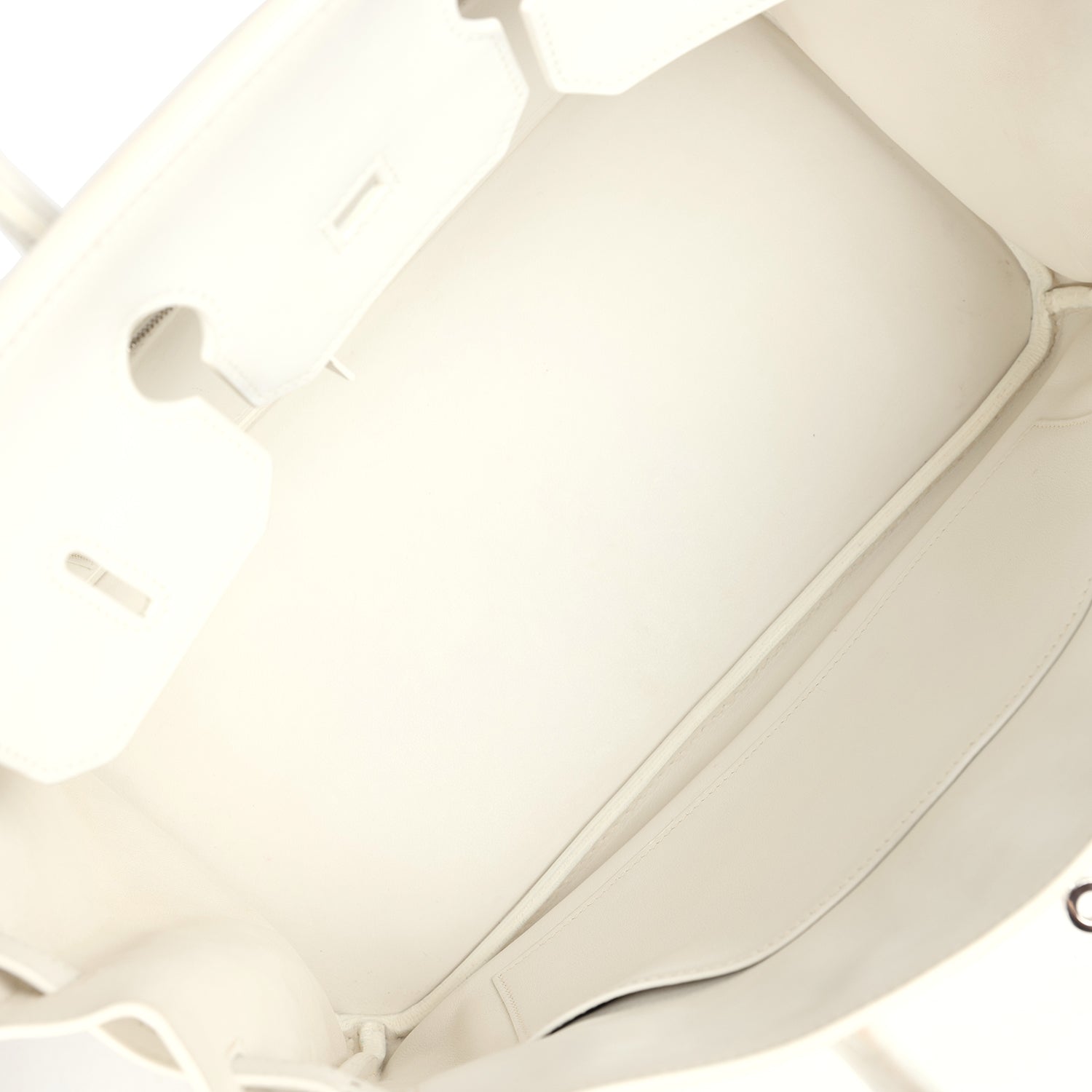 The interior is lined with White swift leather and has one zip pocket with an Hermes engraved zipper pull and an open pocket on the opposite side.