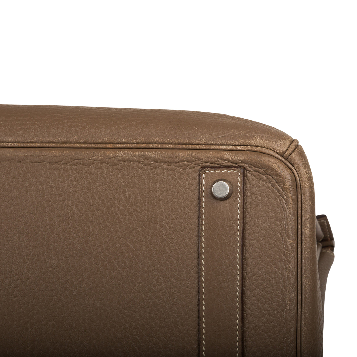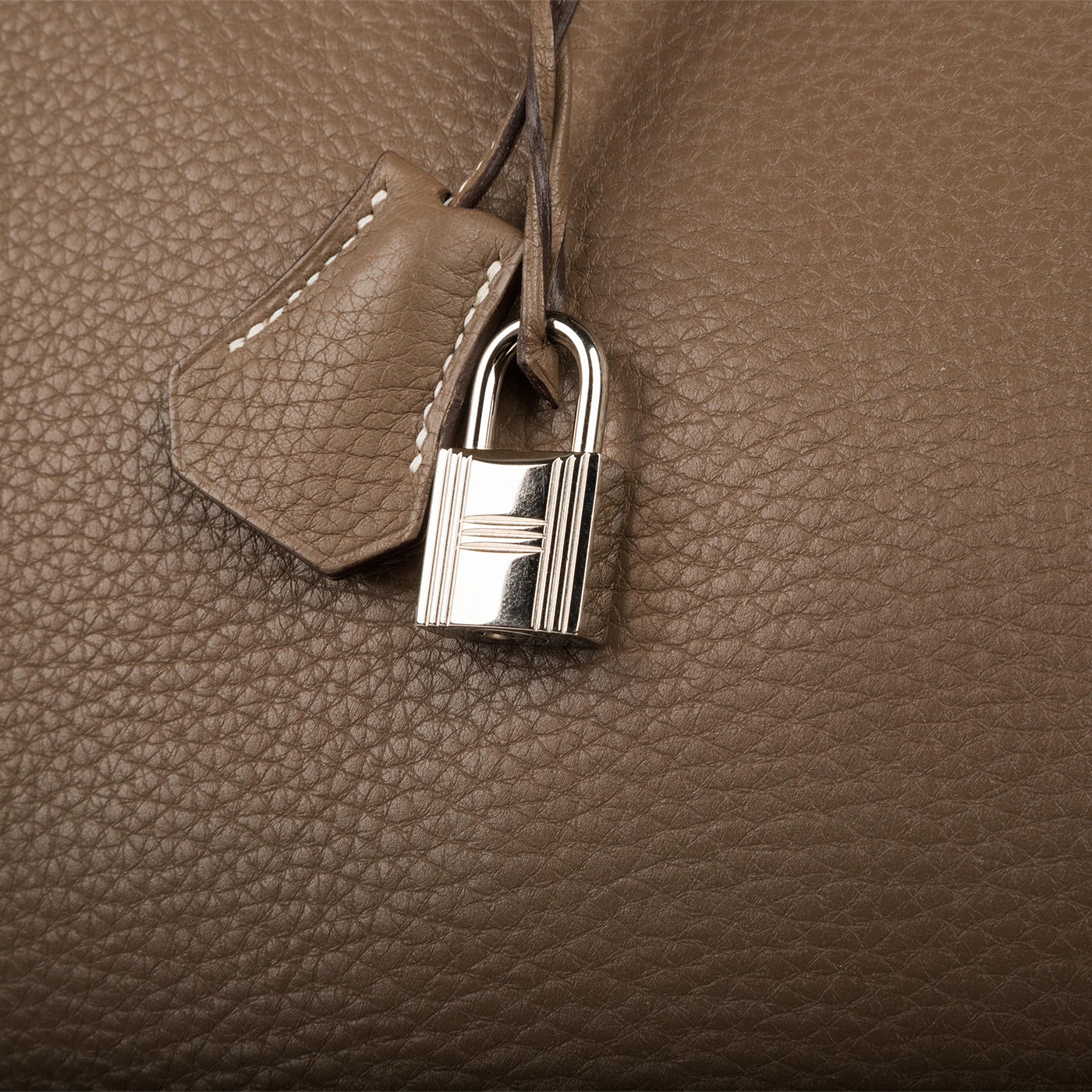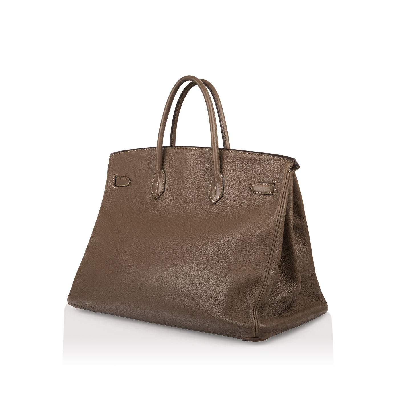 The fashion house boldly celebrates leather, sport and refined elegance; all of which are embodied by the Etoupe Birkin 40. Beautifully crafted from Etoupe togo leather and eloquently complemented with the fashion house’s iconic palladium hardware; the handbag oozes sophistication. Its exterior features their unique twist-lock close and rolled leather handles. The handbag’s interior features yet more luxurious Etouple leather lining and a very spacious storage compartment; alongside a large zip pocket and a patch pocket.