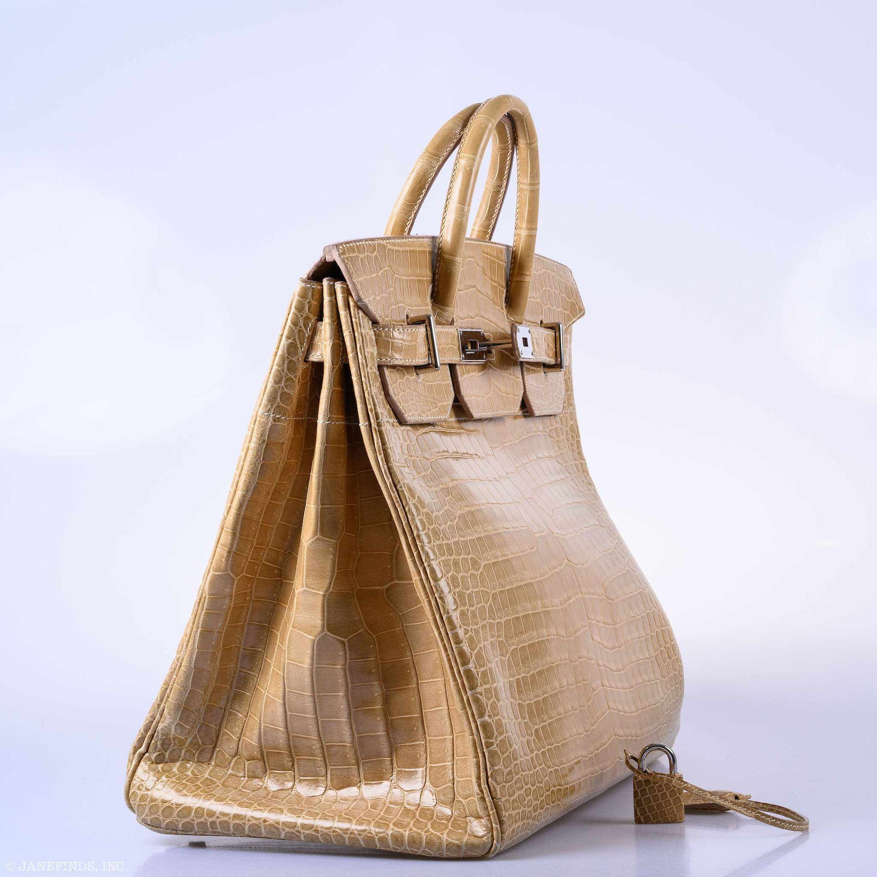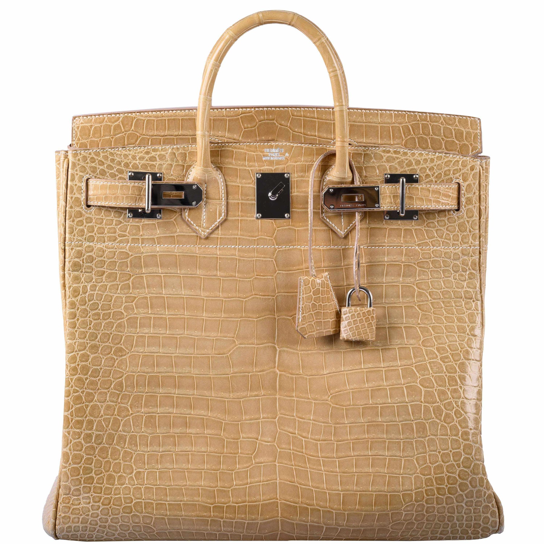 The HAC Birkin, or Haut a Courroies meaning "belt top" in French, was the original design from which the famous Birkin bag sprung. The HAC was designed in the early days of Hermès as a large bag meant to carry a saddle. In the century of so since it's inception, the HAC has been issued in numerous sizes and materials, for a time often coinciding with similar Birkin bags being made at the time. This very special and rare Poussier color in shiny Porosus Crocodile and Palladium hardware. This HAC is impossible to get at Hermès boutiques in this size and Porosus skin. Includes dust bag, clochette, two keys, a lock, and a clochette.