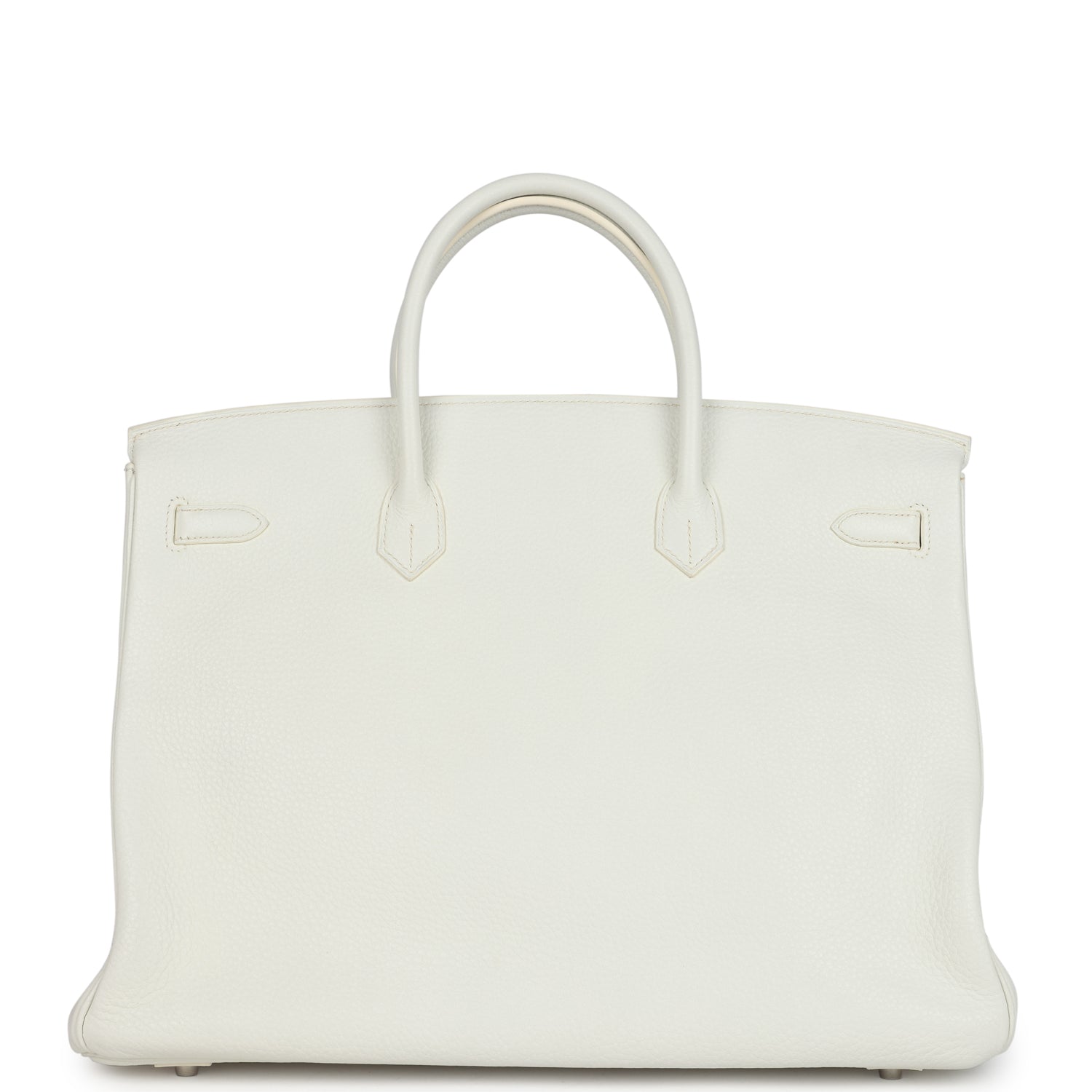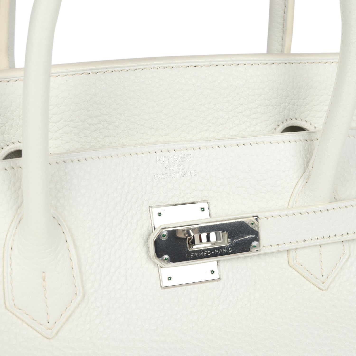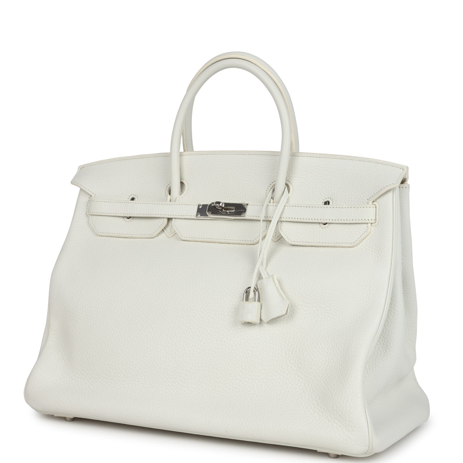 Birkin is in White clemence leather with palladium hardware and has tonal stitching, two straps with front toggle closure, clochette with lock and two keys and double rolled handles.