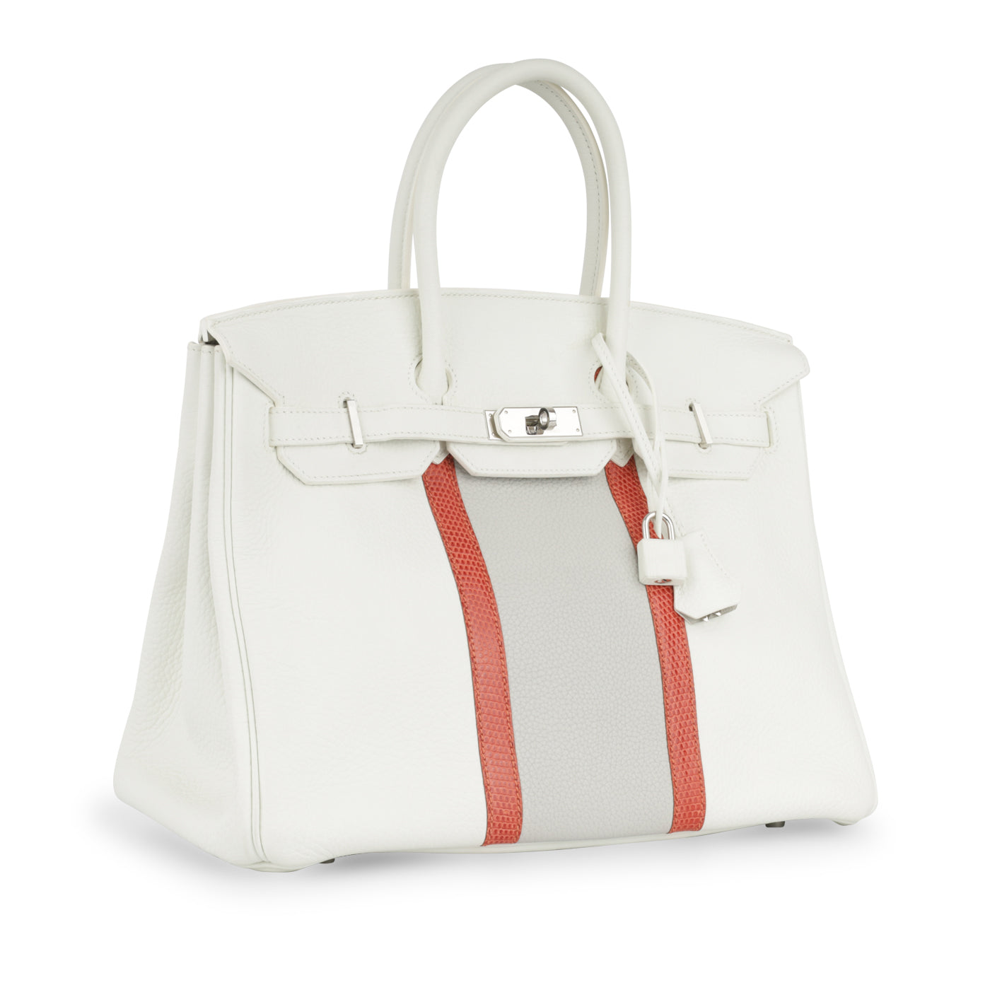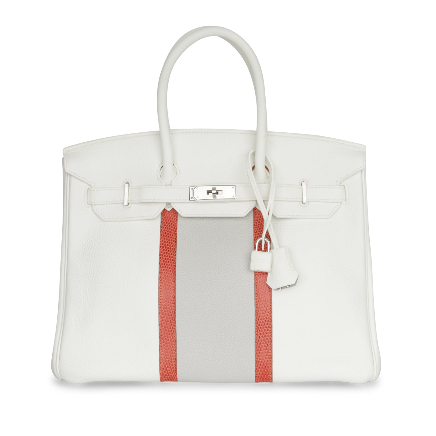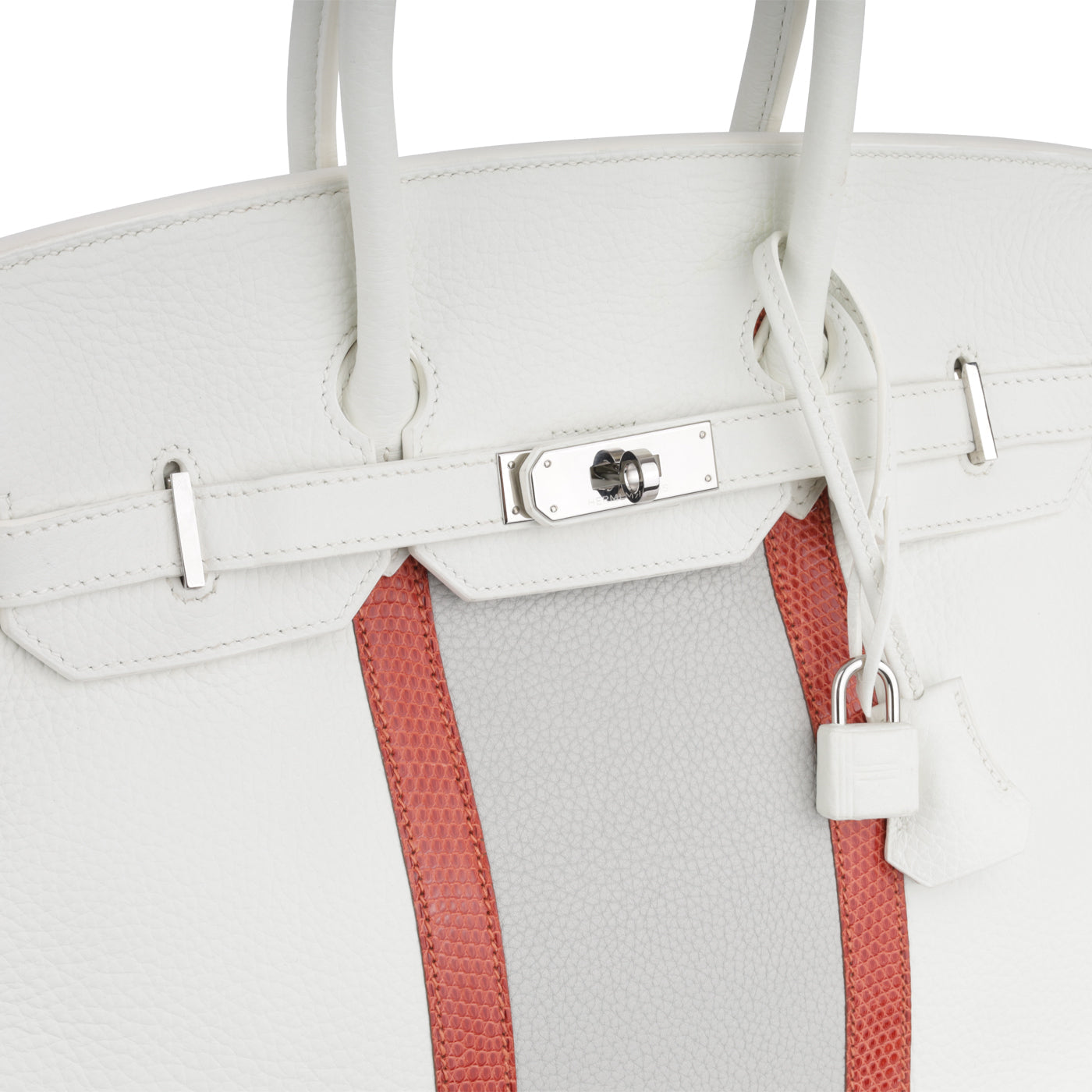 The Hermès Club Birkin is a very rare and limited edition piece released from the brand. Similarly to the touch Birkin, the Club often features a combination of their classic leathers along with exotic in its signature vertical stripes. This particular combination features Gris Perle Clemence leather with accents of Lizard in Sanguine. The perfect size for a person with lots to carry, this is simply the most sophisticated piece to carry with you.