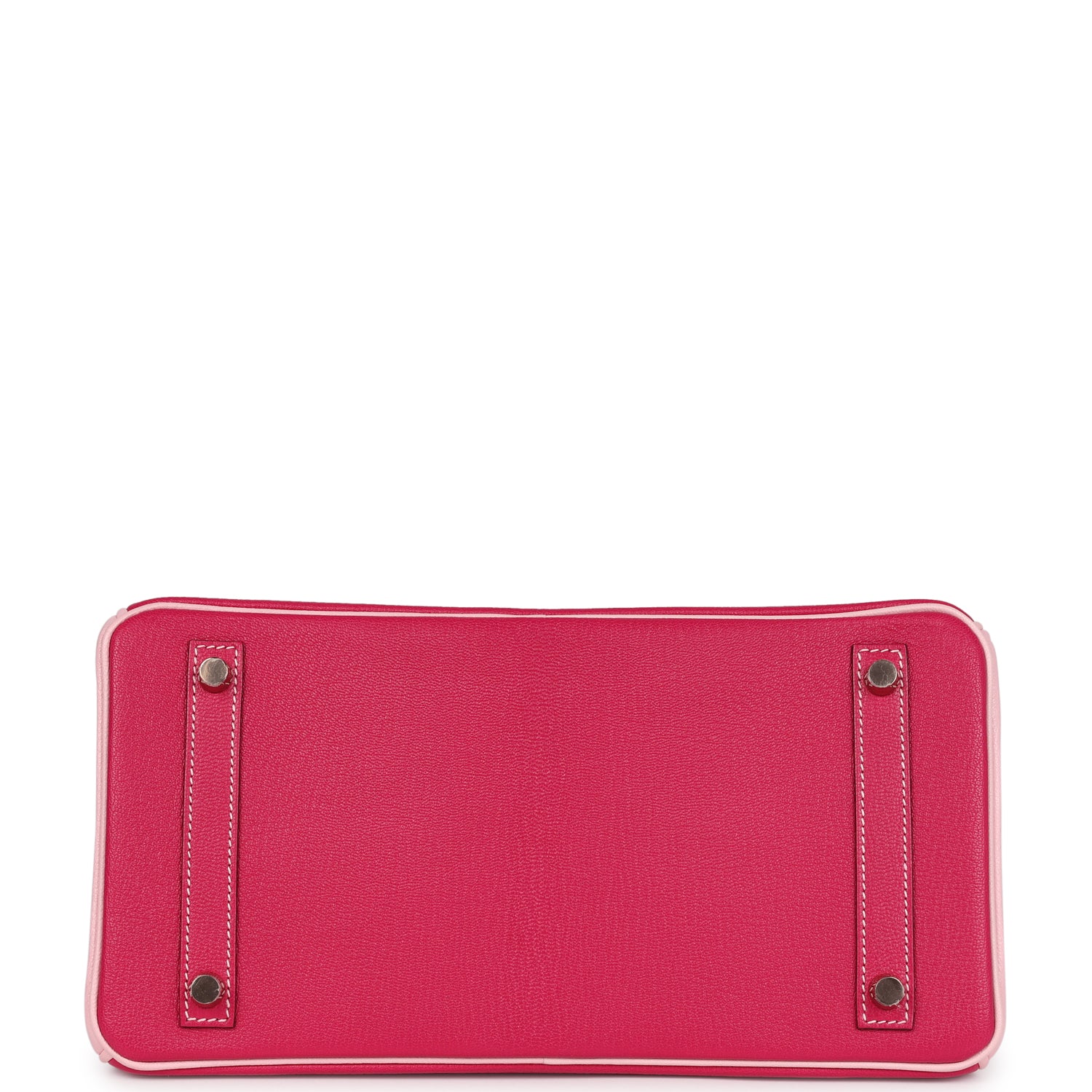 This Special Order Birkin is in Rose Mexico and Rose Sakura chevre leather with rose gold hardware and has contrast stitching, front flap, two straps with center toggle closure, clochette with lock and two keys, and double rolled handles.