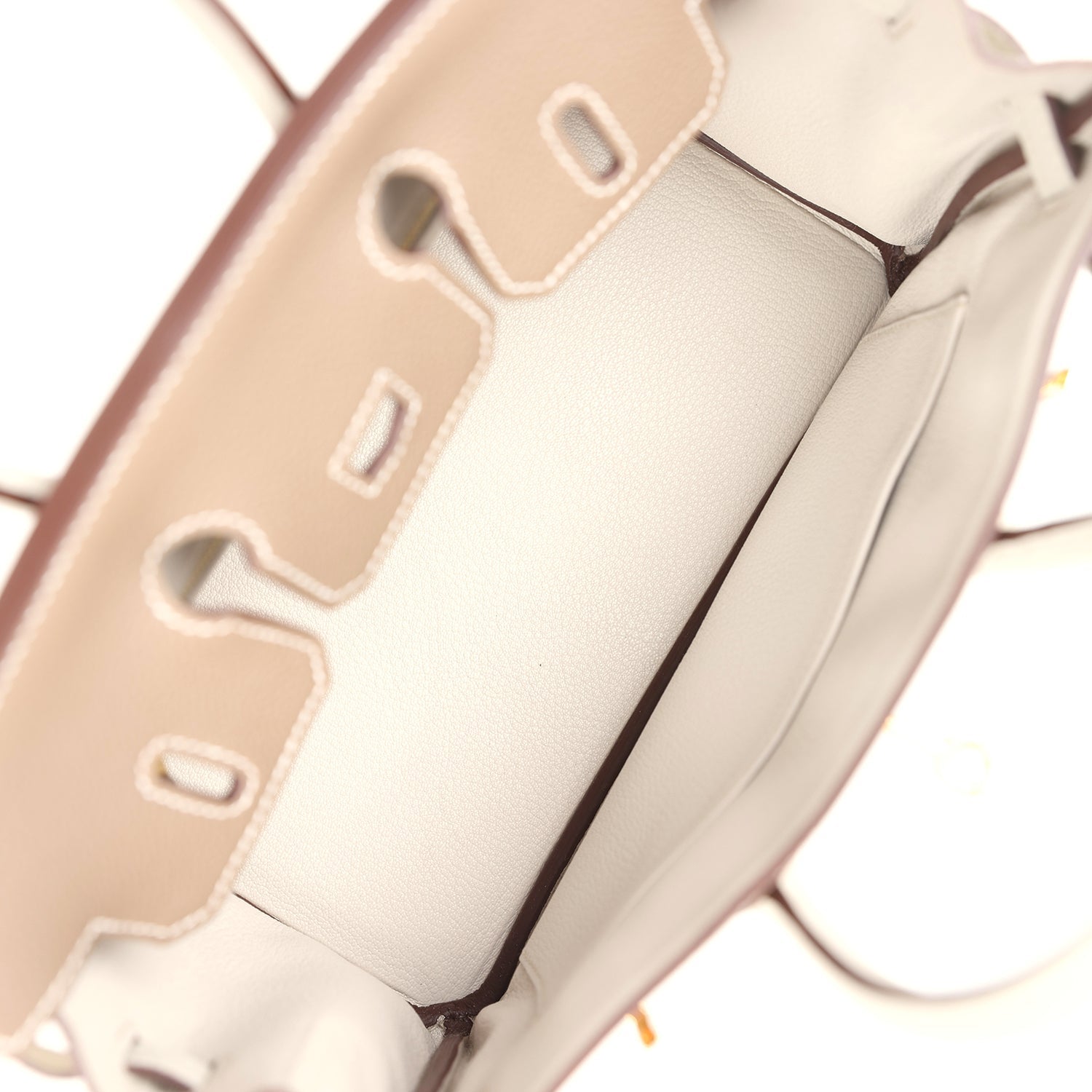 Special Order Bi-color Birkin is in Etoupe and Craie togo leather with gold hardware, has contrast and tonal stitching, front flap, two straps with center toggle closure, clochette with lock and two keys, and double rolled handles.