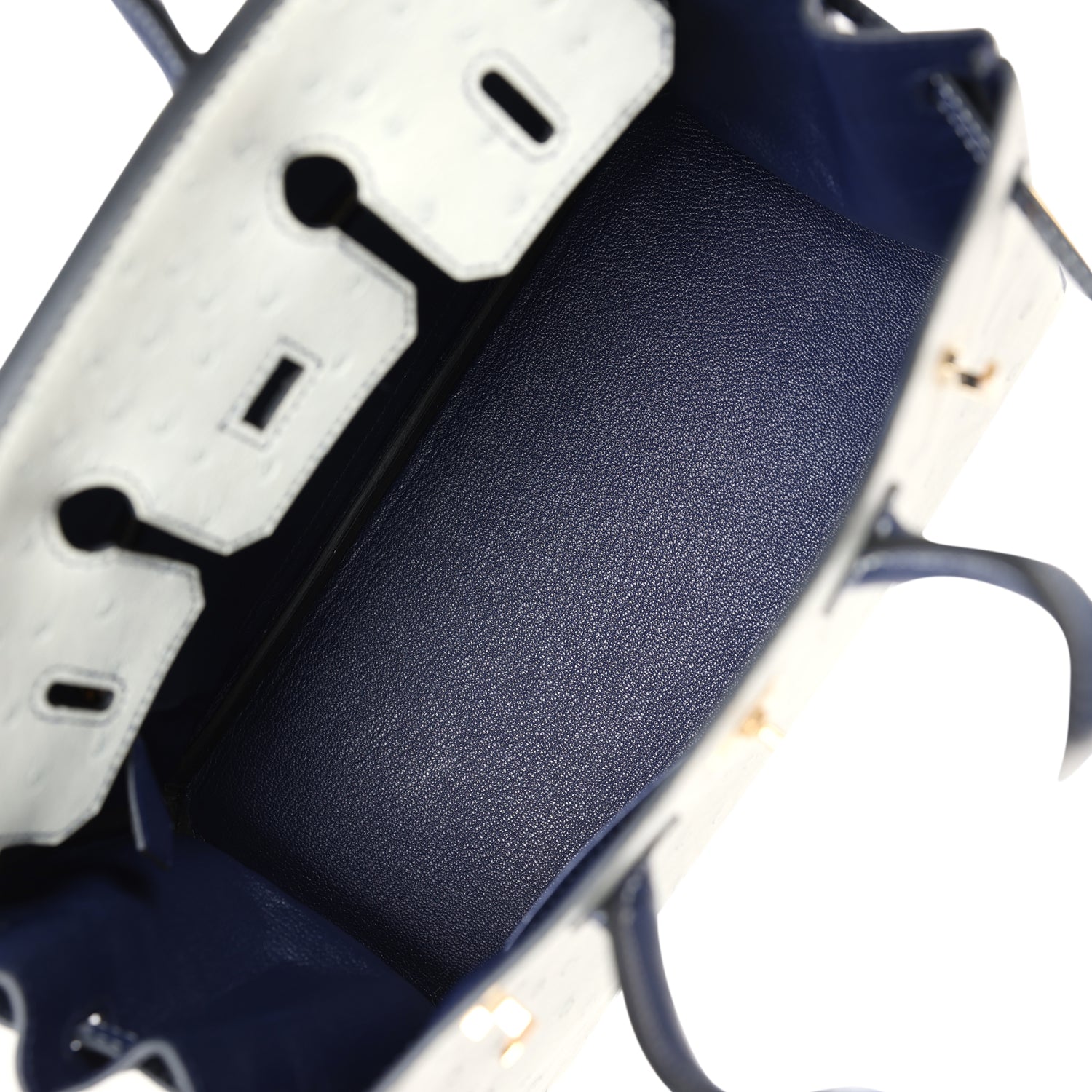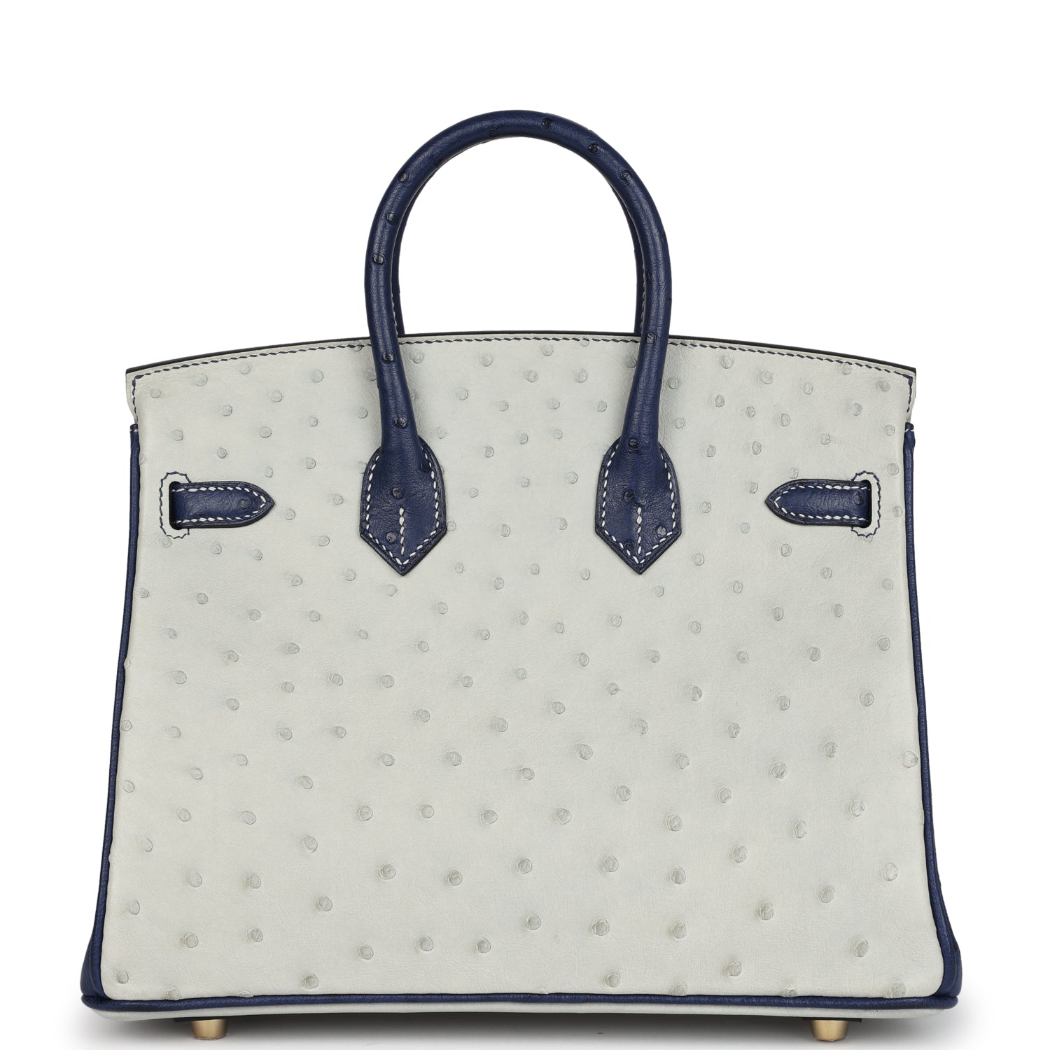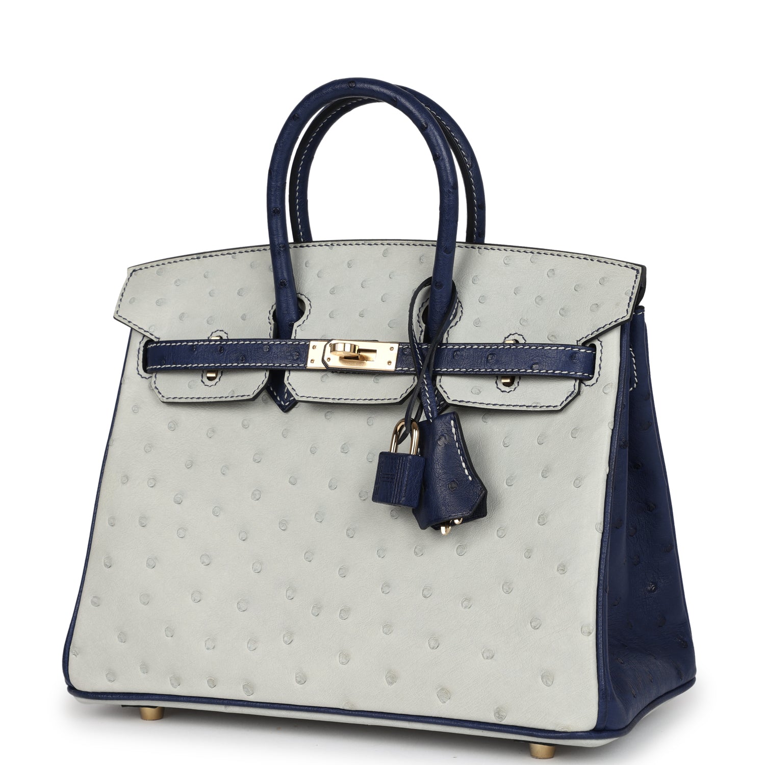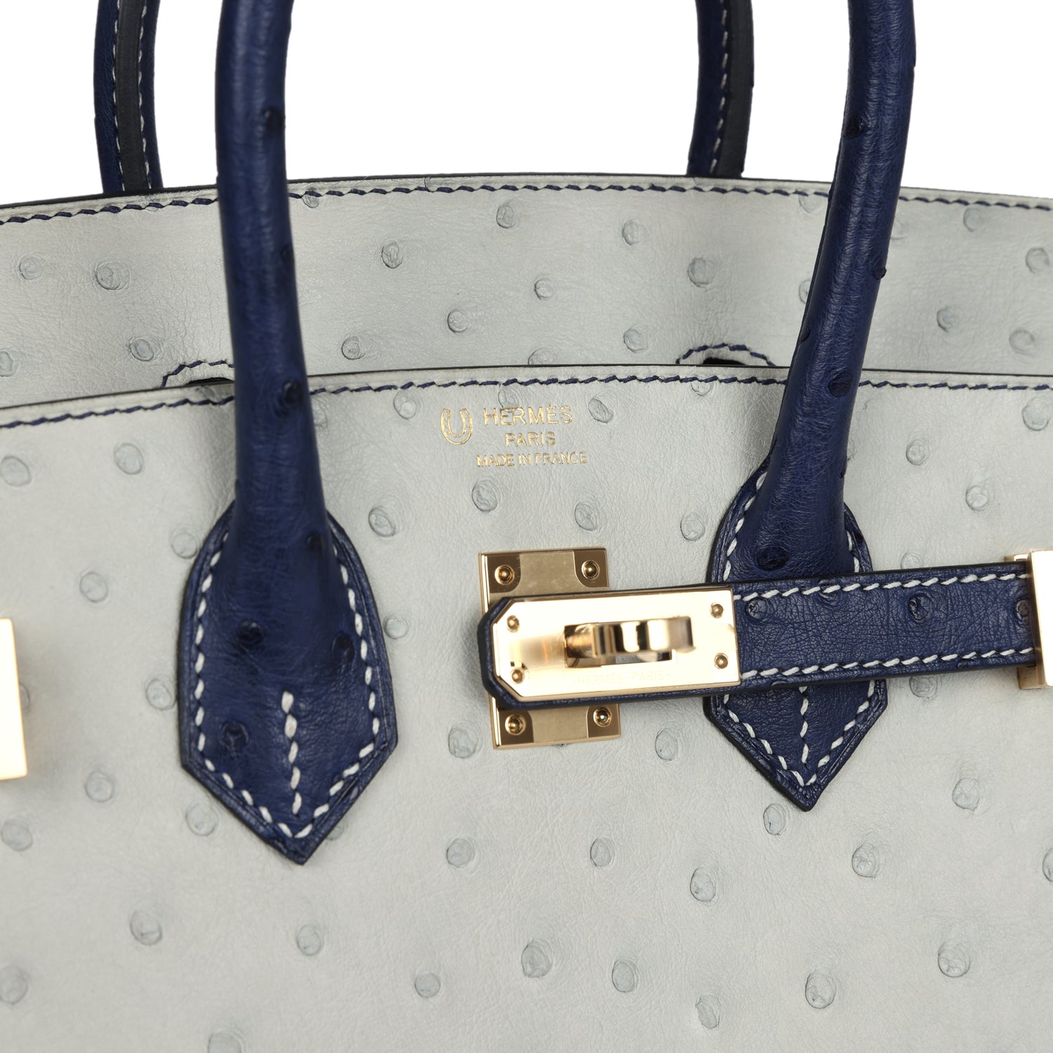 This Special Order Birkin is in Gris Perle and Bleu Iris ostrich leather with permabrass hardware, contrast stitching, front flap with two straps, front toggle closure, clochette with lock and two keys, and double rolled handles.